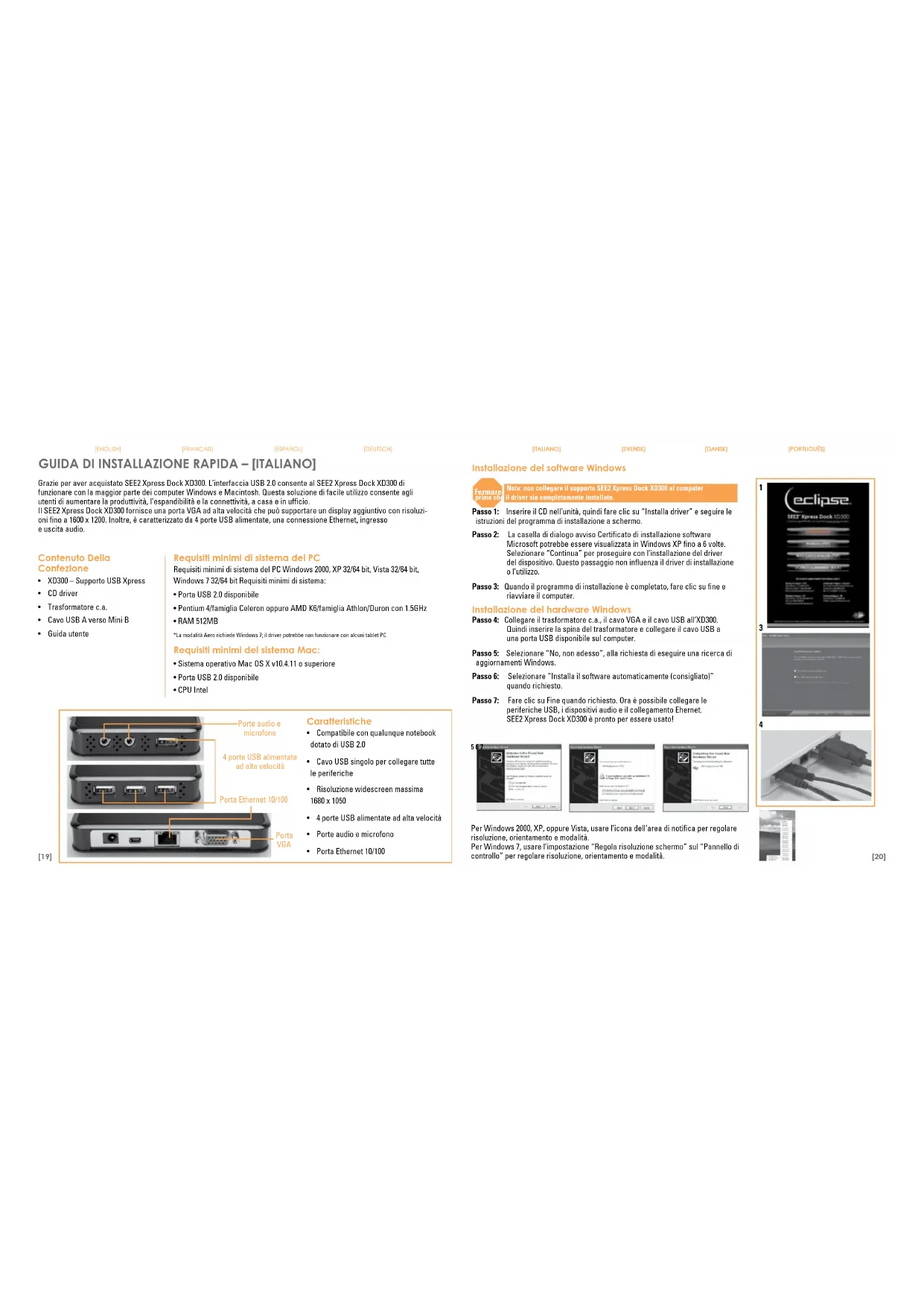 3[19] [ENGLISH] [fraNçaIS] [ESPaÑOL] [dEUtScH] [ItaLIaNO] [SVENSK] [daNSK] [POrtUGUÊS] [20] [ItaLIaNO] [SVENSK] [daNSK] [POrtUGUÊS] Fermare Installazione del software Windows Nota: non collegare il supporto SEE2 Xpress Dock XD300 al computer prima che il driver sia completamente installato. Passo 1: Inserire il CD nell’unità, quindi fare clic su “Installa driver” e seguire le istruzioni del programma di installazione a schermo. Passo 2: La casella di dialogo avviso Certificato di installazione software Microsoft potrebbe essere visualizzata in Windows XP fino a 6 volte. Selezionare “Continua” per proseguire con l’installazione del driver del dispositivo. Questo passaggio non influenza il driver di installazione o l’utilizzo. Passo 3: Quando il programma di installazione è completato, fare clic su fine e riavviare il computer. Installazione del hardware Windows Passo 4: Collegare il trasformatore c.a., il cavo VGA e il cavo USB all’XD300. Quindi inserire la spina del trasformatore e collegare il cavo USB a una porta USB disponibile sul computer. Passo 5: Selezionare “No, non adesso”, alla richiesta di eseguire una ricerca di aggiornamenti Windows. Passo 6: Selezionare “Installa il software automaticamente (consigliato)” quando richiesto. Passo 7: Fare clic su Fine quando richiesto. Ora è possibile collegare le periferiche USB, i dispositivi audio e il collegamento Ehernet. SEE2 Xpress Dock XD300 è pronto per essere usato! Grazie per aver acquistato SEE2 Xpress Dock XD300. L’interfaccia USB 2.0 consente al SEE2 Xpress Dock XD300 di funzionare con la maggior parte dei computer Windows e Macintosh. Questa soluzione di facile utilizzo consente agli utenti di aumentare la produttività, l’espandibilità e la connettività, a casa e in ufficio. Il SEE2 Xpress Dock XD300 fornisce una porta VGA ad alta velocità che può supportare un display aggiuntivo con risoluzi- oni fino a 1600 x 1200. Inoltre, è caratterizzato da 4 porte USB alimentate, una connessione Ethernet, ingresso e uscita audio. Contenuto Della Confezione