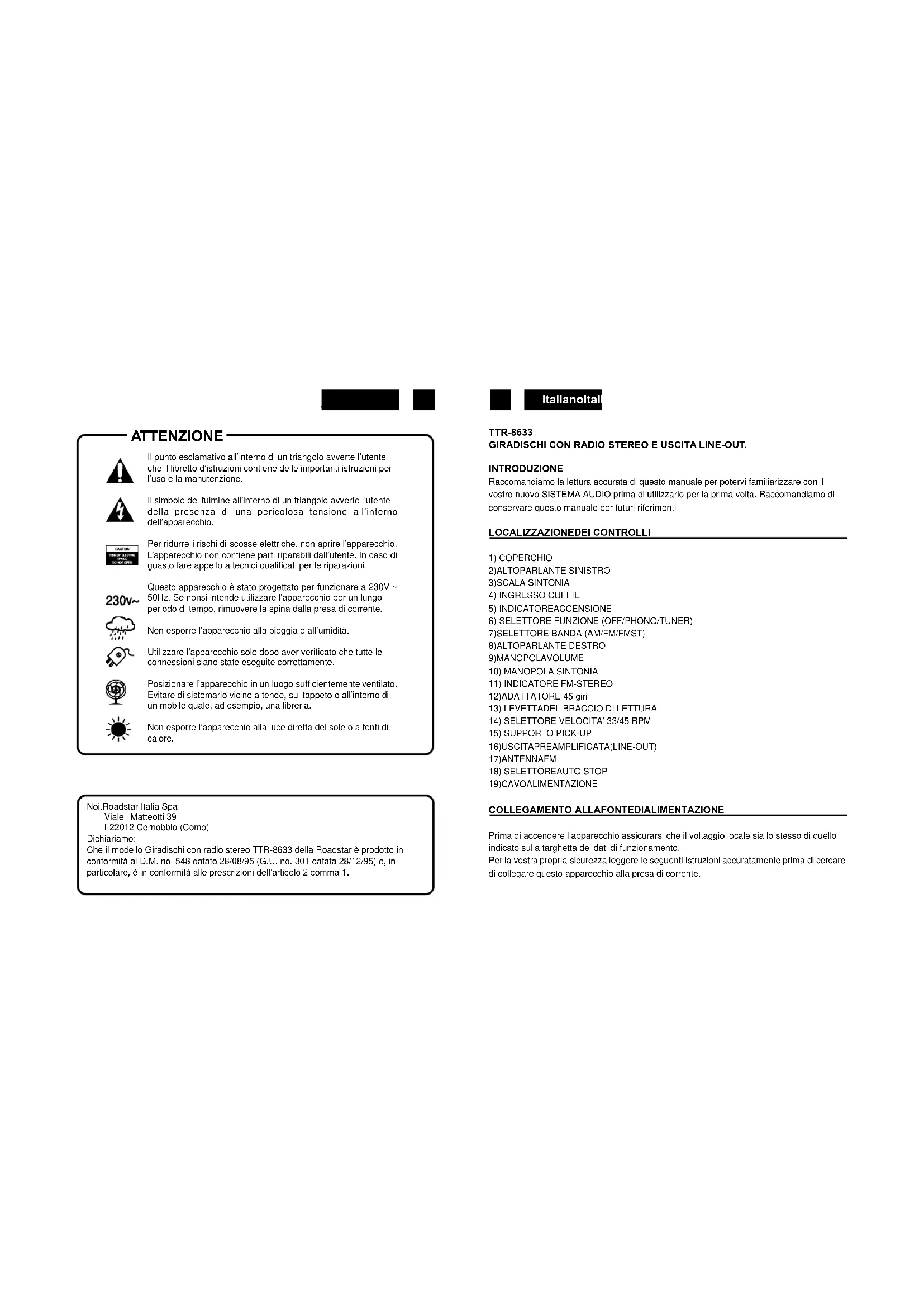 19)CAVOALIMENTAZIONE COLLEGAMENTO ALLAFONTEDIALIMENTAZIONE Prima di accendere l’apparecchio assicurarsi che il voltaggio locale sia lo stesso di quello indicato sulla targhetta dei dati di funzionamento. Per la vostra propria sicurezza leggere le seguenti istruzioni accuratamente prima di cercare di collegare questo apparecchio alla presa di corrente. Il punto esclamativo all’interno di un triangolo avverte l’utente che il libretto d’istruzioni contiene delle importanti istruzioni per l’uso e la manutenzione. Il simbolo del fulmine all’interno di un triangolo avverte l’utente della presenza di una pericolosa tensione all’interno dell’apparecchio. Per ridurre i rischi di scosse elettriche, non aprire l’apparecchio. L’apparecchio non contiene parti riparabili dall’utente. In caso di guasto fare appello a tecnici qualificati per le riparazioni. Questo apparecchio è stato progettato per funzionare a 230V ~ 50Hz. Se nonsi intende utilizzare l’apparecchio per un lungo periodo di tempo, rimuovere la spina dalla presa di corrente. Non esporre l’apparecchio alla pioggia o all’umidità. Utilizzare l’apparecchio solo dopo aver verificato che tutte le connessioni siano state eseguite correttamente. Posizionare l’apparecchio in un luogo sufficientemente ventilato. Evitare di sistemarlo vicino a tende, sul tappeto o all’interno di un mobile quale, ad esempio, una libreria. Non esporre l’apparecchio alla luce diretta del sole o a fonti di calore. Noi.Roadstar Italia Spa Viale Matteotti 39 I-22012 Cernobbio (Como) Dichiariamo: Che il modello Giradischi con radio stereo TTR-8633 della Roadstar è prodotto in conformità al D.M. no. 548 datato 28/08/95 (G.U. no. 301 datata 28/12/95) e, in particolare, è in conformità alle prescrizioni dell’articolo 2 comma 1. ATTENZIONEItalianoItaliano 21 22 FUNZIONAMENTOA CA Questo apparecchio è stato progettato per funzionare solo con una fonte di alimentazione di AC 230V 50Hz. Il collegamento ad un atro tipo di fonte di alimentazione potrebbe danneggiare l’apparecchio. Attenzione Per prevenire le scariche elettriche, scollegare la spina prima di rimuovere il coperchio. Fare riferimento al personale di un centro di servizi qualificato. Precauzioni di Sicurezza Non esporre l’apparecchio alla pioggia o all’umidità. Fonte di Alimentazione Principale: solo AC 230V / 50Hz - AC Questo simbolo significa che questo apparecchio è doppiamente isolato. Non è richiesto un collegamento a terra. ALIMENTAZIONE Rimuovere accuratamente l’apparecchio dalla scatola, conservare l’imballaggio per un futuro uso. Leggere accuratamente queste istruzioni prima dell’uso. ALIMENTAZIONECA Collegare il cavo elettrico alla presa di corrente AC. Controllare che la vostra fonte di ali- mentazione sia di 230V, 50 Hz.
