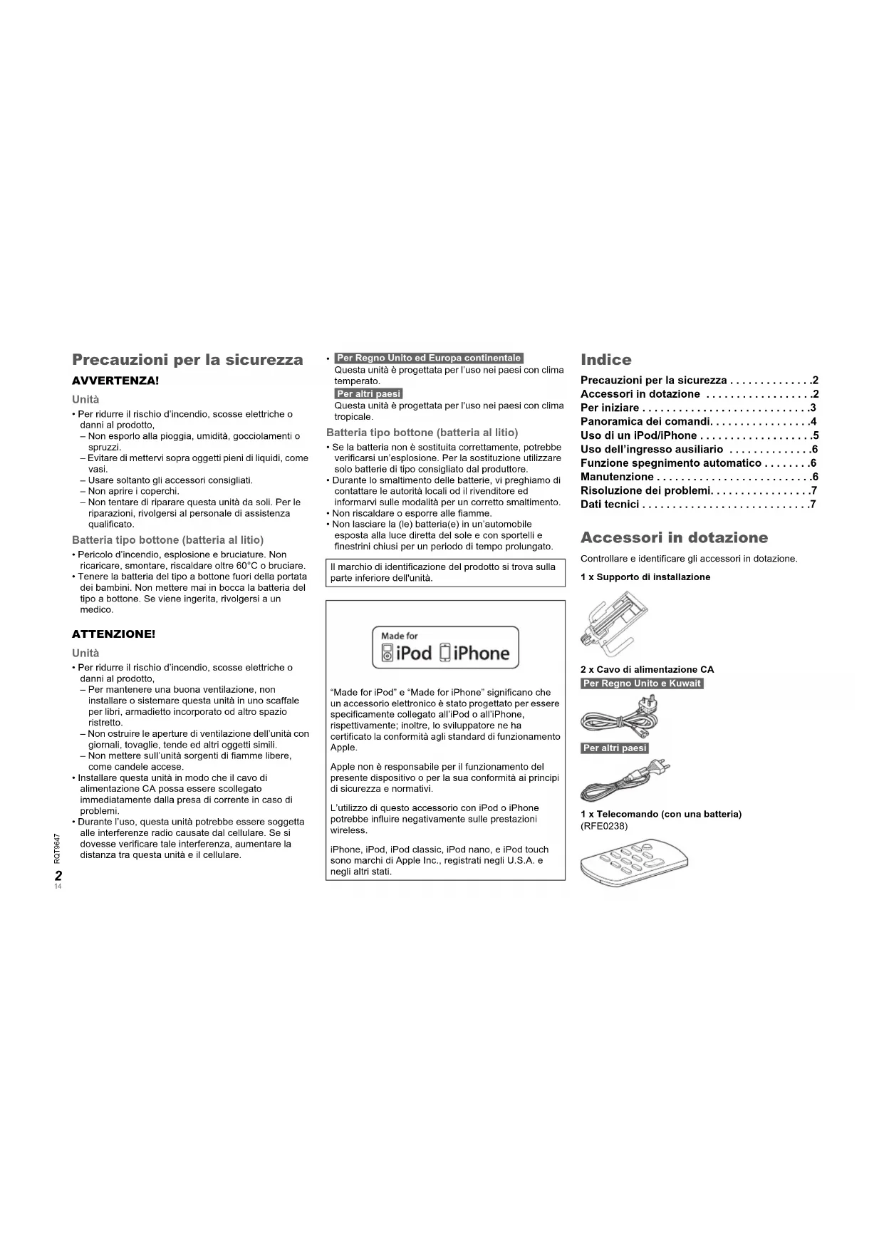 - Non lasciare la (le) batteria(e) in un’automobile esposta alla luce diretta del sole e con sportelli e finestrini chiusi per un periodo di tempo prolungato. Indice Precauzioni per la sicurezza . . . . . . . . . . . . . .2 Accessori in dotazione . . . . . . . . . . . . . . . . . .2 Per iniziare . . . . . . . . . . . . . . . . . . . . . . . . . . . .3 Panoramica dei comandi. . . . . . . . . . . . . . . . .4 Uso di un iPod/iPhone . . . . . . . . . . . . . . . . . . .5 Uso dell’ingresso ausiliario . . . . . . . . . . . . . .6 Funzione spegnimento automatico . . . . . . . .6 Manutenzione . . . . . . . . . . . . . . . . . . . . . . . . . .6 Risoluzione dei problemi. . . . . . . . . . . . . . . . .7 Dati tecnici . . . . . . . . . . . . . . . . . . . . . . . . . . . .7 Accessori in dotazione Controllare e identificare gli accessori in dotazione. 1 x Supporto di installazione 2 x Cavo di alimentazione CA Per Regno Unito e Kuwait Per altri paesi 1 x Telecomando (con una batteria) (RFE0238) Il marchio di identificazione del prodotto si trova sulla parte inferiore dell'unità. “Made for iPod” e “Made for iPhone” significano che un accessorio elettronico è stato progettato per essere specificamente collegato all’iPod o all’iPhone, rispettivamente; inoltre, lo sviluppatore ne ha certificato la conformità agli standard di funzionamento Apple. Apple non è responsabile per il funzionamento del presente dispositivo o per la sua conformità ai principi di sicurezza e normativi. L’utilizzo di questo accessorio con iPod o iPhone potrebbe influire negativamente sulle prestazioni wireless. iPhone, iPod, iPod classic, iPod nano, e iPod touch sono marchi di Apple Inc., registrati negli U.S.A. e negli altri stati.