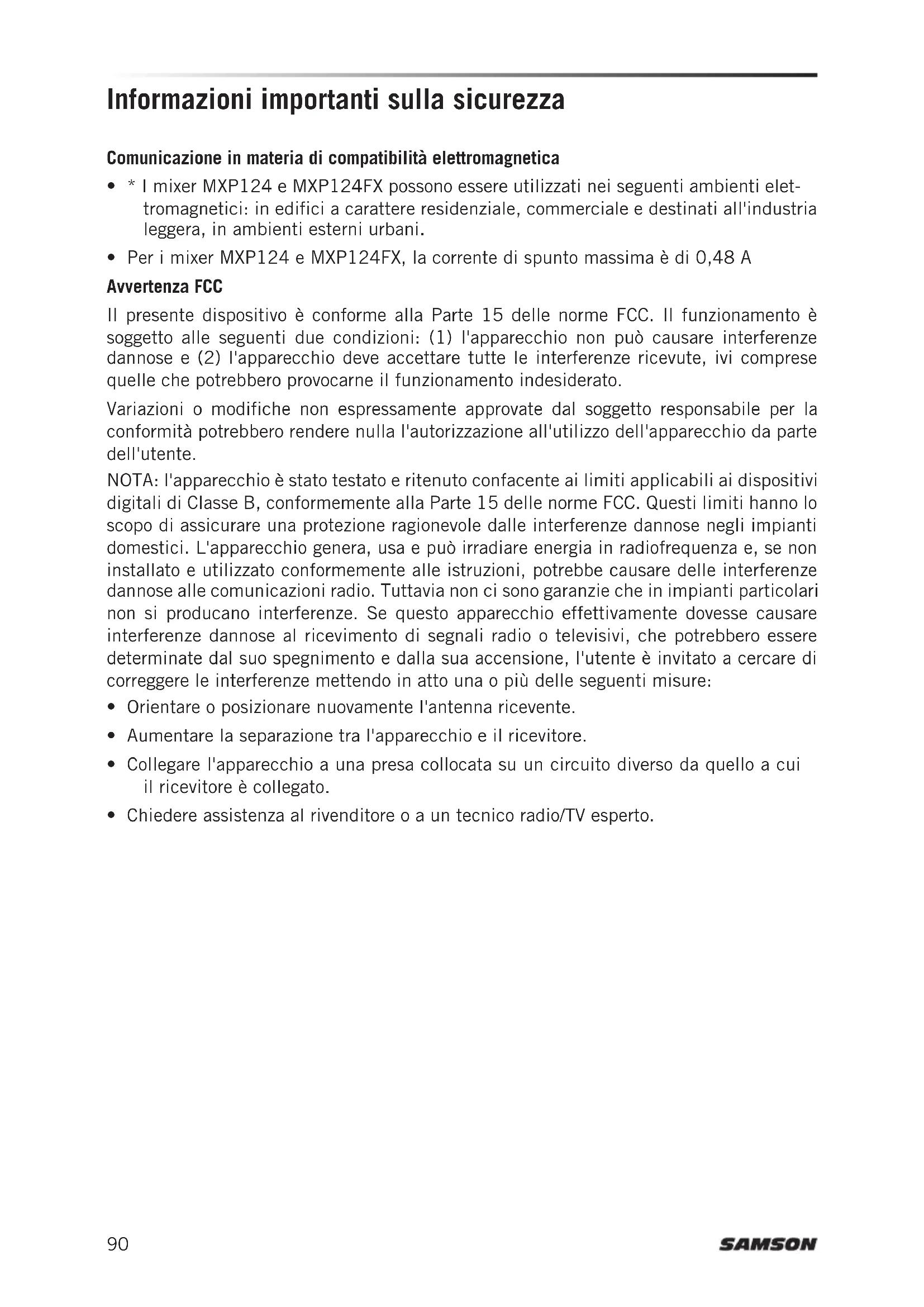 - Per i mixer MXP124 e MXP124FX, la corrente di spunto massima è di 0,48 A Avvertenza FCC Il presente dispositivo è conforme alla Parte 15 delle norme FCC. Il funzionamento è soggetto alle seguenti due condizioni: (1) l'apparecchio non può causare interferenze dannose e (2) l'apparecchio deve accettare tutte le interferenze ricevute, ivi comprese quelle che potrebbero provocarne il funzionamento indesiderato. Variazioni o modifiche non espressamente approvate dal soggetto responsabile per la conformità potrebbero rendere nulla l'autorizzazione all'utilizzo dell'apparecchio da parte dell'utente. NOTA: l'apparecchio è stato testato e ritenuto confacente ai limiti applicabili ai dispositivi digitali di Classe B, conformemente alla Parte 15 delle norme FCC. Questi limiti hanno lo scopo di assicurare una protezione ragionevole dalle interferenze dannose negli impianti domestici. L'apparecchio genera, usa e può irradiare energia in radiofrequenza e, se non installato e utilizzato conformemente alle istruzioni, potrebbe causare delle interferenze dannose alle comunicazioni radio. Tuttavia non ci sono garanzie che in impianti particolari non si producano interferenze. Se questo apparecchio effettivamente dovesse causare interferenze dannose al ricevimento di segnali radio o televisivi, che potrebbero essere determinate dal suo spegnimento e dalla sua accensione, l'utente è invitato a cercare di correggere le interferenze mettendo in atto una o più delle seguenti misure: