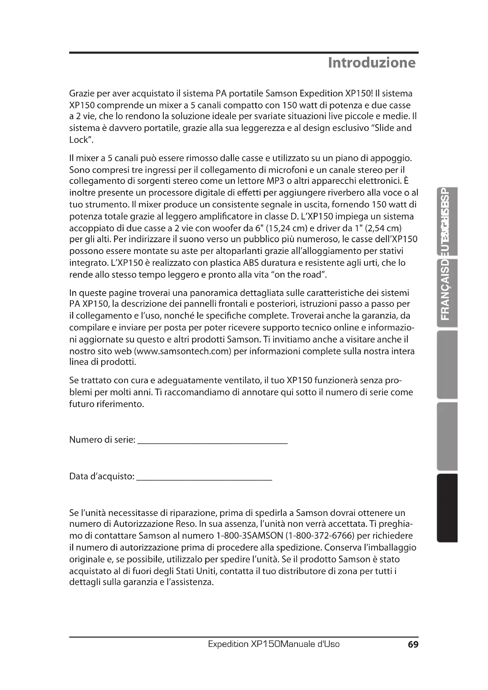 In queste pagine troverai una panoramicica dettagliata sulle caratteristiche dei sistemi PA XP150, la descrizione dei pannelli frontali e posteriori, istruzioni passo a passo per il collegamento e l'uso, nonché le specifiche complete. Troveraianche la garanzia, da compiling e inviare per posta per poter ricevere supporto technique online e informazioni aggiornate su quello e altri prodotti Samson. Ti Invitationamo anche a visitare ancile nonzero site web (www.samsontech.com) per informazioni complete sulla nostra intera linea di prodotti.