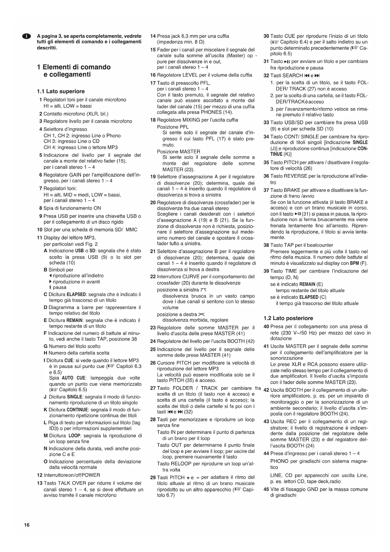 I Dicitura CUE: si vede quando illettore MP3 e in pausa sul punto cue (Capitoli 6.3 e 6.5) Spia AUTO CUE: lampeggia due volte quando un punto cue viene memorizzato (Capitolo 6.5)