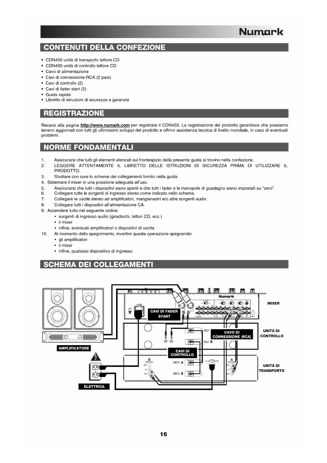CDN450 unità di transporto lettore CD CDN450 unità di controllo lettore CD Cavo di alimentazione Cavi di connessione RCA (2 paia) Cavi di controllo (2) Cavi di fader start (2) Guida rapida Libretto di istruzioni di sicurezza e garanzia REGISTRAZIONE Recarsi alla pagina http://www.numark.com per registrare il CDN450. La registrazione del prodotto garantisce che possiamo tenervi aggiornati con tutti gli ultimissimi sviluppi del prodotto e offrirvi assistenza tecnica di livello mondiale, in caso di eventuali problemi. NORME FONDAMENTALI
