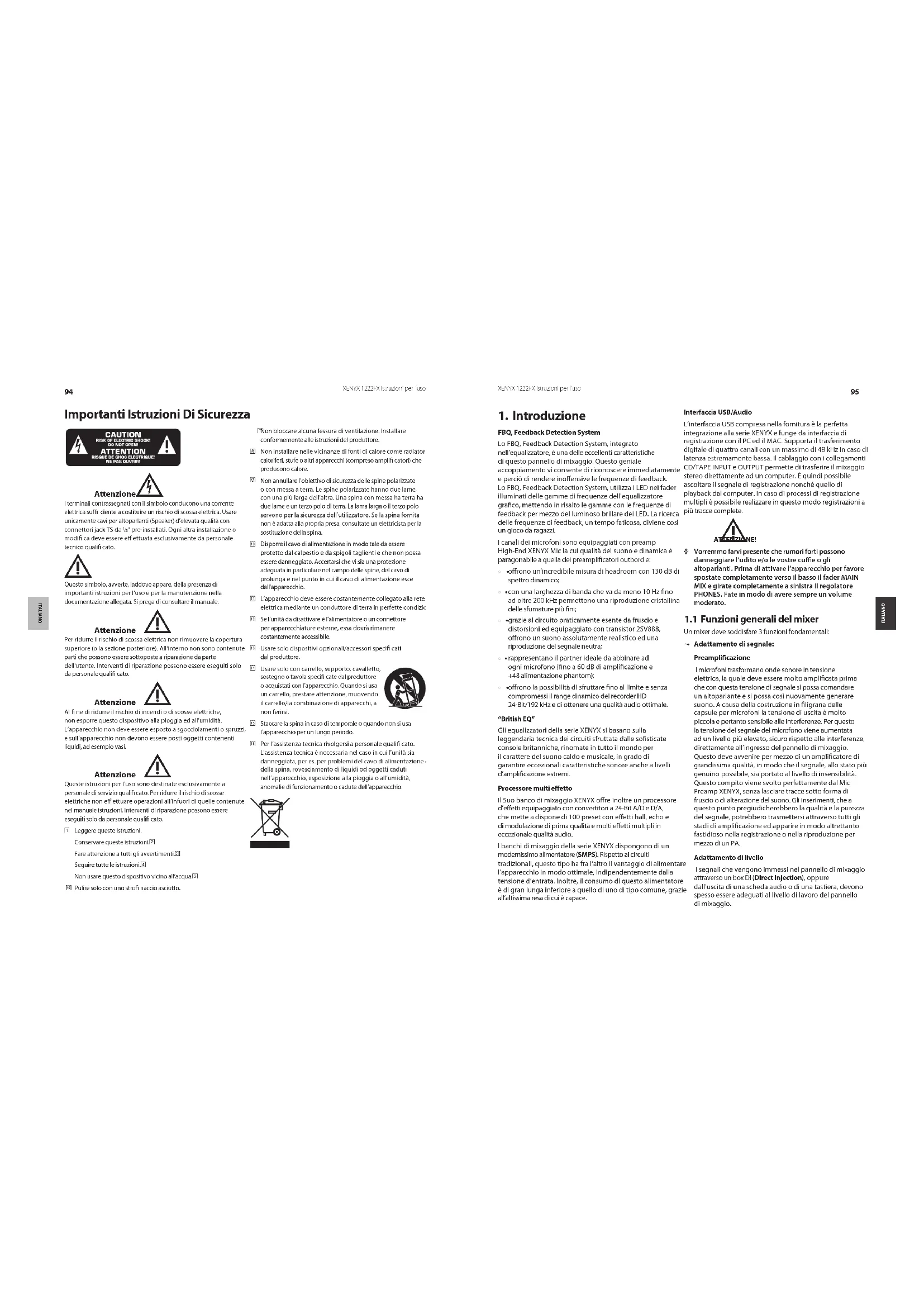 ITALIANOXENYX 1222FX Istruzioni per l’uso Attenzione* I terminali contrassegnati con il simbolo conducono una corrente elettrica suffi ciente a costituire un rischio di scossa elettrica. Usare unicamente cavi per altoparlanti (Speaker) d’elevata qualità con connettori jack TS da ¼" pre-installati. Ogni altra installazione o modifi ca deve essere eff ettuata esclusivamente da personale tecnico qualifi cato. Questo simbolo, avverte, laddove appare, della presenza di importanti istruzioni per l‘uso e per la manutenzione nella documentazione allegata. Si prega di consultare il manuale. Attenzione ! Per ridurre il rischio di scossa elettrica non rimuovere la copertura superiore (o la sezione posteriore). All‘interno non sono contenute parti che possono essere sottoposte a riparazione da parte dell‘utente. Interventi di riparazione possono essere eseguiti solo da personale qualifi cato. Attenzione ! Al fi ne di ridurre il rischio di incendi o di scosse elettriche, non esporre questo dispositivo alla pioggia ed all’umidità. L’apparecchio non deve essere esposto a sgocciolamenti o spruzzi, e sull’apparecchio non devono essere posti oggetti contenenti liquidi, ad esempio vasi. Attenzione ! Queste istruzioni per l’uso sono destinate esclusivamente a personale di servizio qualifi cato. Per ridurre il rischio di scosse elettriche non eff ettuare operazioni all’infuori di quelle contenute nel manuale istruzioni. Interventi di riparazione possono essere eseguiti solo da personale qualifi cato.Leggere queste istruzioni.[1] Conservare queste istruzioni.[2] Fare attenzione a tutti gli avvertimenti.[3] Seguire tutte le istruzioni.[4] Non usare questo dispositivo vicino all’acqua.[5] Pulire solo con uno strofi naccio asciutto.[6] Non bloccare alcuna fessura di ventilazione. Installare [7] conformemente alle istruzioni del produttore.Non installare nelle vicinanze di fonti di calore come radiatori, [8] caloriferi, stufe o altri apparecchi (compreso amplifi catori) che producono calore.Non annullare l’obiettivo di sicurezza delle spine polarizzate [9] o con messa a terra. Le spine polarizzate hanno due lame, con una più larga dell’altra. Una spina con messa ha terra ha due lame e un terzo polo di terra. La lama larga o il terzo polo servono per la sicurezza dell’utilizzatore. Se la spina fornita non è adatta alla propria presa, consultate un elettricista per la sostituzione della spina.Disporre il cavo di alimentazione in modo tale da essere {10} protetto dal calpestio e da spigoli taglienti e che non possa essere danneggiato. Accertarsi che vi sia una protezione adeguata in particolare nel campo delle spine, del cavo di prolunga e nel punto in cui il cavo di alimentazione esce dall'apparecchio.L’apparecchio deve essere costantemente collegato alla rete {11} elettrica mediante un conduttore di terra in perfette condizioni. Se l’unità da disattivare è l’alimentatore o un connettore {12} per apparecchiature esterne, essa dovrà rimanere costantemente accessibile.Usare solo dispositivi opzionali/accessori specifi cati {13} dal produttore.Usare solo con carrello, supporto, cavalletto, {14} sostegno o tavola specifi cate dal produttore o acquistati con l’apparecchio. Quando si usa un carrello, prestare attenzione, muovendo il carrello/la combinazione di apparecchi, a non ferirsi. Staccare la spina in caso di temporale o quando non si usa {15} l’apparecchio per un lungo periodo.Per l’assistenza tecnica rivolgersi a personale qualifi cato. {16} L'assistenza tecnica è necessaria nel caso in cui l’unità sia danneggiata, per es. per problemi del cavo di alimentazione o della spina, rovesciamento di liquidi od oggetti caduti nell’apparecchio, esposizione alla pioggia o all’umidità, anomalie di funzionamento o cadute dell’apparecchio.
