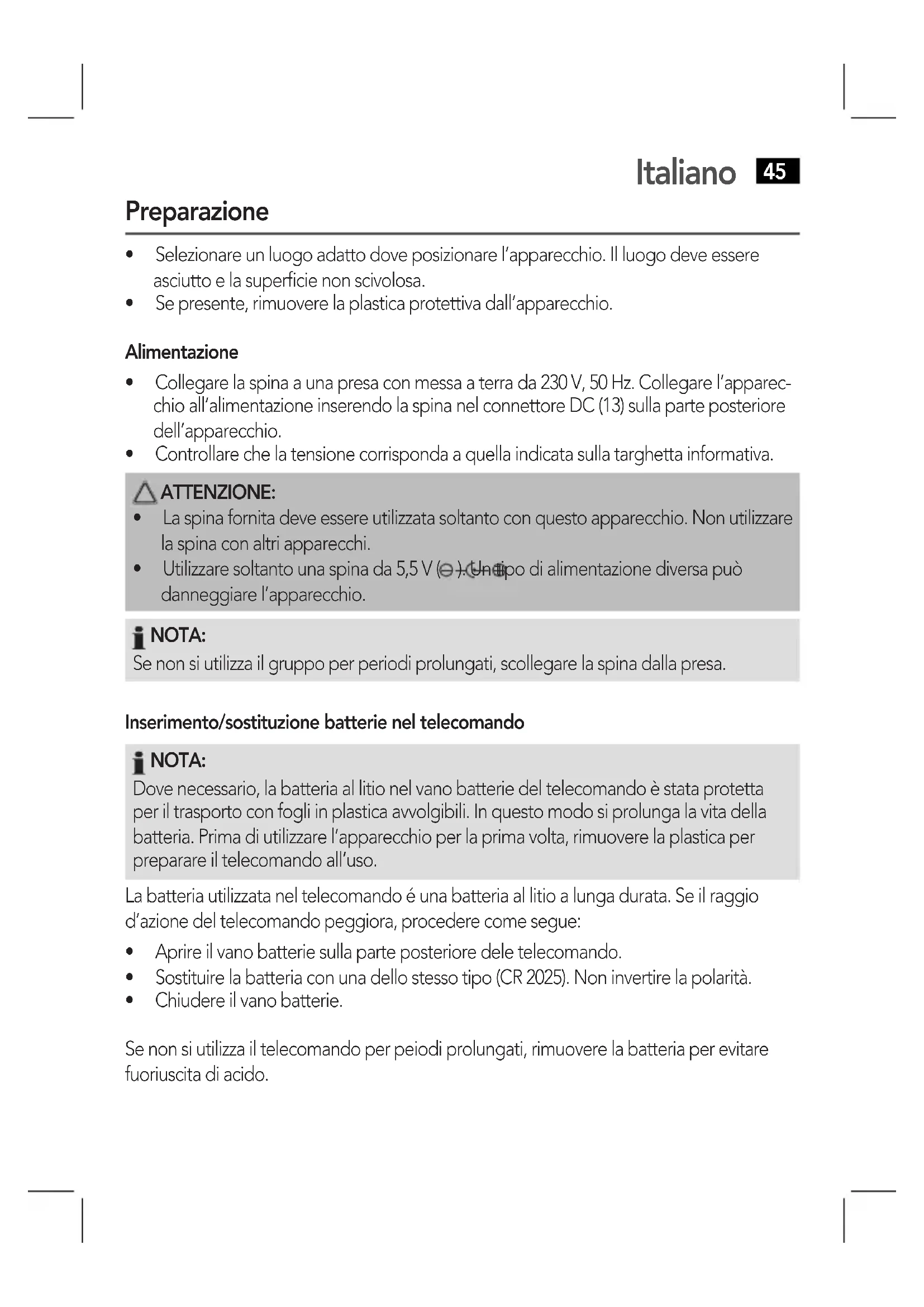 Se non si utilizes il telecomando per peiodi prolongati, rimuovere la batteria per evitare fuoriuscita di acido.