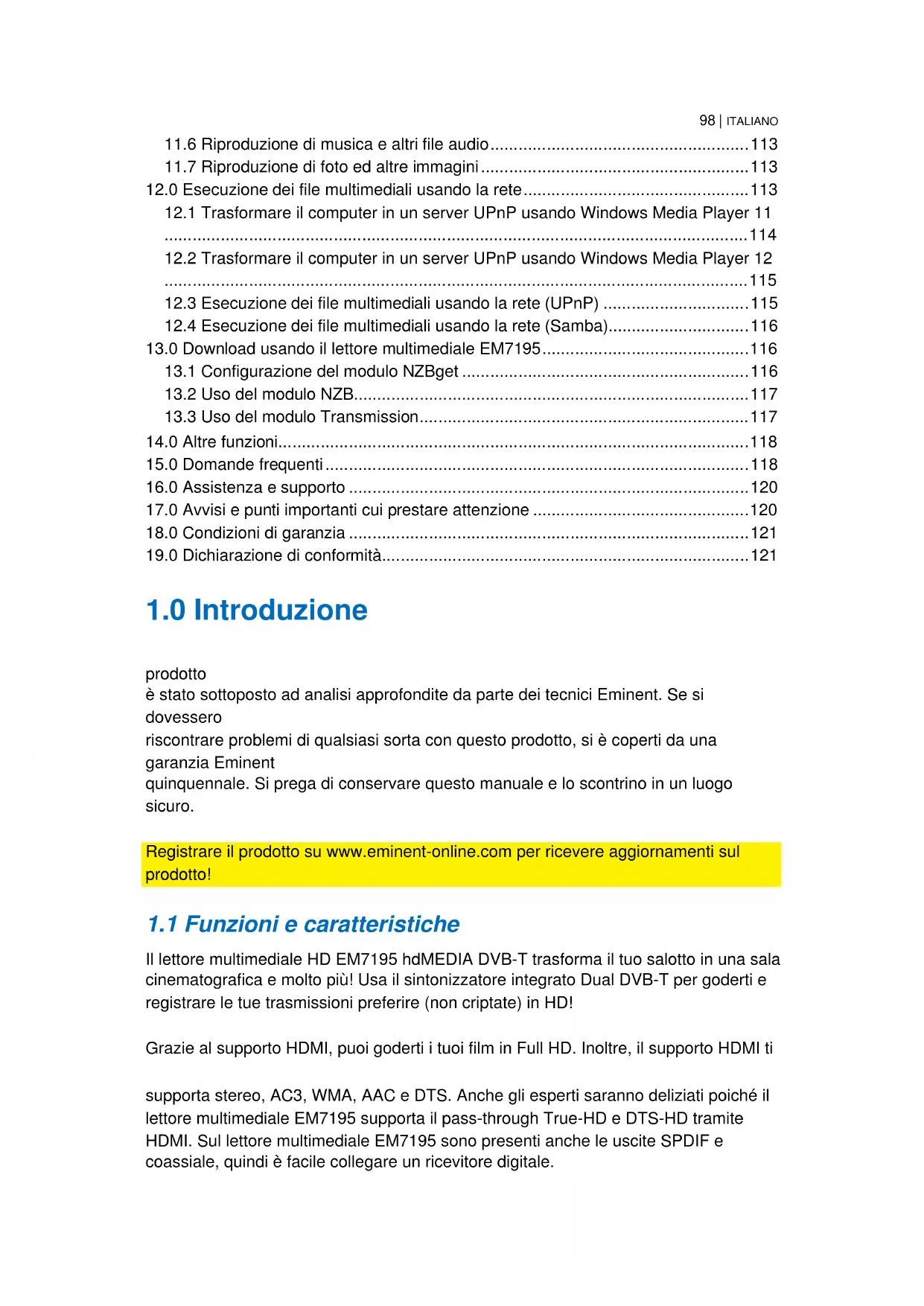 Scarica le istruzioni per il tuo Lettore multimediale in formato PDF gratuitamente! Trova il tuo manuale EM7195 - Eminent e riprendi in mano il tuo dispositivo elettronico. In questa pagina sono pubblicati tutti i documenti necessari per l'utilizzo del tuo dispositivo. EM7195 del marchio Eminent.
