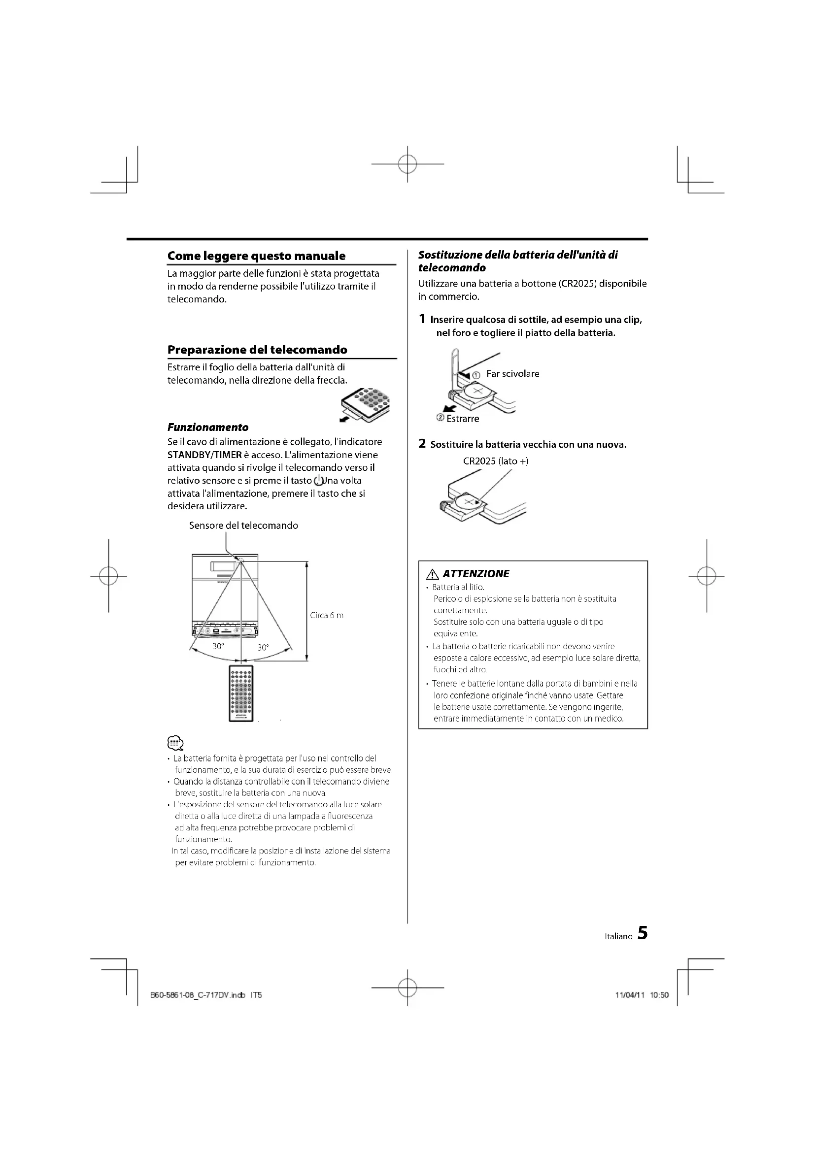 - Batteria al litio.Pericolo di esplosione se la batteria non è sostituita correttamente.Sostituire solo con una batteria uguale o di tipo equivalente.• La batteria o batterie ricaricabili non devono venire esposte a calore eccessivo, ad esempio luce solare diretta, fuochi ed altro.• Tenere le batterie lontane dalla portata di bambini e nella loro confezione originale finché vanno usate. Gettare le batterie usate correttamente. Se vengono ingerite, entrare immediatamente in contatto con un medico. Sostituzione della batteria dell'unità di telecomando Utilizzare una batteria a bottone (CR2025) disponibile in commercio. 1 Inserire qualcosa di sottile, ad esempio una clip, nel foro e togliere il piatto della batteria.Far scivolareEstrarre 2 Sostituire la batteria vecchia con una nuova. CR2025 (lato +) Come leggere questo manuale La maggior parte delle funzioni è stata progettata in modo da renderne possibile l'utilizzo tramite il telecomando.