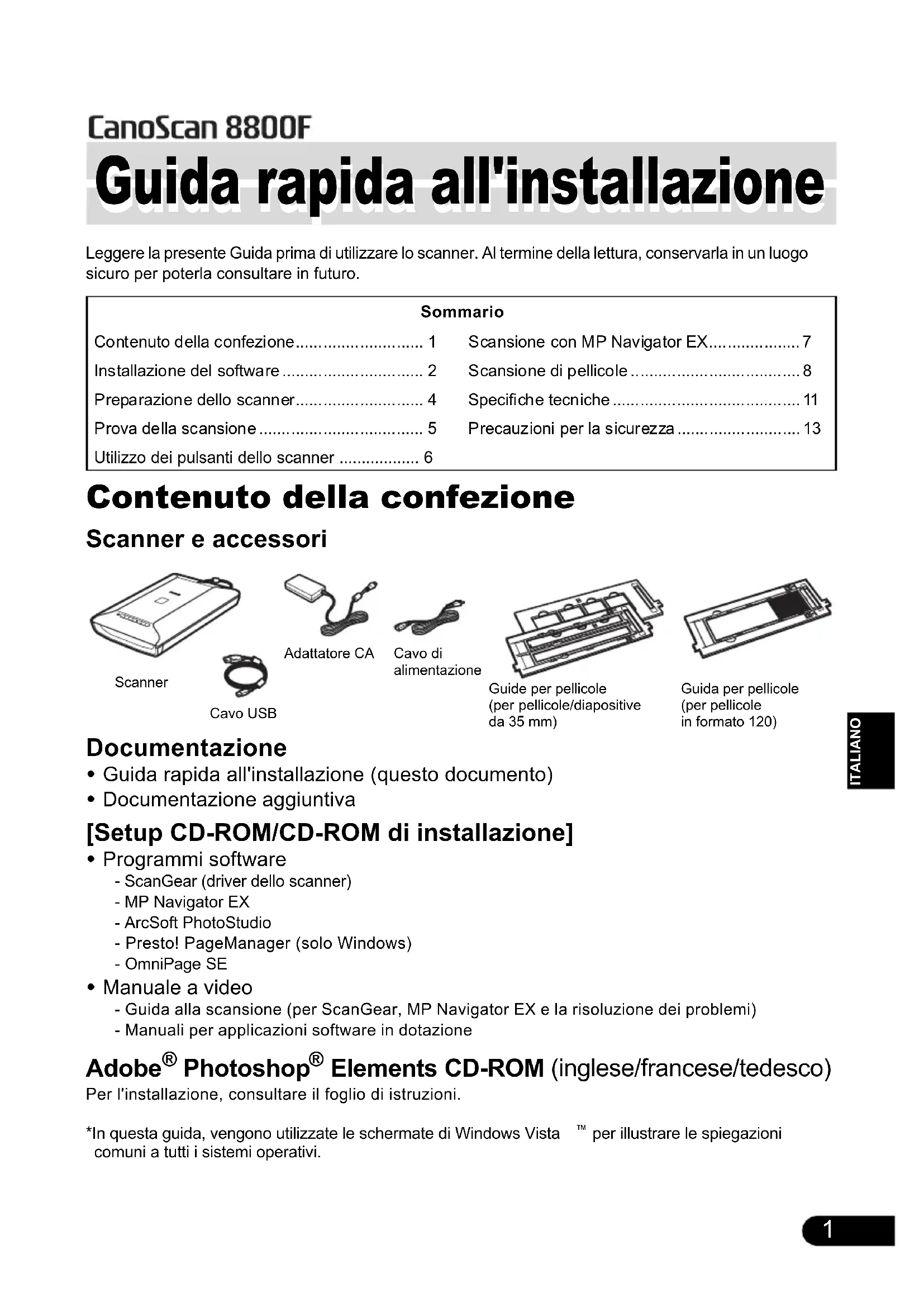 - Elements CD-ROM (inglese/francese/tedesco) Per l'installazione, consultare il foglio di istruzioni.*In questa guida, vengono utilizzate le schermate di Windows Vista per illustrare le spiegazioni comuni a tutti i sistemi operativi.Sommario Contenuto della confezione p. 1