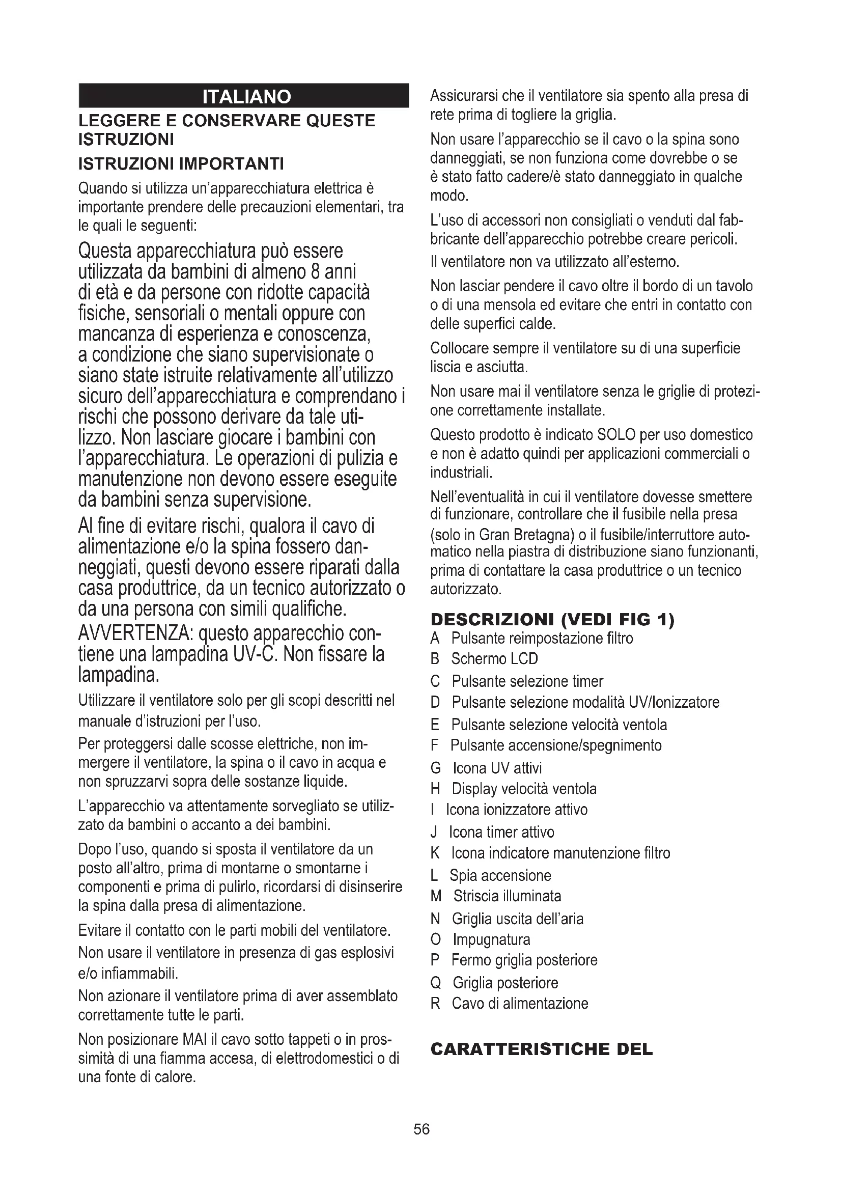 ISTRUZIONI ISTRUZIONI IMPORTANTI Quando si utilizza un’apparecchiatura elettrica è importante prendere delle precauzioni elementari, tra le quali le seguenti: Questa apparecchiatura può essere utilizzata da bambini di almeno 8 anni di età e da persone con ridotte capacità siche, sensoriali o mentali oppure con mancanza di esperienza e conoscenza, a condizione che siano supervisionate o siano state istruite relativamente all’utilizzo sicuro dell’apparecchiatura e comprendano i rischi che possono derivare da tale uti- lizzo. Non lasciare giocare i bambini con l’apparecchiatura. Le operazioni di pulizia e manutenzione non devono essere eseguite da bambini senza supervisione. Al ne di evitare rischi, qualora il cavo di alimentazione e/o la spina fossero dan- neggiati, questi devono essere riparati dalla casa produttrice, da un tecnico autorizzato o da una persona con simili qualiche. AVVERTENZA: questo apparecchio con- tiene una lampadina UV-C. Non ssare la lampadina. Utilizzare il ventilatore solo per gli scopi descritti nel manuale d’istruzioni per l’uso. Per proteggersi dalle scosse elettriche, non im- mergere il ventilatore, la spina o il cavo in acqua e non spruzzarvi sopra delle sostanze liquide. L’apparecchio va attentamente sorvegliato se utiliz- zato da bambini o accanto a dei bambini. Dopo l’uso, quando si sposta il ventilatore da un posto all’altro, prima di montarne o smontarne i componenti e prima di pulirlo, ricordarsi di disinserire la spina dalla presa di alimentazione. Evitare il contatto con le parti mobili del ventilatore. Non usare il ventilatore in presenza di gas esplosivi e/o inammabili. Non azionare il ventilatore prima di aver assemblato correttamente tutte le parti. Non posizionare MAI il cavo sotto tappeti o in pros- simità di una amma accesa, di elettrodomestici o di una fonte di calore. Assicurarsi che il ventilatore sia spento alla presa di rete prima di togliere la griglia. Non usare l’apparecchio se il cavo o la spina sono danneggiati, se non funziona come dovrebbe o se è stato fatto cadere/è stato danneggiato in qualche modo. L’uso di accessori non consigliati o venduti dal fab- bricante dell’apparecchio potrebbe creare pericoli. Il ventilatore non va utilizzato all’esterno. Non lasciar pendere il cavo oltre il bordo di un tavolo o di una mensola ed evitare che entri in contatto con delle superci calde. Collocare sempre il ventilatore su di una supercie liscia e asciutta. Non usare mai il ventilatore senza le griglie di protezi- one correttamente installate. Questo prodotto è indicato SOLO per uso domestico e non è adatto quindi per applicazioni commerciali o industriali. Nell’eventualità in cui il ventilatore dovesse smettere di funzionare, controllare che il fusibile nella presa (solo in Gran Bretagna) o il fusibile/interruttore auto- matico nella piastra di distribuzione siano funzionanti, prima di contattare la casa produttrice o un tecnico autorizzato. DESCRIZIONI (VEDI FIG 1) A Pulsante reimpostazione ltro B Schermo LCD C Pulsante selezione timer D Pulsante selezione modalità UV/Ionizzatore E Pulsante selezione velocità ventola F Pulsante accensione/spegnimento G Icona UV attivi H Display velocità ventola I Icona ionizzatore attivo J Icona timer attivo K Icona indicatore manutenzione ltro L Spia accensione M Striscia illuminata N Griglia uscita dell’aria O Impugnatura P Fermo griglia posteriore Q Griglia posteriore R Cavo di alimentazione CARATTERISTICHE DEL57