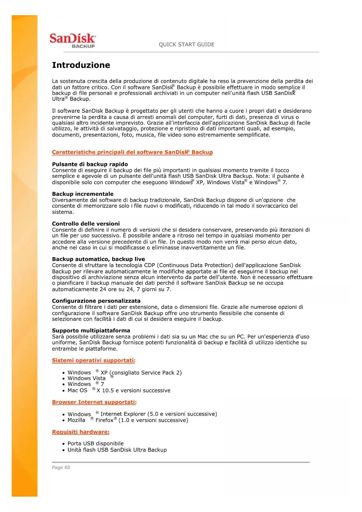 Backup. Il software SanDisk Backup è progettato per gli utenti che hanno a cuore i propri dati e desiderano prevenirne la perdita a causa di arresti anomali del computer, furti di dati, presenza di virus o qualsiasi altro incidente imprevisto. Grazie all'interfaccia dell'applicazione SanDisk Backup di facile utilizzo, le attività di salvataggio, protezione e ripristino di dati importanti quali, ad esempio, documenti, presentazioni, foto, musica, file video sono estremamente semplificate.