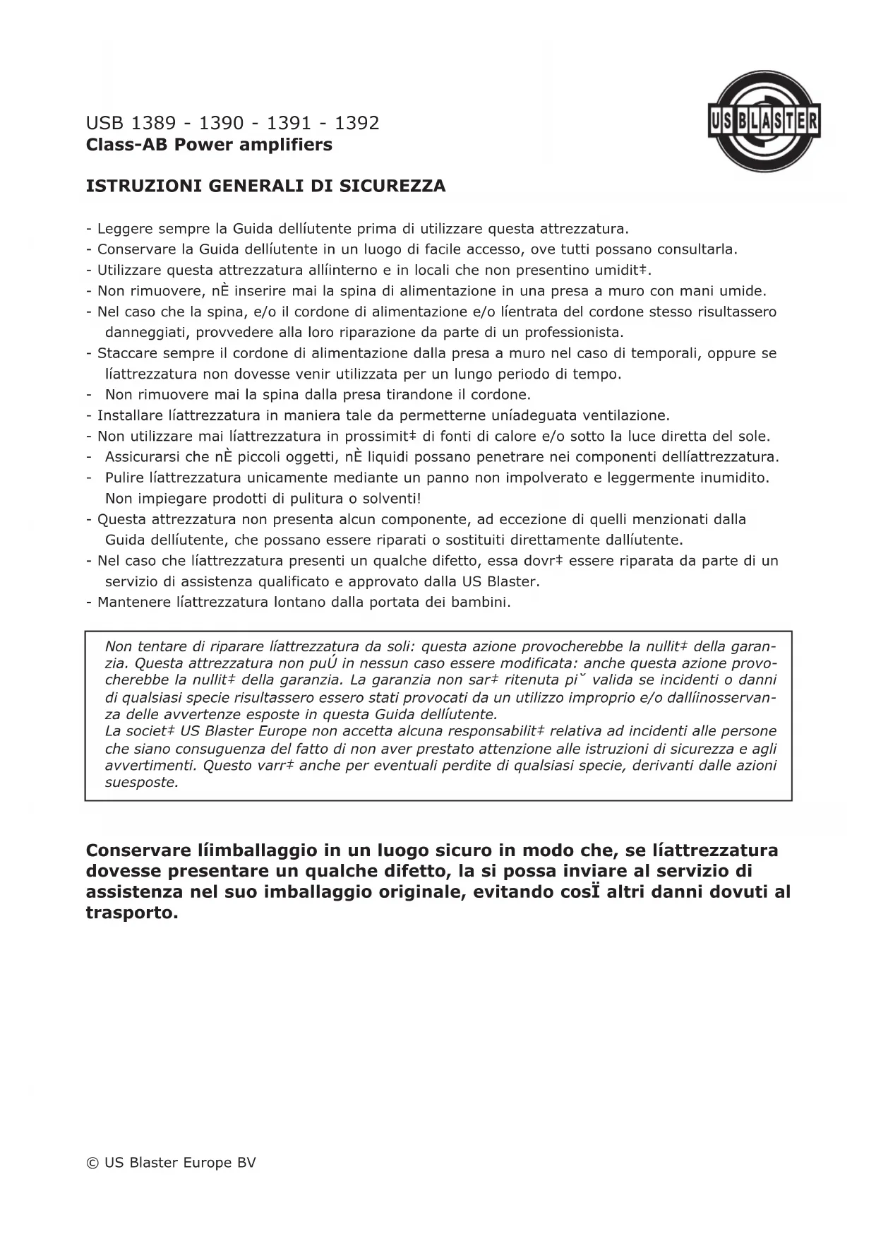 Pulire líattrezzatura unicamente mediante un panno non impolverato e leggermente inumidito. Non impiegare prodotti di pulitura o solventi! - Questa attrezzatura non presenta alcun componente, ad eccezione di quelli menzionati dalla Guida dellíutente, che possano essere riparati o sostituiti direttamente dallíutente. - Nel caso che líattrezzatura presenti un qualche difetto, essa dovr‡ essere riparata da parte di un servizio di assistenza qualificato e approvato dalla US Blaster. - Mantenere líattrezzatura lontano dalla portata dei bambini. Conservare líimballaggio in un luogo sicuro in modo che, se líattrezzatura dovesse presentare un qualche difetto, la si possa inviare al servizio di assistenza nel suo imballaggio originale, evitando cosÏ altri danni dovuti al trasporto. © US Blaster Europe BV Non tentare di riparare líattrezzatura da soli: questa azione provocherebbe la nullit‡ della garan- zia. Questa attrezzatura non puÚ in nessun caso essere modificata: anche questa azione provo- cherebbe la nullit‡ della garanzia. La garanzia non sar‡ ritenuta pi˘ valida se incidenti o danni di qualsiasi specie risultassero essero stati provocati da un utilizzo improprio e/o dallíinosservan- za delle avvertenze esposte in questa Guida dellíutente. La societ‡ US Blaster Europe non accetta alcuna responsabilit‡ relativa ad incidenti alle persone che siano consuguenza del fatto di non aver prestato attenzione alle istruzioni di sicurezza e agli avvertimenti. Questo varr‡ anche per eventuali perdite di qualsiasi specie, derivanti dalle azioni suesposte.USB 1389 - 1390 - 1391 - 1392 Class-AB Power amplifiers INTRODUZIONE