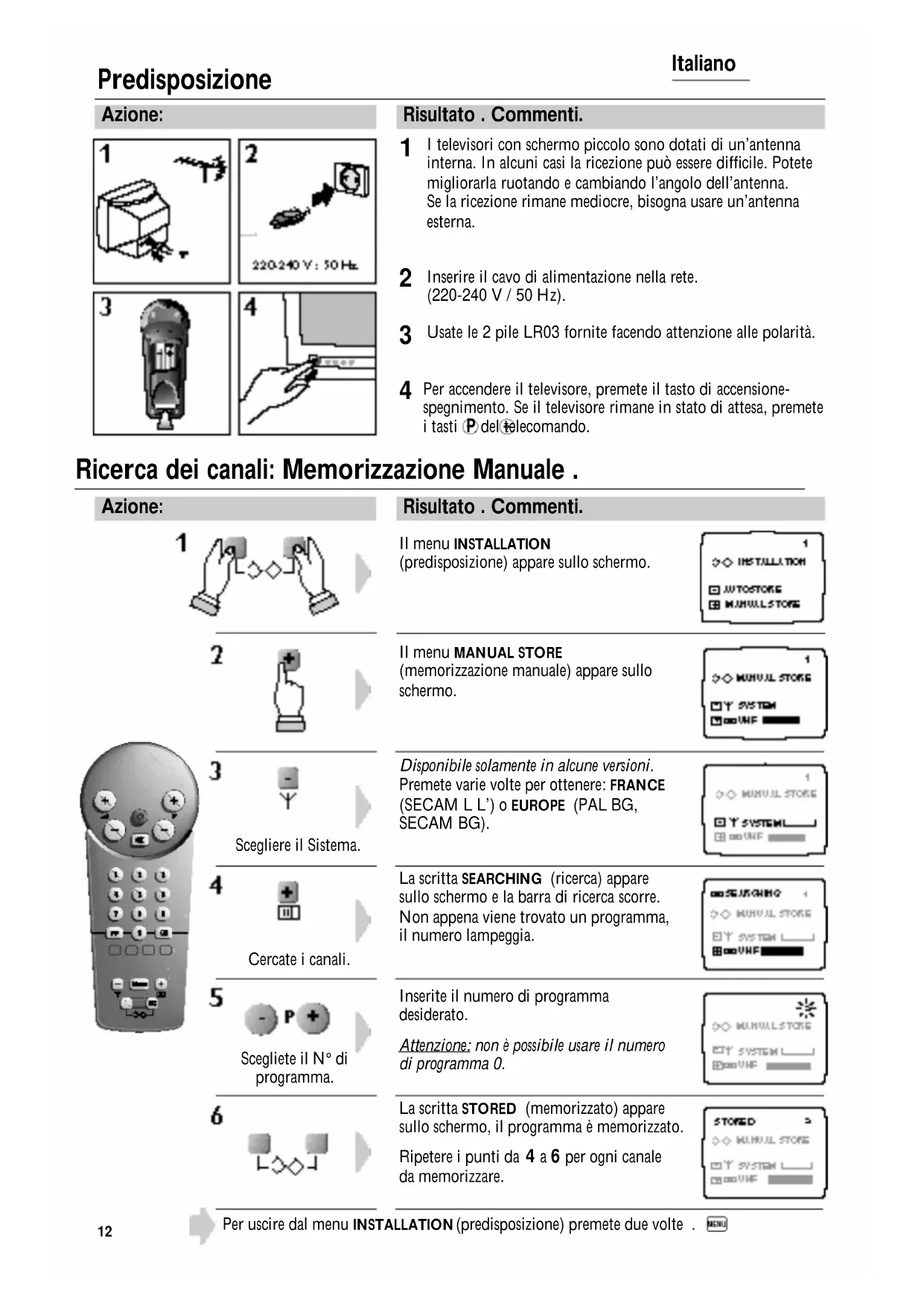 1 Premete contemporanamente i due tasti per richiamare il menu INSTALLA TION (predisposizione).