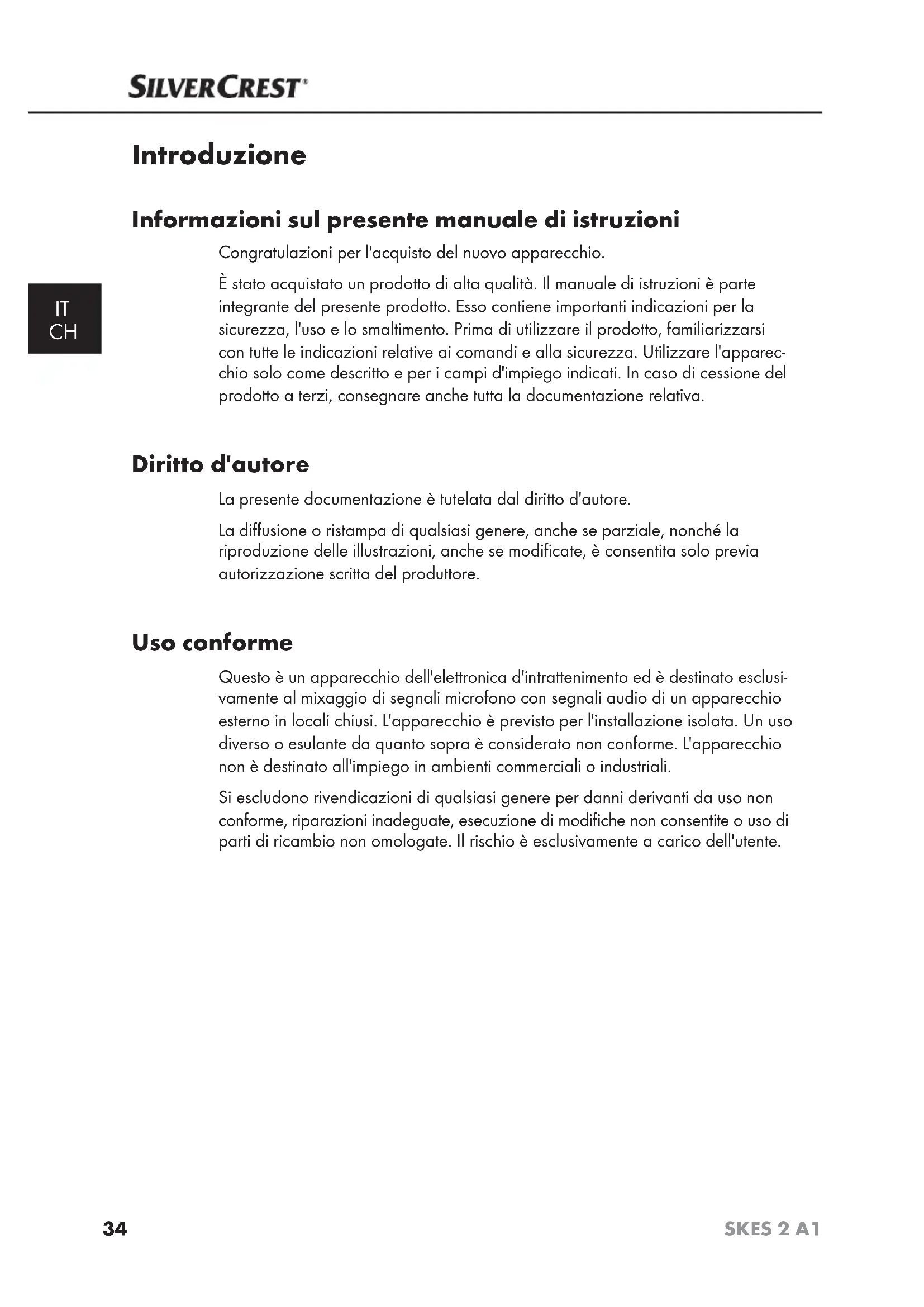 Introduzione Informazioni sul presente manuale di istruzioni Congratulazioni per l'acquisto del nuovo apparecchio. È stato acquistato un prodotto di alta qualità. Il manuale di istruzioni è parte integrante del presente prodotto. Esso contiene importanti indicazioni per la sicurezza, l'uso e lo smaltimento. Prima di utilizzare il prodotto, familiarizzarsi con tutte le indicazioni relative ai comandi e alla sicurezza. Utilizzare l'apparec- chio solo come descritto e per i campi d'impiego indicati. In caso di cessione del prodotto a terzi, consegnare anche tutta la documentazione relativa. Diritto d'autore La presente documentazione è tutelata dal diritto d'autore. La diffusione o ristampa di qualsiasi genere, anche se parziale, nonché la riproduzione delle illustrazioni, anche se modificate, è consentita solo previa autorizzazione scritta del produttore. Uso conforme Questo è un apparecchio dell'elettronica d'intrattenimento ed è destinato esclusi- vamente al mixaggio di segnali microfono con segnali audio di un apparecchio esterno in locali chiusi. L'apparecchio è previsto per l'installazione isolata. Un uso diverso o esulante da quanto sopra è considerato non conforme. L'apparecchio non è destinato all'impiego in ambienti commerciali o industriali. Si escludono rivendicazioni di qualsiasi genere per danni derivanti da uso non conforme, riparazioni inadeguate, esecuzione di modifiche non consentite o uso di parti di ricambio non omologate. Il rischio è esclusivamente a carico dell'utente.35 SKES 2 A1