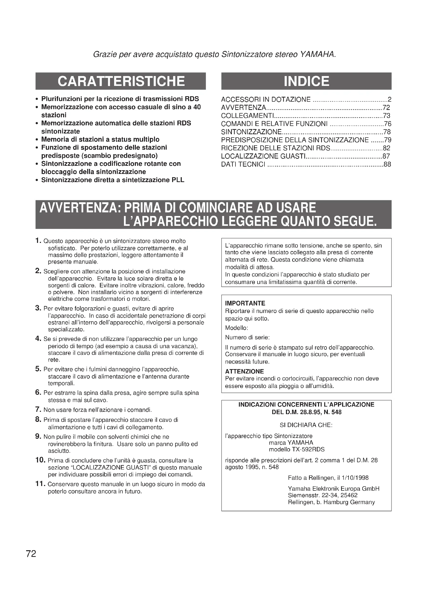 poterlo consultare ancora in futuro.L’apparecchio rimane sotto tensione, anche se spento, sintanto che viene lasciato collegato alla presa di correntealternata di rete. Questa condizione viene chiamatamodalità di attesa.In queste condizioni l’apparecchio è stato studiato perconsumare una limitatissima quantità di corrente.IMPORTANTERiportare il numero di serie di questo apparecchio nellospazio qui sotto.Modello:Numero di serie:Il numero di serie è stampato sul retro dell’apparecchio.Conservare il manuale in luogo sicuro, per eventualinecessità future.ATTENZIONEPer evitare incendi o cortocircuiti, l’apparecchio non deveessere esposto alla pioggia o all’umidità.INDICAZIONI CONCERNENTI L’APPLICAZIONE DEL D.M. 28.8.95, N. 548SI DICHIARA CHE:l’apparecchio tipo Sintonizzatoremarca YAMAHAmodello TX-592RDSrisponde alle prescrizioni dell’art. 2 comma 1 del D.M. 28agosto 1995, n. 548Fatto a Rellingen, il 1/10/1998Yamaha Elektronik Europa GmbHSiemensstr. 22-34, 25462 Rellingen, b. Hamburg Germany73 Italiano Prima di inserire la spina del cavo di alimentazione dei componenti nella presa di corrente alternata di rete è assolutamente necessario che siano stati completati tutti i collegamenti.