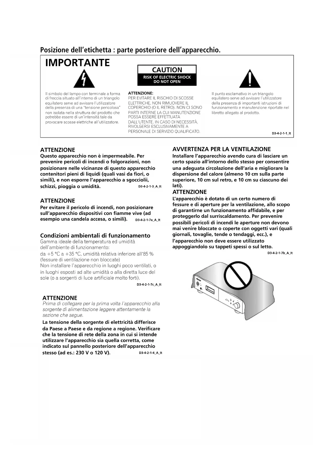 Installare l’apparecchio avendo cura di lasciare un certo spazio all’intorno dello stesso per consentire una adeguata circolazione dell’aria e migliorare la dispersione del calore (almeno 10 cm sulla parte superiore, 10 cm sul retro, e 10 cm su ciascuno dei lati). ATTENZIONE L’apparecchio è dotato di un certo numero di fessure e di aperture per la ventilazione, allo scopo di garantirne un funzionamento affidabile, e per proteggerlo dal surriscaldamento. Per prevenire possibili pericoli di incendi le aperture non devono mai venire bloccate o coperte con oggetti vari (quali giornali, tovaglie, tende o tendaggi, ecc.), e l’apparecchio non deve essere utilizzato appoggiandolo su tappeti spessi o sul letto. D3-4-2-1-7b_A_It ATTENZIONE La tensione della sorgente di elettricità differisce da Paese a Paese e da regione a regione. Verificare che la tensione di rete della zona in cui si intende utilizzare l’apparecchio sia quella corretta, come indicato sul pannello posteriore dell’apparecchio stesso (ad es.: 230 V o 120 V). D3-4-2-1-4_A_It Prima di collegare per la prima volta l’apparecchio alla sezione che segue. sorgente di alimentazione leggere attentamente la