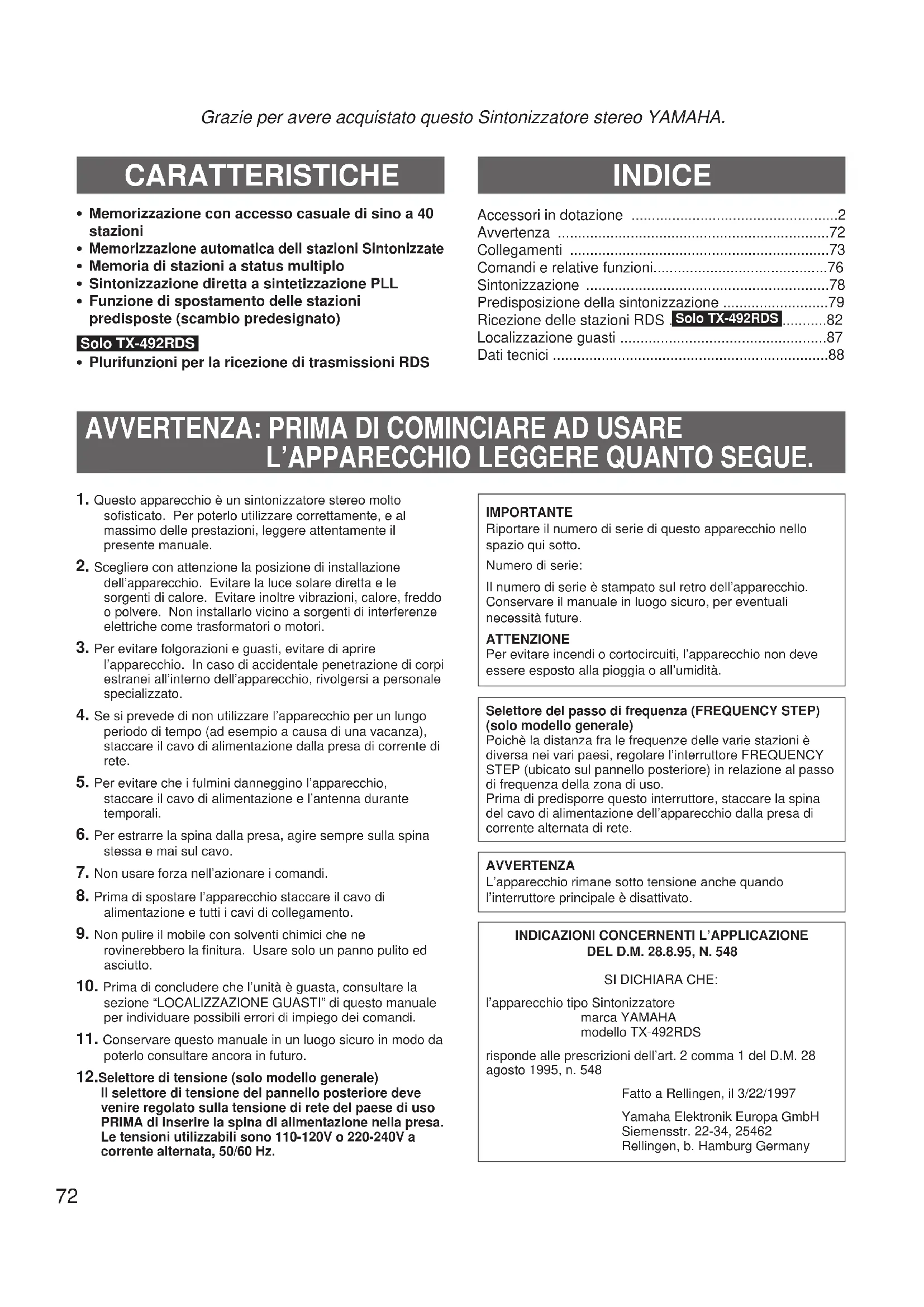 poterlo consultare ancora in futuro. 12.Selettore di tensione (solo modello generale) Il selettore di tensione del pannello posteriore devevenire regolato sulla tensione di rete del paese di usoPRIMA di inserire la spina di alimentazione nella presa.Le tensioni utilizzabili sono 110-120V o 220-240V acorrente alternata, 50/60 Hz.IMPORTANTERiportare il numero di serie di questo apparecchio nellospazio qui sotto.Numero di serie:Il numero di serie è stampato sul retro dell’apparecchio.Conservare il manuale in luogo sicuro, per eventualinecessità future.ATTENZIONEPer evitare incendi o cortocircuiti, l’apparecchio non deveessere esposto alla pioggia o all’umidità.Selettore del passo di frequenza (FREQUENCY STEP)(solo modello generale)Poichè la distanza fra le frequenze delle varie stazioni èdiversa nei vari paesi, regolare l’interruttore FREQUENCYSTEP (ubicato sul pannello posteriore) in relazione al passodi frequenza della zona di uso.Prima di predisporre questo interruttore, staccare la spinadel cavo di alimentazione dell’apparecchio dalla presa dicorrente alternata di rete.AVVERTENZAL’apparecchio rimane sotto tensione anche quandol’interruttore principale è disattivato.INDICAZIONI CONCERNENTI L’APPLICAZIONE DEL D.M. 28.8.95, N. 548SI DICHIARA CHE:l’apparecchio tipo Sintonizzatoremarca YAMAHAmodello TX-492RDSrisponde alle prescrizioni dell’art. 2 comma 1 del D.M. 28agosto 1995, n. 548Fatto a Rellingen, il 3/22/1997Yamaha Elektronik Europa GmbHSiemensstr. 22-34, 25462 Rellingen, b. Hamburg GermanySolo TX-492RDSSolo TX-492RDS73 Italiano Prima di inserire la spina del cavo di alimentazione dei componenti nella presa di corrente alternata di rete è assolutamente necessario che siano stati completati tutti i collegamenti.