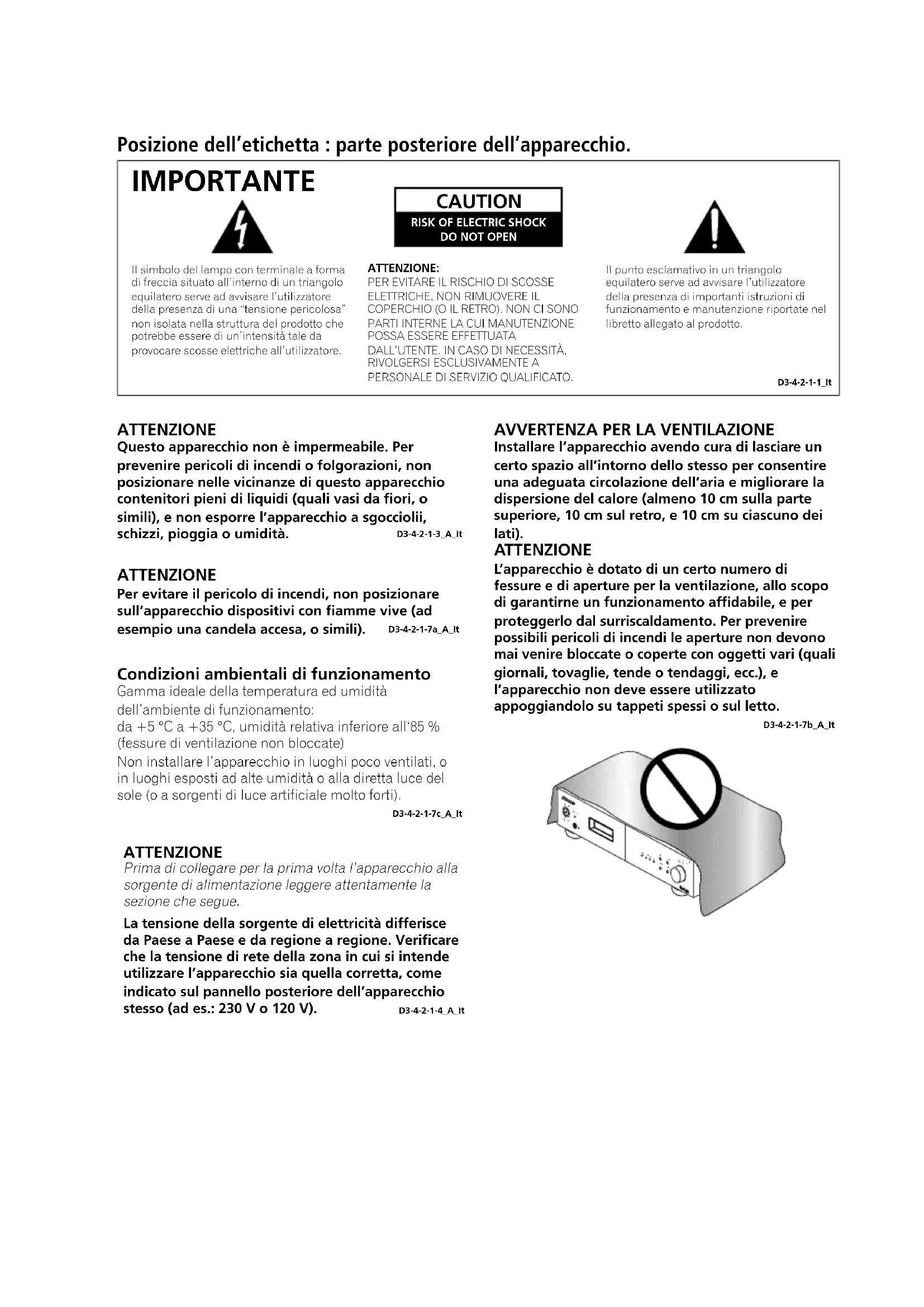 Installare l’apparecchio avendo cura di lasciare un certo spazio all’intorno dello stesso per consentire una adeguata circolazione dell’aria e migliorare la dispersione del calore (almeno 10 cm sulla parte superiore, 10 cm sul retro, e 10 cm su ciascuno dei lati). ATTENZIONE L’apparecchio è dotato di un certo numero di fessure e di aperture per la ventilazione, allo scopo di garantirne un funzionamento affidabile, e per proteggerlo dal surriscaldamento. Per prevenire possibili pericoli di incendi le aperture non devono mai venire bloccate o coperte con oggetti vari (quali giornali, tovaglie, tende o tendaggi, ecc.), e l’apparecchio non deve essere utilizzato appoggiandolo su tappeti spessi o sul letto. D3-4-2-1-7b_A_It ATTENZIONE La tensione della sorgente di elettricità differisce da Paese a Paese e da regione a regione. Verificare che la tensione di rete della zona in cui si intende utilizzare l’apparecchio sia quella corretta, come indicato sul pannello posteriore dell’apparecchio stesso (ad es.: 230 V o 120 V). D3-4-2-1-4_A_It Prima di collegare per la prima volta l’apparecchio alla sezione che segue. sorgente di alimentazione leggere attentamente la