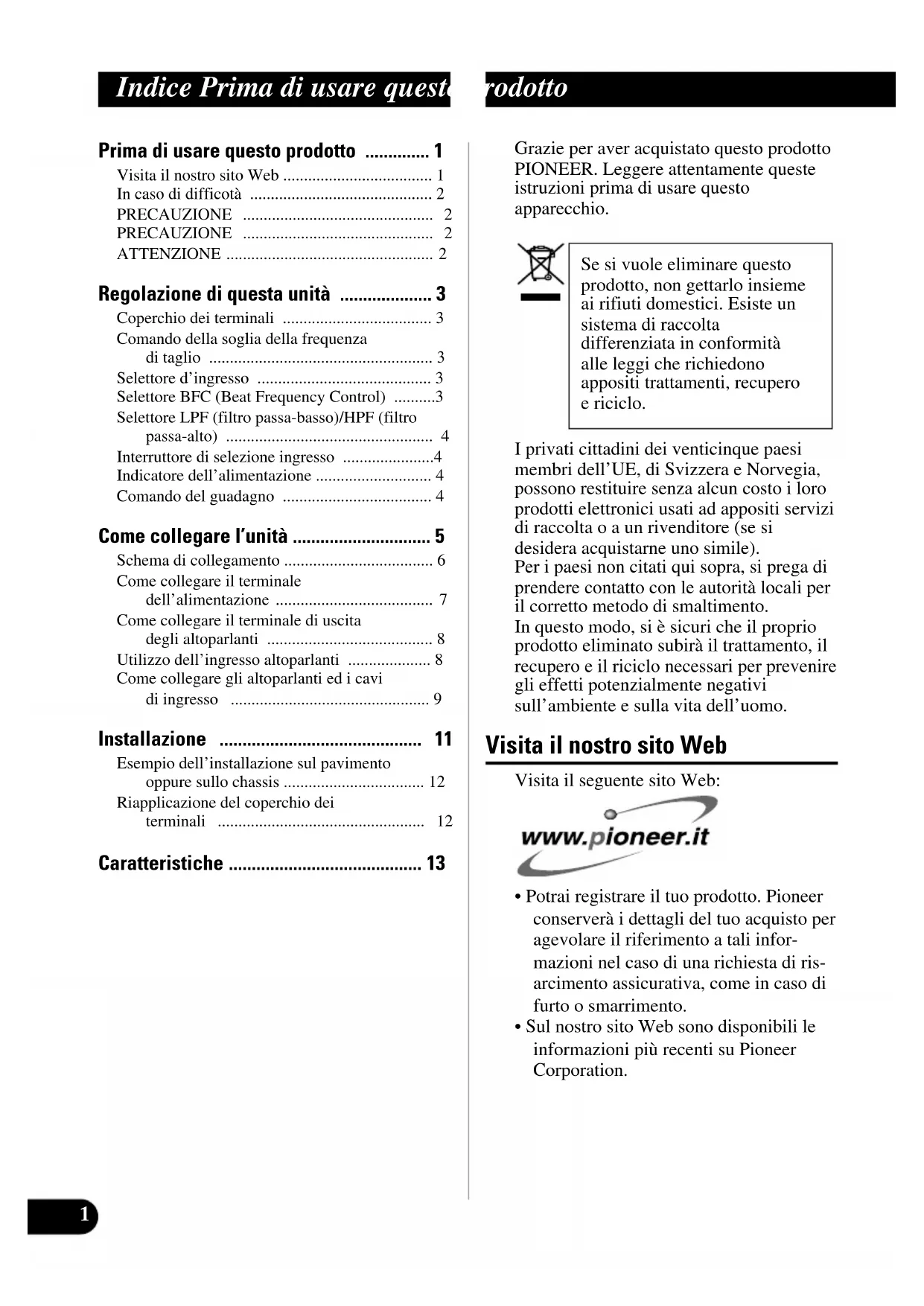 - Le courant moyen est proche du courant maximal lorsqu’un signal audio est appliqué à l’entrée de l’amplificateur. Utilisez cette valeur lorsque vous désirez calculer le courant total consommé par plusieurs amplificateurs de puissance.14 ENGLISH ESPAÑOL DEUTSCH FRANÇAIS ITALIANO NEDERLANDS êìëëäàâ1 Prima di usare questo prodotto .............. 1 Visita il nostro sito Web .................................... 1 In caso di difficotà ............................................ 2 PRECAUZIONE .............................................. 2 PRECAUZIONE .............................................. 2 ATTENZIONE .................................................. 2 Regolazione di questa unità .................... 3 Coperchio dei terminali .................................... 3 Comando della soglia della frequenza di taglio ...................................................... 3 Selettore d’ingresso .......................................... 3 Selettore BFC (Beat Frequency Control) ..........3 Selettore LPF (filtro passa-basso)/HPF (filtro passa-alto) .................................................. 4 Interruttore di selezione ingresso ......................4 Indicatore dell’alimentazione ............................ 4 Comando del guadagno .................................... 4 Come collegare I’unità .............................. 5 Schema di collegamento .................................... 6 Come collegare il terminale dell’alimentazione ...................................... 7 Come collegare il terminale di uscita degli altoparlanti ........................................ 8 Utilizzo dell’ingresso altoparlanti .................... 8 Come collegare gli altoparlanti ed i cavi di ingresso ................................................ 9 Installazione ............................................ 11 Esempio dell’installazione sul pavimento oppure sullo chassis .................................. 12 Riapplicazione del coperchio dei terminali .................................................. 12 Caratteristiche .......................................... 13 Grazie per aver acquistato questo prodotto PIONEER. Leggere attentamente queste istruzioni prima di usare questo apparecchio. I privati cittadini dei venticinque paesi membri dell’UE, di Svizzera e Norvegia, possono restituire senza alcun costo i loro prodotti elettronici usati ad appositi servizi di raccolta o a un rivenditore (se si desidera acquistarne uno simile). Per i paesi non citati qui sopra, si prega di prendere contatto con le autorità locali per il corretto metodo di smaltimento. In questo modo, si è sicuri che il proprio prodotto eliminato subirà il trattamento, il recupero e il riciclo necessari per prevenire gli effetti potenzialmente negativi sull’ambiente e sulla vita dell’uomo. Visita il nostro sito Web Visita il seguente sito Web: