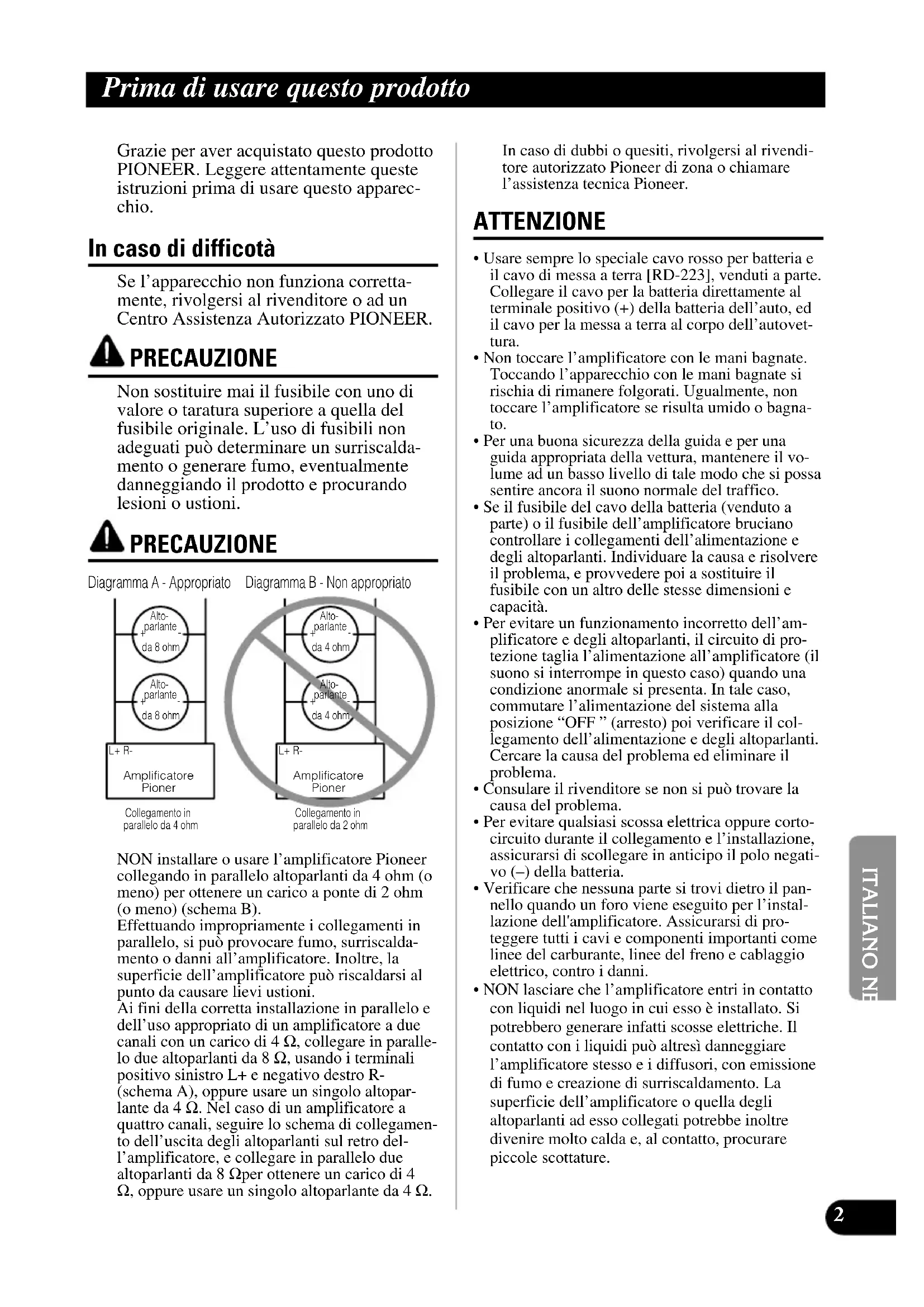 ITALIANO NEDERLANDS Grazie per aver acquistato questo prodotto PIONEER. Leggere attentamente queste istruzioni prima di usare questo apparec- chio. In caso di difficotà Se l’apparecchio non funziona corretta- mente, rivolgersi al rivenditore o ad un Centro Assistenza Autorizzato PIONEER. PRECAUZIONE Non sostituire mai il fusibile con uno di valore o taratura superiore a quella del fusibile originale. L’uso di fusibili non adeguati può determinare un surriscalda- mento o generare fumo, eventualmente danneggiando il prodotto e procurando lesioni o ustioni. PRECAUZIONE NON installare o usare l’amplificatore Pioneer collegando in parallelo altoparlanti da 4 ohm (o meno) per ottenere un carico a ponte di 2 ohm (o meno) (schema B). Effettuando impropriamente i collegamenti in parallelo, si può provocare fumo, surriscalda- mento o danni all’amplificatore. Inoltre, la superficie dell’amplificatore può riscaldarsi al punto da causare lievi ustioni. Ai fini della corretta installazione in parallelo e dell’uso appropriato di un amplificatore a due canali con un carico di 4 Ω, collegare in paralle- lo due altoparlanti da 8 Ω, usando i terminali positivo sinistro L+ e negativo destro R- (schema A), oppure usare un singolo altopar- lante da 4 Ω. Nel caso di un amplificatore a quattro canali, seguire lo schema di collegamen- to dell’uscita degli altoparlanti sul retro del- l’amplificatore, e collegare in parallelo due altoparlanti da 8 Ω per ottenere un carico di 4 Ω, oppure usare un singolo altoparlante da 4 Ω. In caso di dubbi o quesiti, rivolgersi al rivendi- tore autorizzato Pioneer di zona o chiamare l’assistenza tecnica Pioneer. ATTENZIONE