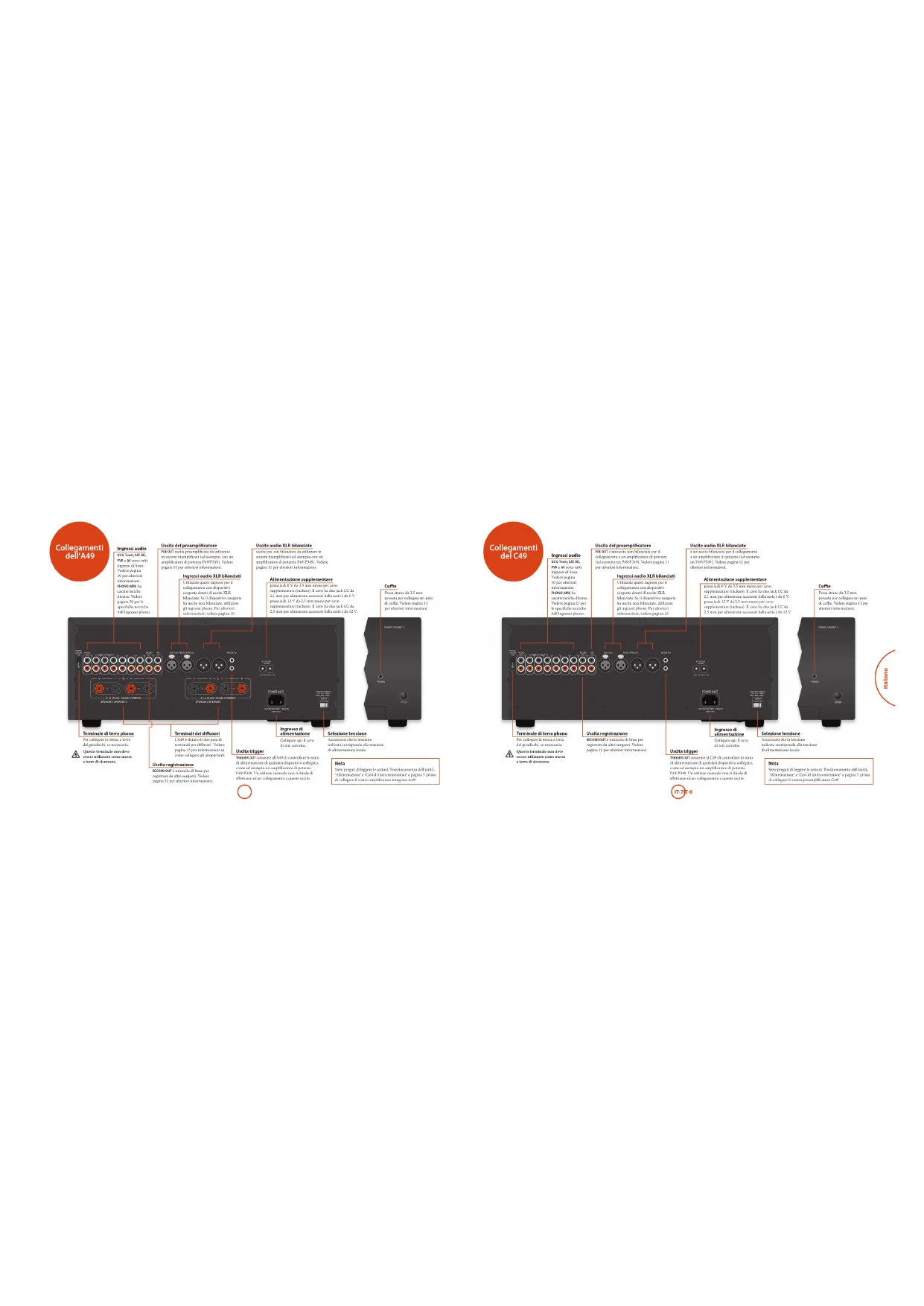 POWER POWER / STANDBY Selezione tensione Assicurarsi che la tensione indicata corrisponda alla tensione di alimentazione locale. Ingresso di alimentazione Collegare qui il cavo di rete corretto. Uscita registrazione RECORD OUT è un’uscita di linea per registrare da altre sorgenti. Vedere pagina 11 per ulteriori informazioni. Uscita trigger TRIGGER OUT consente all’A49 di controllare lo stato di alimentazione di qualsiasi dispositivo collegato, come ad esempio un amplicatore di potenza P49/P349. Un utilizzo normale non richiede di eettuare alcun collegamento a queste uscite. Cue Presa stereo da 3,5 mm pensata per collegare un paio di cue. Vedere pagina 11 per ulteriori informazioni. Terminali dei diusori L’A49 è dotato di due paia di terminali per diusori. Vedere pagina 15 per informazioni su come collegare gli altoparlanti. Terminale di terra phono Per collegare la messa a terra del giradischi, se necessaria. Questo terminale non deve essere utilizzato come messa a terra di sicurezza. Alimentazione supplementare presa jack 6 V da 3,5 mm mono per cavo supplementare (incluso). Il cavo ha due jack CC da 2,1 mm per alimentare accessori della serie r da 6 V. presa jack 12 V da 2,5 mm mono per cavo supplementare (incluso). Il cavo ha due jack CC da 2,5 mm per alimentare accessori della serie r da 12 V. Uscita del preamplicatore PRE OUT uscita preamplicata da utilizzare in sistemi biamplicati (ad esempio, con un amplicatore di potenza P49/P349). Vedere pagina 11 per ulteriori informazioni. Ingressi audio AUX, Tuner, SAT, BD, PVR e AV sono tutti ingressi di linea. Vedere pagina 10 per ulteriori informazioni. PHONO (MM) ha caratteristiche diverse. Vedere pagina 20 per le speciche tecniche dell’ingresso phono. Uscite audio XLR bilanciate uscita pre-out bilanciata da utilizzare in sistemi biamplicati (ad esempio con un amplicatore di potenza P49/P349). Vedere pagina 11 per ulteriori informazioni. Ingressi audio XLR bilanciati Utilizzate questi ingressi per il collegamento con dispositivi sorgente dotati di uscite XLR bilanciate. Se il dispositivo sorgente ha uscite non bilanciate, utilizzate gli ingressi phono. Per ulteriori informazioni, vedere pagina 10. Collegamenti del C49 Nota Siete pregati di leggere le sezioni ‘Posizionamento dell'unità’, ‘Alimentazione’ e ‘Cavi di interconnessione’ a pagina 5 prima di collegare il vostro preamplicatore C49! PHONOGROUND ONLY PHONO (MM)