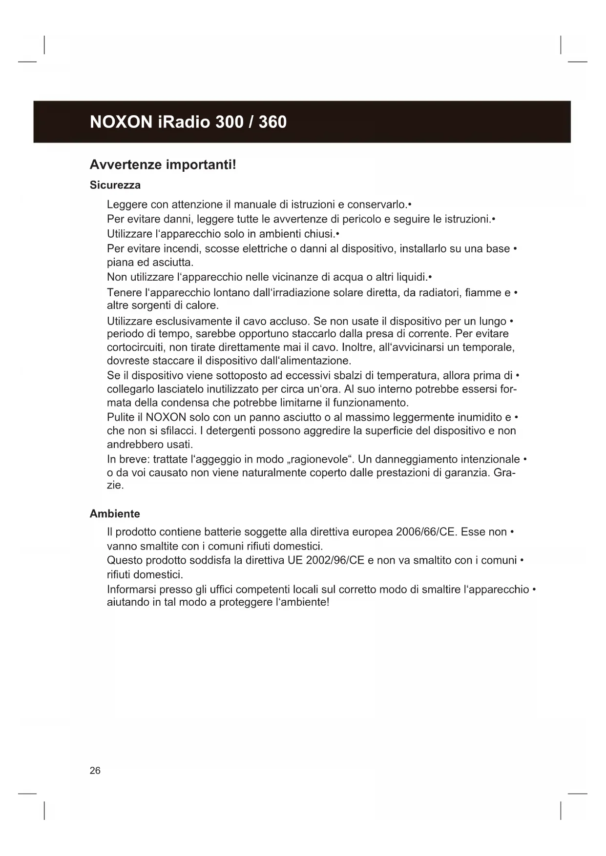 Avvertenze importanti! Sicurezza Leggere con attenzione il manuale di istruzioni e conservarlo.• Per evitare danni, leggere tutte le avvertenze di pericolo e seguire le istruzioni.• Utilizzare l‘apparecchio solo in ambienti chiusi.• Per evitare incendi, scosse elettriche o danni al dispositivo, installarlo su una base • piana ed asciutta. Non utilizzare l‘apparecchio nelle vicinanze di acqua o altri liquidi.• Tenerel‘apparecchiolontanodall‘irradiazionesolarediretta,daradiatori,ammee• altre sorgenti di calore. Utilizzare esclusivamente il cavo accluso. Se non usate il dispositivo per un lungo • periodo di tempo, sarebbe opportuno staccarlo dalla presa di corrente. Per evitare cortocircuiti, non tirate direttamente mai il cavo. Inoltre, all‘avvicinarsi un temporale, dovreste staccare il dispositivo dall‘alimentazione. Se il dispositivo viene sottoposto ad eccessivi sbalzi di temperatura, allora prima di • collegarlo lasciatelo inutilizzato per circa un‘ora. Al suo interno potrebbe essersi for- mata della condensa che potrebbe limitarne il funzionamento. Pulite il NOXON solo con un panno asciutto o al massimo leggermente inumidito e • chenonsislacci.Idetergentipossonoaggredirelasuperciedeldispositivoenon andrebbero usati. In breve: trattate l‘aggeggio in modo „ragionevole“. Un danneggiamento intenzionale • o da voi causato non viene naturalmente coperto dalle prestazioni di garanzia. Gra- zie. Ambiente Il prodotto contiene batterie soggette alla direttiva europea 2006/66/CE. Esse non • vannosmaltiteconicomuniriutidomestici. Questo prodotto soddisfa la direttiva UE 2002/96/CE e non va smaltito con i comuni • riutidomestici. Informarsipressogliufcicompetentilocalisulcorrettomododismaltirel‘apparecchio• aiutando in tal modo a proteggere l‘ambiente!English Nederlands Espanol Italiano Francais Deutsch English