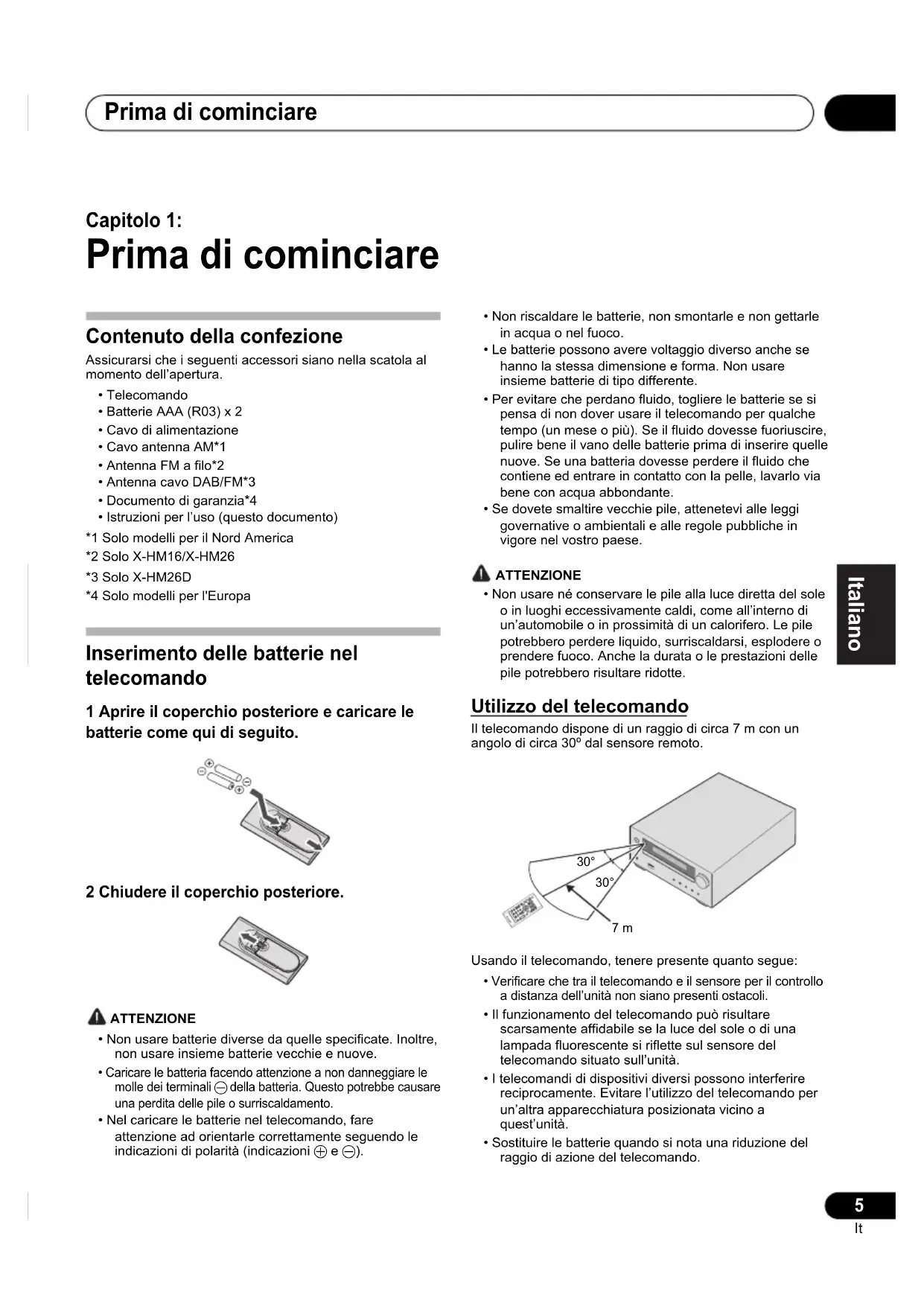 English Français Español Deutsch Italiano Nederlands Pyccкий Capitolo 1: Prima di cominciare Contenuto della confezione Assicurarsi che i seguenti accessori siano nella scatola al momento dell’apertura.• Telecomando• Batterie AAA (R03) x 2• Cavo di alimentazione• Cavo antenna AM*1• Antenna FM a filo*2• Antenna cavo DAB/FM*3• Documento di garanzia*4• Istruzioni per l’uso (questo documento)*1 Solo modelli per il Nord America*2 Solo X-HM16/X-HM26*3 Solo X-HM26D*4 Solo modelli per l'Europa Inserimento delle batterie nel telecomando 1 Aprire il coperchio posteriore e caricare le batterie come qui di seguito.2 Chiudere il coperchio posteriore. ATTENZIONE• Non usare batterie diverse da quelle specificate. Inoltre, non usare insieme batterie vecchie e nuove.• Caricare le batteria facendo attenzione a non danneggiare le molle dei terminali della batteria. Questo potrebbe causare una perdita delle pile o surriscaldamento.• Nel caricare le batterie nel telecomando, fare attenzione ad orientarle correttamente seguendo le indicazioni di polarità (indicazioni + e -).