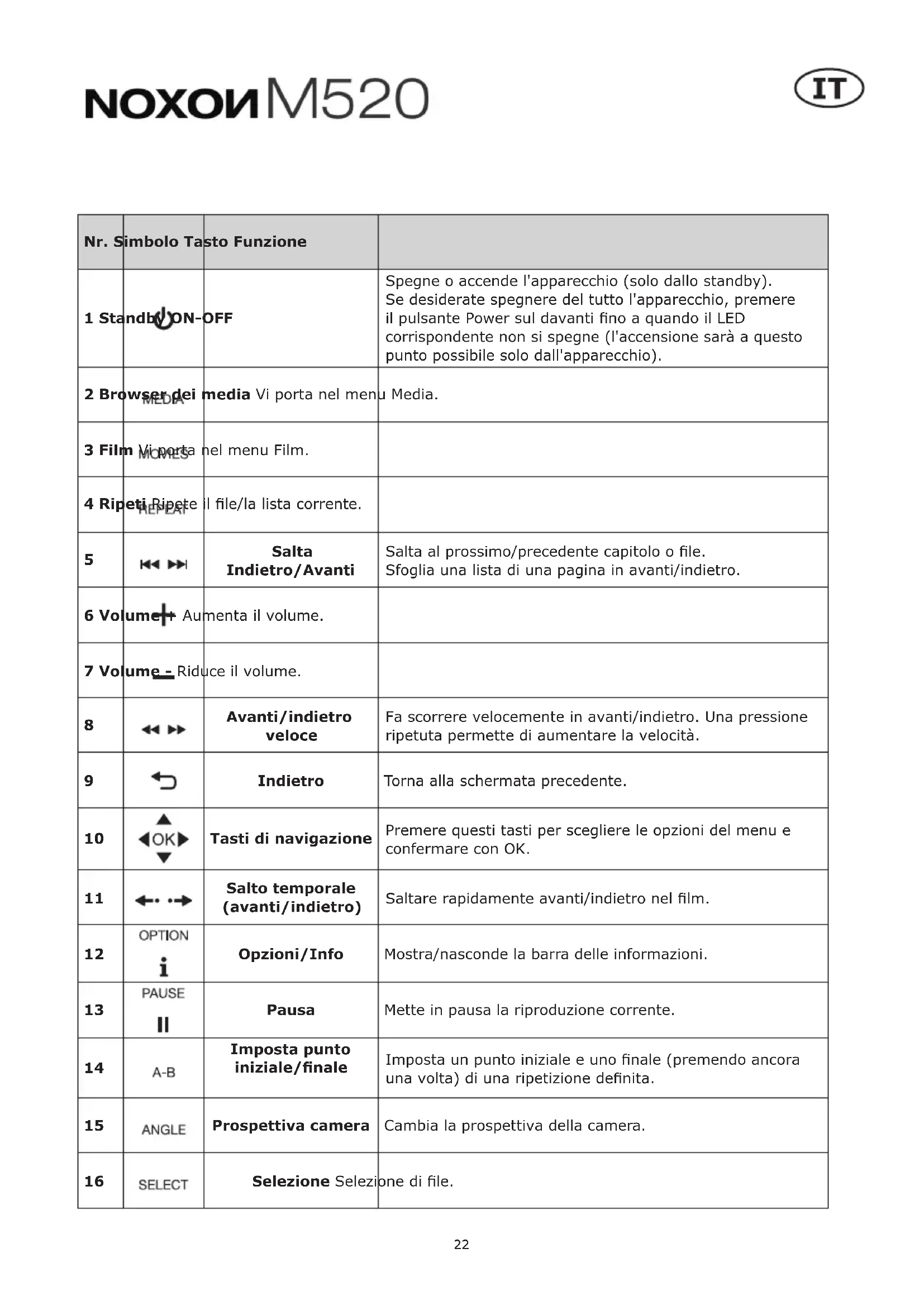 Nr. Simbolo Tasto Funzione 17 Aggiungi Inserisce la selezione ad una lista di riproduzione. 18 Muto Spegne/accende la riproduzione audio. 19 Impostazioni Premere per raggiungere il menu di impostazione. 20 Formato TV Commuta tra NTSC, PAL, 480P, 576P, 720P, 1080I, e 1080P. 21 Musica Vi porta nel menu Musica.