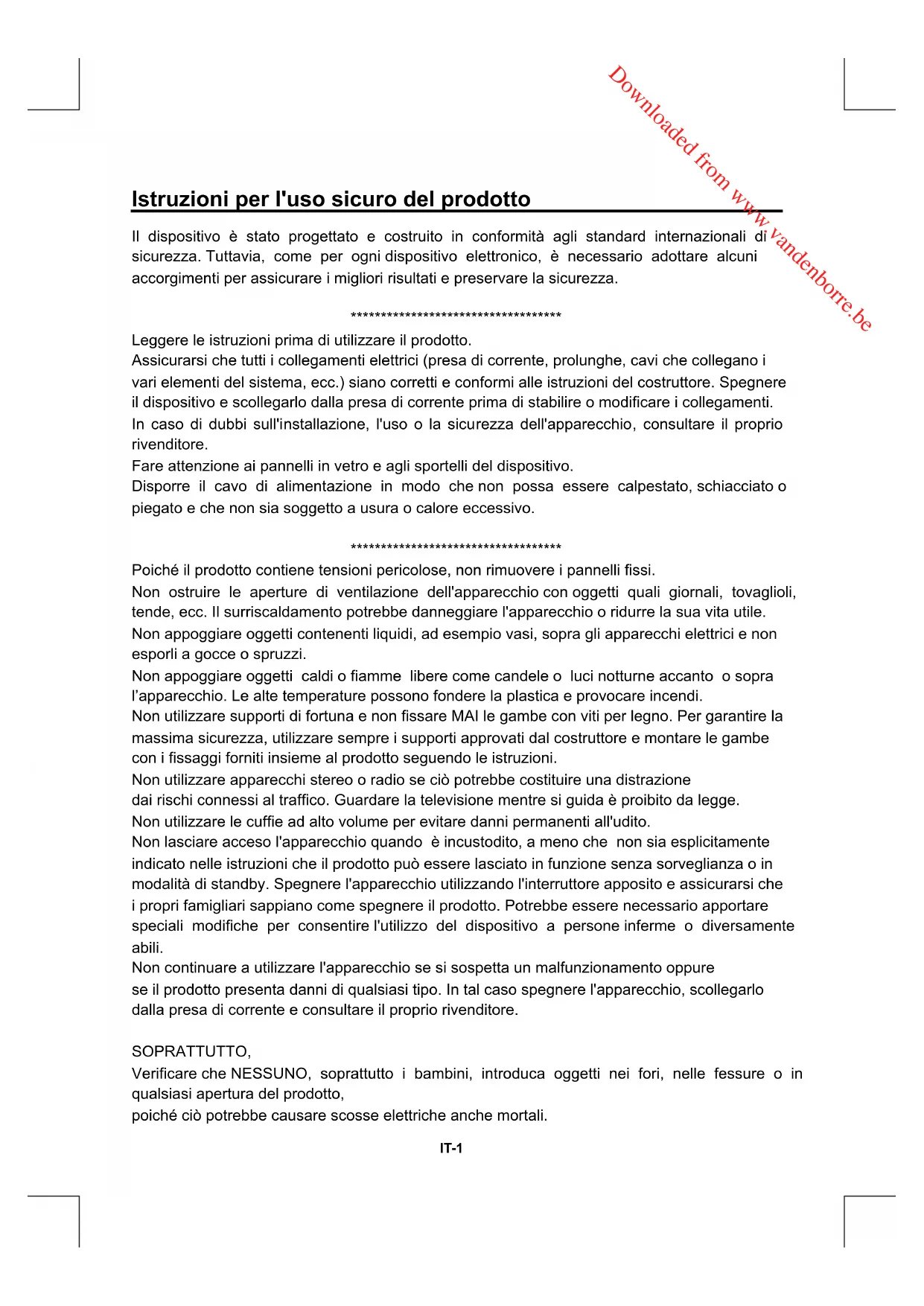 Poiché il prodotto contiene tensioni pericolose, non rimuovere i pannelli ssi. Non ostruire le aperture di ventilazione dell'apparecchio con oggetti quali giornali, tovaglioli, tende, ecc. Il surriscaldamento potrebbe danneggiare l'apparecchio o ridurre la sua vita utile. Non appoggiare oggetti contenenti liquidi, ad esempio vasi, sopra gli apparecchi elettrici e non esporli a gocce o spruzzi. Non appoggiare oggetti caldi o amme libere come candele o luci notturne accanto o sopra l’apparecchio. Le alte temperature possono fondere la plastica e provocare incendi. Non utilizzare supporti di fortuna e non ssare MAI le gambe con viti per legno. Per garantire la massima sicurezza, utilizzare sempre i supporti approvati dal costruttore e montare le gambe con i ssaggi forniti insieme al prodotto seguendo le istruzioni. Non utilizzare apparecchi stereo o radio se ciò potrebbe costituire una distrazione dai rischi connessi al trafco. Guardare la televisione mentre si guida è proibito da legge. Non utilizzare le cufe ad alto volume per evitare danni permanenti all'udito. Non lasciare acceso l'apparecchio quando è incustodito, a meno che non sia esplicitamente indicato nelle istruzioni che il prodotto può essere lasciato in funzione senza sorveglianza o in modalità di standby. Spegnere l'apparecchio utilizzando l'interruttore apposito e assicurarsi che i propri famigliari sappiano come spegnere il prodotto. Potrebbe essere necessario apportare speciali modiche per consentire l'utilizzo del dispositivo a persone inferme o diversamente abili. Non continuare a utilizzare l'apparecchio se si sospetta un malfunzionamento oppure se il prodotto presenta danni di qualsiasi tipo. In tal caso spegnere l'apparecchio, scollegarlo dalla presa di corrente e consultare il proprio rivenditore. SOPRATTUTTO, Vericare che NESSUNO, soprattutto i bambini, introduca oggetti nei fori, nelle fessure o in qualsiasi apertura del prodotto, poiché ciò potrebbe causare scosse elettriche anche mortali. Downloaded from www.vandenborre.beIT-2 NON tentare in alcun caso di maneggiare un qualsiasi dispositivo elettrico senza le dovute competenze.Quando si utilizza un apparecchio elettrico, è sempre necessaria la massima prudenza!