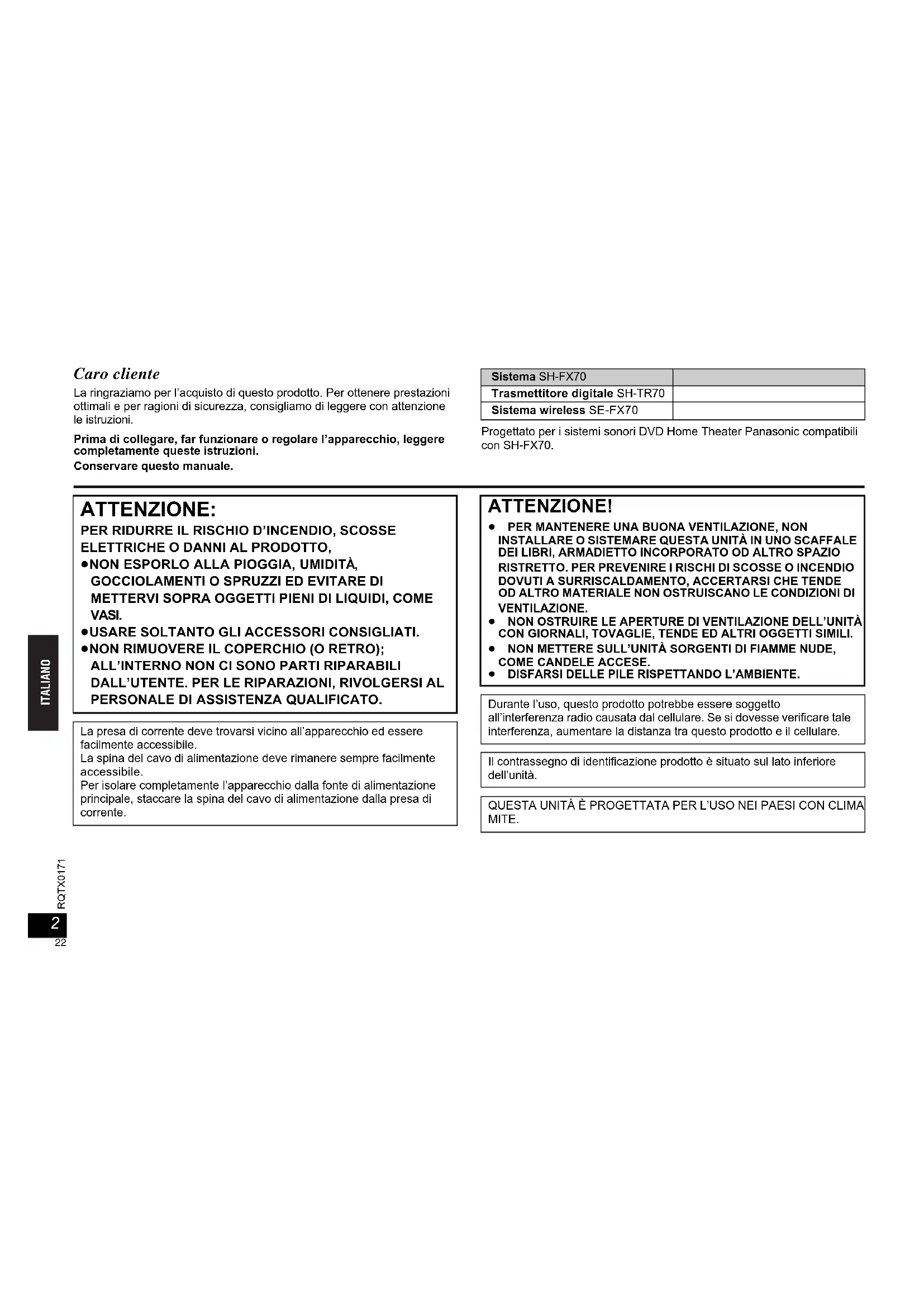 RQTX0171 ITALIANO Caro cliente La ringraziamo per l’acquisto di questo prodotto. Per ottenere prestazioni ottimali e per ragioni di sicurezza, consigliamo di leggere con attenzione le istruzioni.Prima di collegare, far funzionare o regolare l’apparecchio, leggere completamente queste istruzioni.Conservare questo manuale.Progettato per i sistemi sonori DVD Home Theater Panasonic compatibili con SH-FX70.Sistema SH-FX70Trasmettitore digitale SH-TR70Sistema wireless SE-FX70 ATTENZIONE: PER RIDURRE IL RISCHIO D’INCENDIO, SCOSSE ELETTRICHE O DANNI AL PRODOTTO,