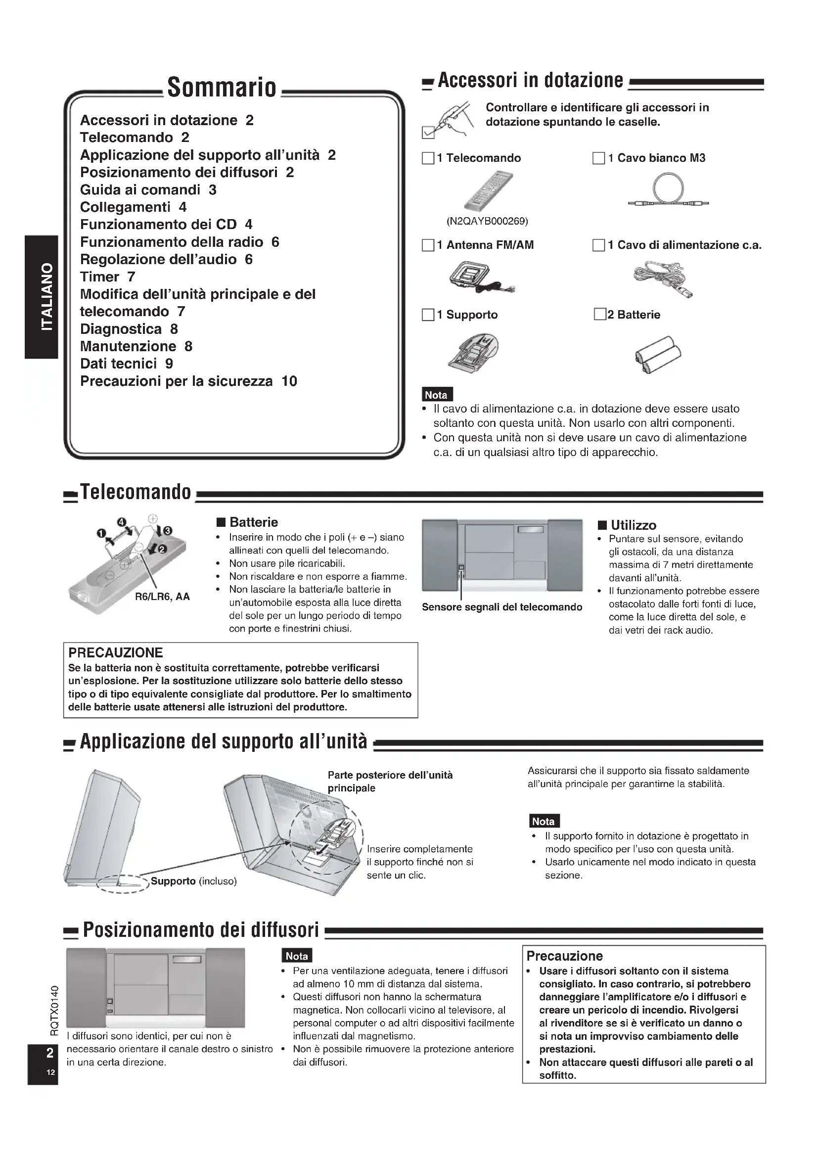 Nota PRECAUZIONE Se la batteria non è sostituita correttamente, potrebbe verificarsi un’esplosione. Per la sostituzione utilizzare solo batterie dello stesso tipo o di tipo equivalente consigliate dal produttore. Per lo smaltimento delle batterie usate attenersi alle istruzioni del produttore. Accessori in dotazione 2 Telecomando 2 Applicazione del supporto all’unità 2 Posizionamento dei diffusori 2 Guida ai comandi 3 Collegamenti 4 Funzionamento dei CD 4 Funzionamento della radio 6 Regolazione dell’audio 6 Timer 7 Modifica dell’unità principale e del telecomando 7 Diagnostica 8 Manutenzione 8 Dati tecnici 9 Precauzioni per la sicurezza 10 Sommario Per una ventilazione adeguata, tenere i diffusori ad almeno 10 mm di distanza dal sistema.Questi diffusori non hanno la schermatura magnetica. Non collocarli vicino al televisore, al personal computer o ad altri dispositivi facilmente influenzati dal magnetismo.Non è possibile rimuovere la protezione anteriore dai diffusori.