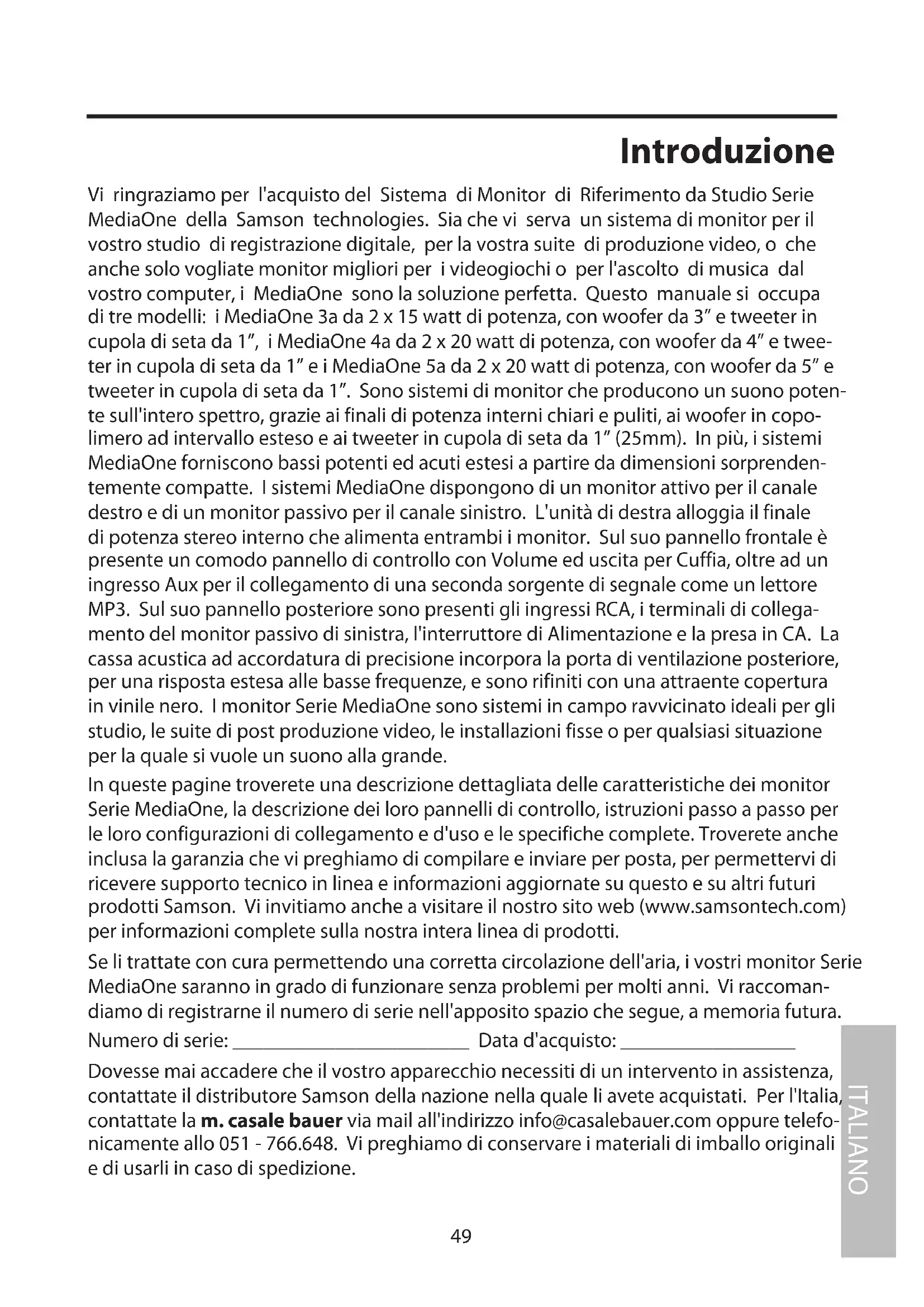 In queste pagine troverete una descrizione dettagliata delle caratteristiche dei monitor Serie MediaOne, la descrizione dei loro pannelli di controllo, istruzioni passo a passo per le loro configurazioni di collegamento e d'uso e le specifiche complete. Troverete anche inclusa la garanzia che vi preghiamo di compilare e inviare per posta, per permettervi di ricevere supporto tecnico in linea e informazioni aggiornate su questo e su altri futuri prodotti Samson. Vi invitiamo anche a visitare il nostro sito web (www.samsontech.com) per informazioni complete sulla nostra intera linea di prodotti.