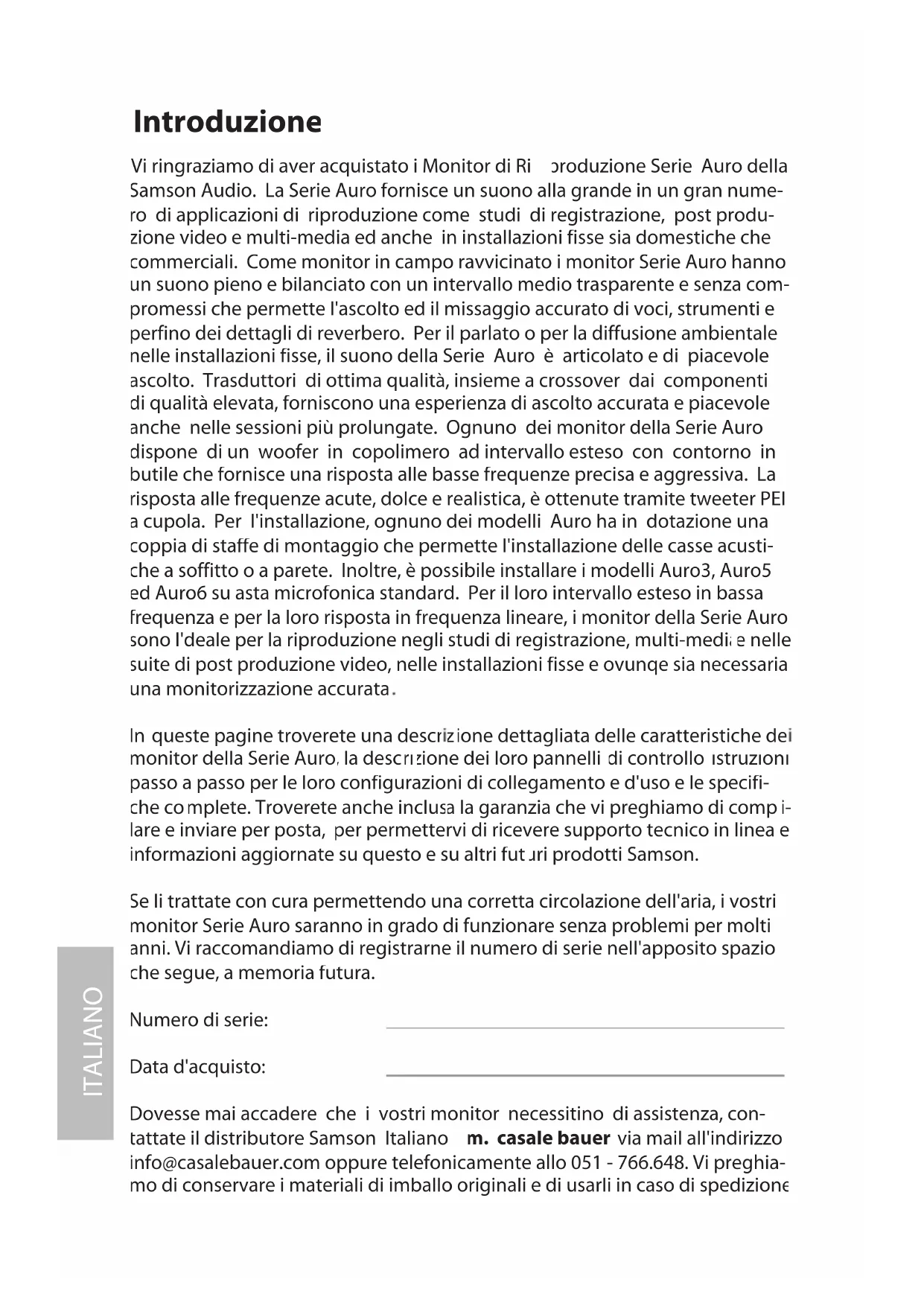 Dovesse mai accadere che i vostri monitor necessitino di assistenza, con- tattate il distributore Samson Italiano m. casale bauer via mail all'indirizzo info@casalebauer.com oppure telefonicamente allo 051 - 766.648. Vi preghia- mo di conservare i materiali di imballo originali e di usarli in caso di spedizione.ITALIANO Le Caratteristiche della Serie Auro I monitor di riferimento da studio a due vie SERIE AURO Samson forniscono un ascolto accurato e piacevole anche nel caso di sessioni impegnative e di lunga durata. Ecco alcune delle loro caratteristiche principali