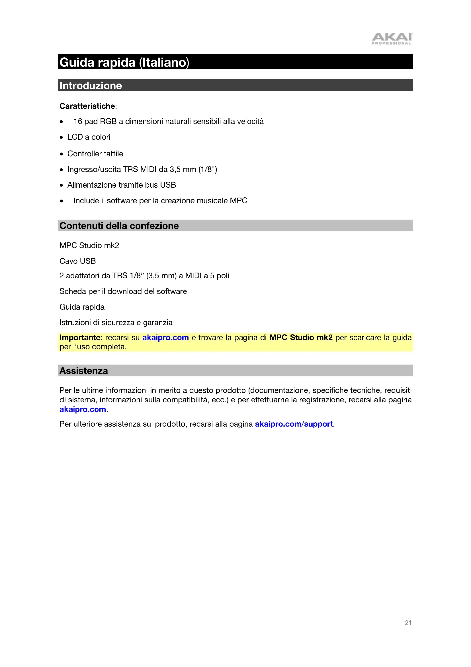 - Include il software per la creazione musicale MPC Contenuti della confezione MPC Studio mk2 Cavo USB 2 adattatori da TRS 1/8” (3,5 mm) a MIDI a 5 poli Scheda per il download del software Guida rapida Istruzioni di sicurezza e garanzia Importante: recarsi su akaipro.com e trovare la pagina di MPC Studio mk2 per scaricare la guida per l’uso completa. Assistenza Per le ultime informazioni in merito a questo prodotto (documentazione, specifiche tecniche, requisiti di sistema, informazioni sulla compatibilità, ecc.) e per effettuarne la registrazione, recarsi alla pagina akaipro.com. Per ulteriore assistenza sul prodotto, recarsi alla pagina akaipro.com/support.22