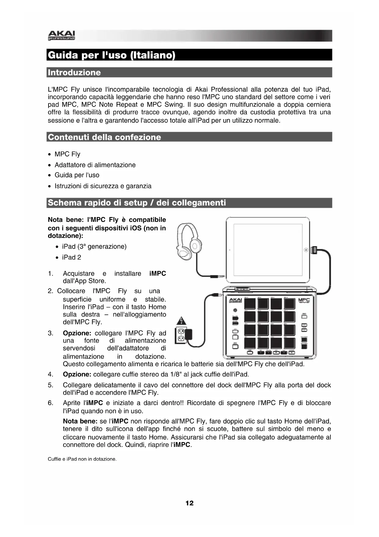 - Istruzioni di sicurezza e garanzia Schema rapido di setup / dei collegamenti Nota bene: l'MPC Fly è compatibile con i seguenti dispositivi iOS (non in dotazione):