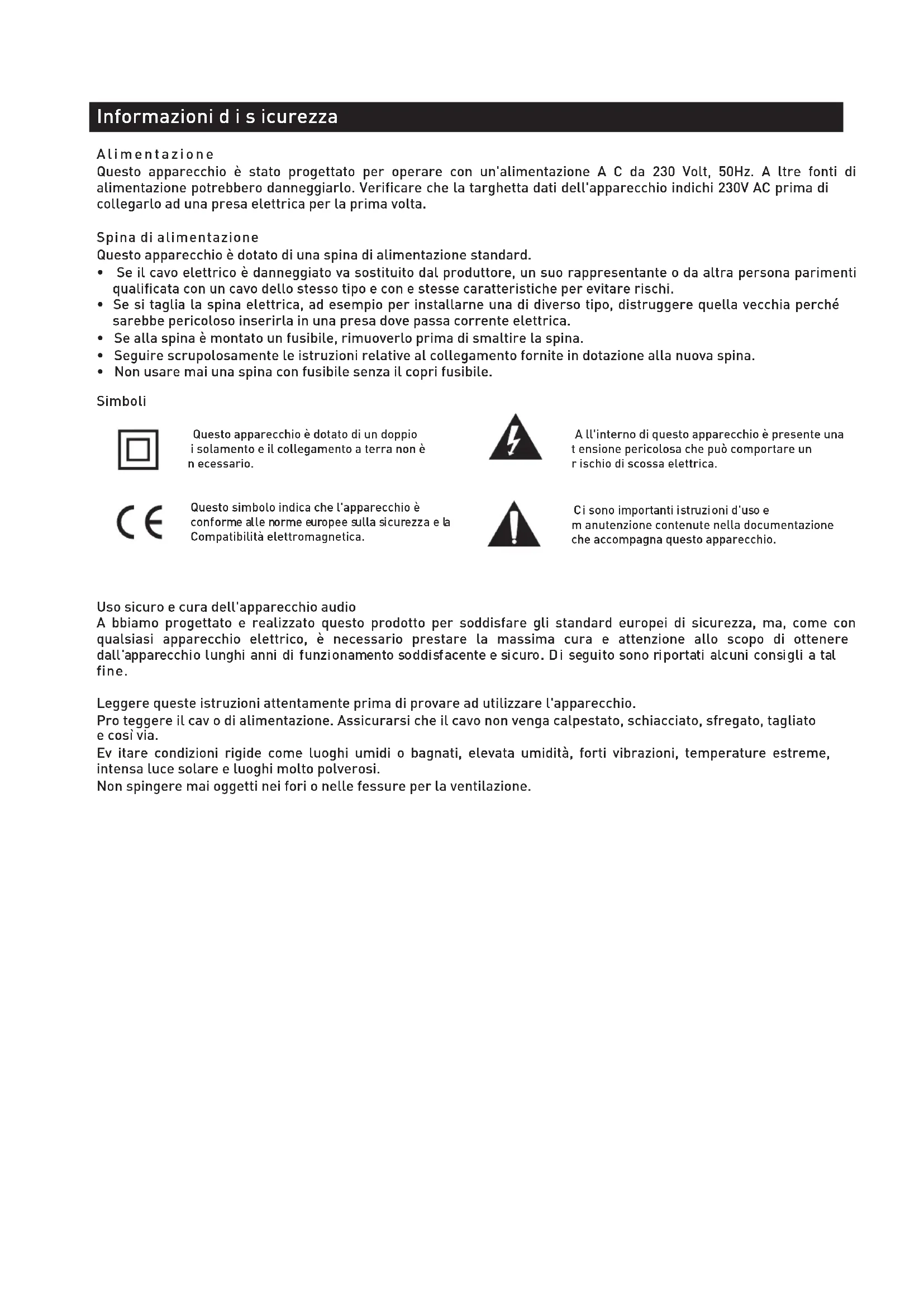 Questo apparecchio è dotato di un doppio i solamento e il collegamento a terra non è n ecessario. Questo simbolo indica che l'apparecchio è conforme alle norme europee sulla sicurezza e la Compatibilità elettromagnetica. Alimentazione Questo apparecchio è stato progettato per operare con un'alimentazione A C da 230 Volt, 50Hz. A ltre fonti di alimentazione potrebbero danneggiarlo. Verificare che la targhetta dati dell'apparecchio indichi 230V AC prima di collegarlo ad una presa elettrica per la prima volta. Spina di alimentazione Questo apparecchio è dotato di una spina di alimentazione standard.