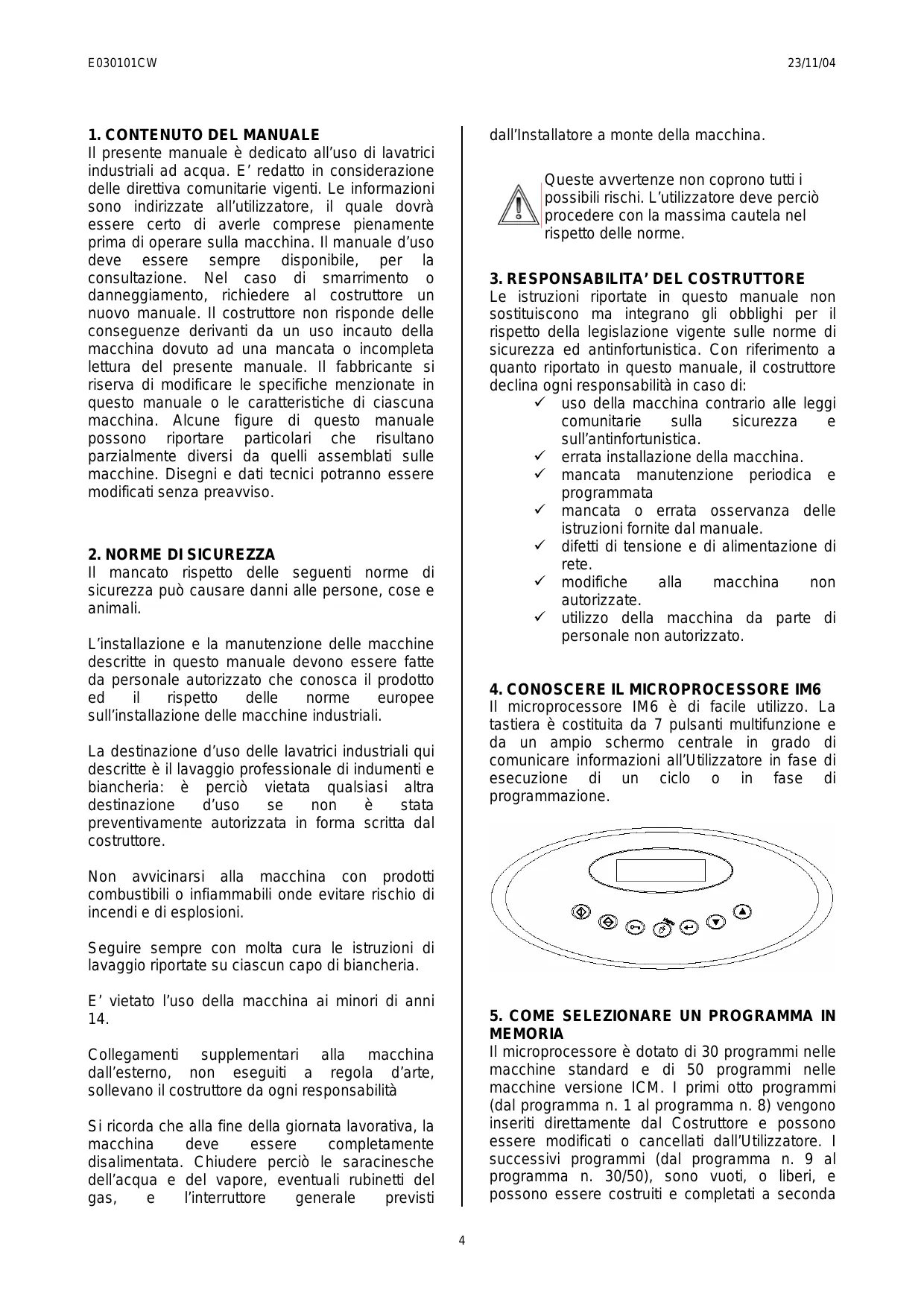 Il microprocessore IM6 è di facile utilizzo. La tastiera è costituita da 7 pulsanti multifunzione e da un ampio schermo centrale in grado di comunicare informazioni all’Utilizzatore in fase di esecuzione di un ciclo o in fase di programmazione. La destinazione d’uso delle lavatrici industriali qui descritte è il lavaggio professionale di indumenti e biancheria: è perciò vietata qualsiasi altra destinazione d’uso non stata preventivamente autorizzata in forma scritta dal costruttore. Non avvicinarsi alla macchina con prodotti combustibili o infiammabili onde evitare rischio di incendi e di esplosioni. Seguire sempre con molta cura le istruzioni di lavaggio riportate su ciascun capo di biancheria. E’ vietato l’uso della macchina ai minori di anni