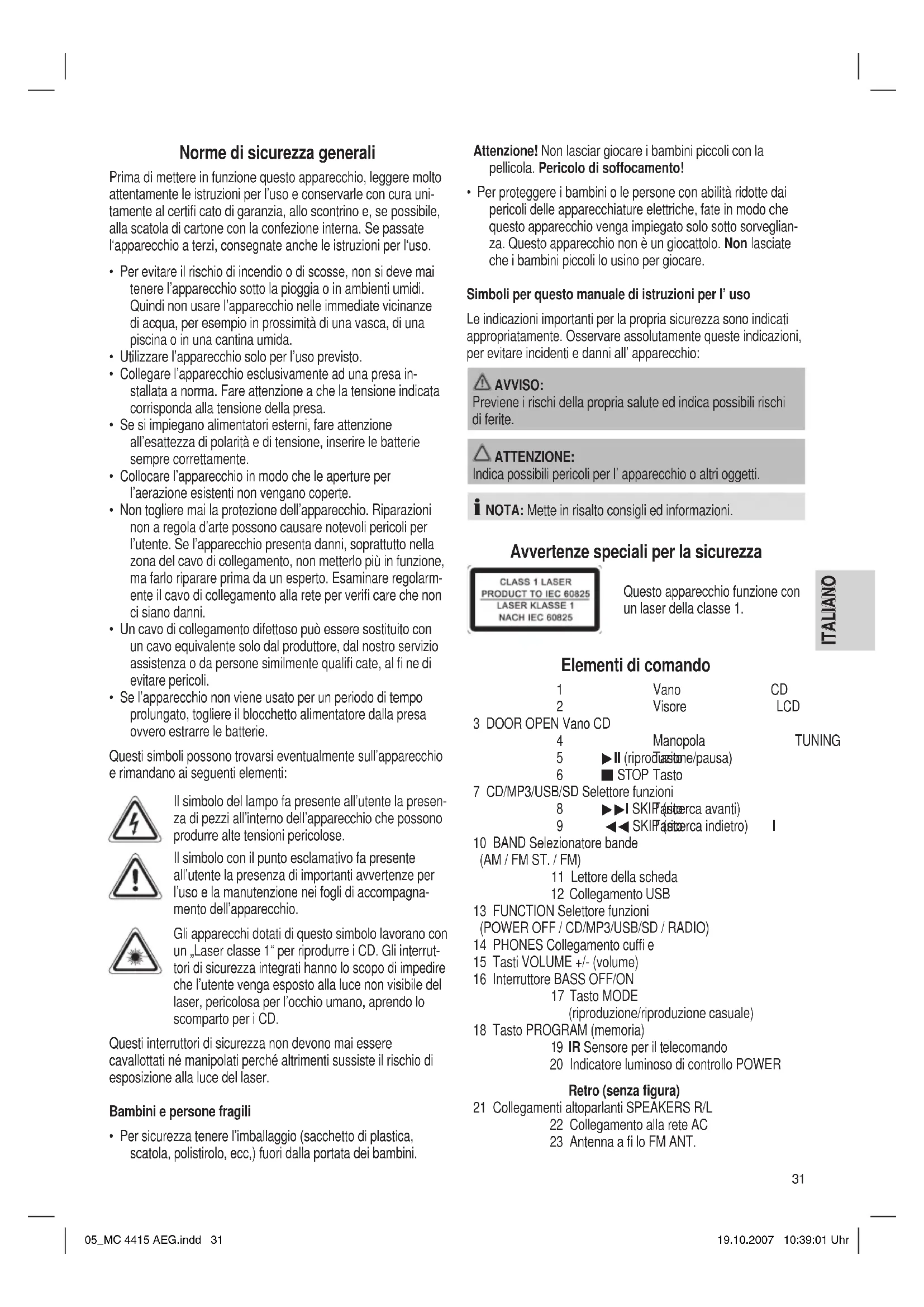 - Prima della messa in funzione, se presente, togliere il dispositivo di sicurezza per il trasporto dal lettore CD. Presa cuffi e (14) Per il funzionamento con cuffi e, usare delle cuffi e con un jack stereo di 3.5 mm da inserire nella presa cuffi e PHONES. Gli altoparlanti si spengono automaticamente. Uso generale NOTA: Alcuni tasti si trovano sia sull’apparecchio che sul teleco- mando. I tasti uguali si riferiscono alla medesima funzione. Volume Con il regolatore VOLUME (15) si può regolare il volume desiderato. BASS OFF/ON (16) Serve per intensifi care o ridurre i suoni bassi. BASS ON = acceso, BASS OFF = spento. Spegnere L’apparecchio è fuori esercizio quando il selettore funzioni (13) è nella posizione POWER OFF. Infi ne staccare la spina. 05_MC 4415 AEG.indd 3205_MC 4415 AEG.indd 32 19.10.2007 10:39:01 Uhr19.10.2007 10:39:01 Uhr33 ITALIANO ITALIANO Collegamento USB (12) Questo apparecchio è stato sviluppato secondo lo standard attu- ale degli sviluppi tecnici nel settore USB. Gran parte dei supporti di memorizzazione USB di ogni tipo che oggigiorno vengono offerti non consentono purtroppo di garantire una compatibilità completa con tutti i supporti di memorizzazione USB. Per questa ragione in rari casi possono presentarsi problemi nella riproduzi- one di supporti di memoria USB. Questo fatto non è dovuto ad un funzionamento scorretto dell’ apparecchio.
