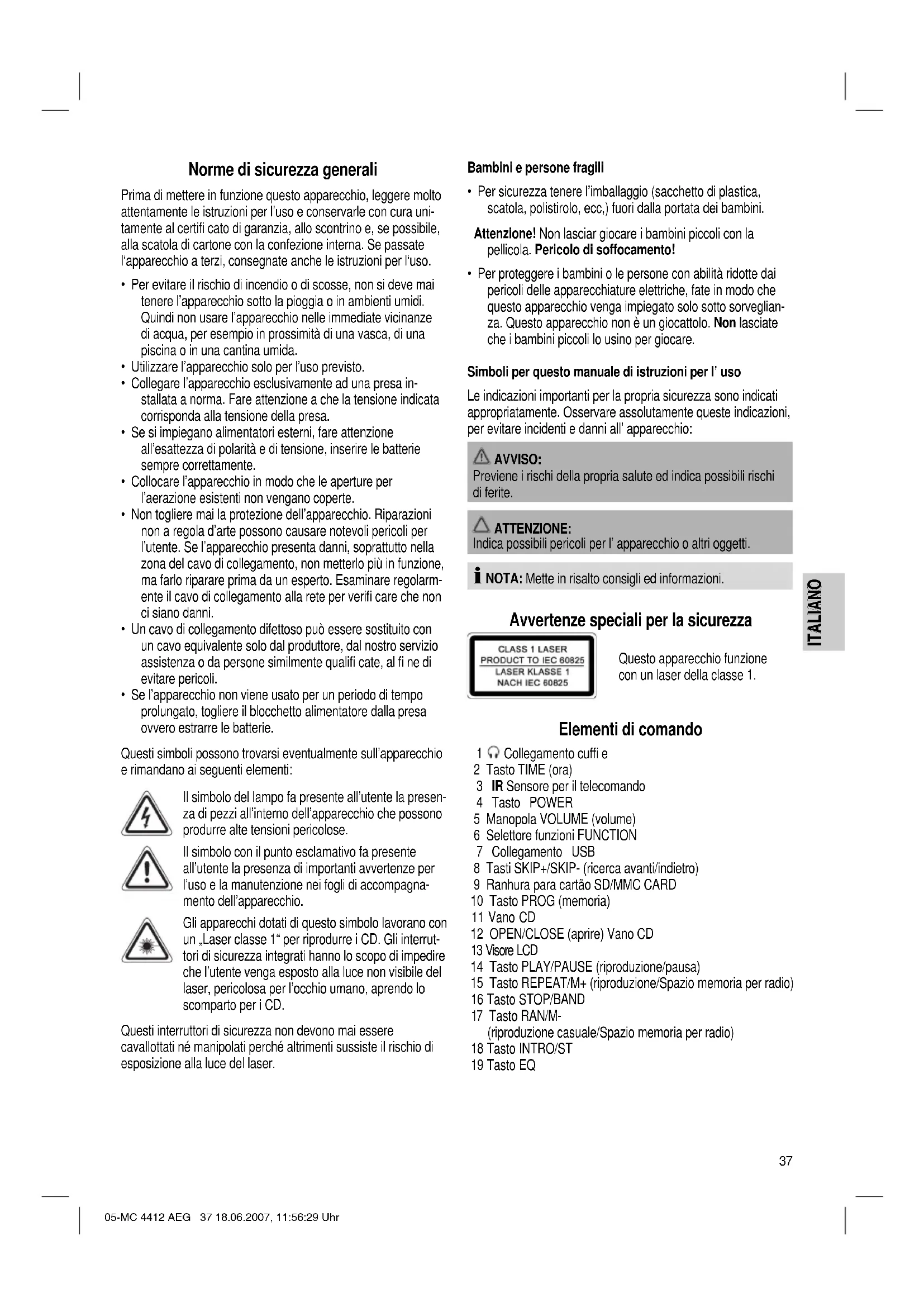 - Per proteggere i bambini o le persone con abilità ridotte dai pericoli delle apparecchiature elettriche, fate in modo che questo apparecchio venga impiegato solo sotto sorveglian- za. Questo apparecchio non è un giocattolo. Non lasciate che i bambini piccoli lo usino per giocare. Simboli per questo manuale di istruzioni per l’ uso Le indicazioni importanti per la propria sicurezza sono indicati appropriatamente. Osservare assolutamente queste indicazioni, per evitare incidenti e danni all’ apparecchio: AVVISO: Previene i rischi della propria salute ed indica possibili rischi di ferite. ATTENZIONE: Indica possibili pericoli per l’ apparecchio o altri oggetti. NOTA: Mette in risalto consigli ed informazioni. Avvertenze speciali per la sicurezza Questo apparecchio funzione con un laser della classe 1. Elementi di comando 1 Collegamento cuffi e 2 Tasto TIME (ora) 3 IR Sensore per il telecomando 4 Tasto POWER 5 Manopola VOLUME (volume) 6 Selettore funzioni FUNCTION 7 Collegamento USB 8 Tasti SKIP+/SKIP- (ricerca avanti/indietro) 9 Ranhura para cartão SD/MMC CARD 10 Tasto PROG (memoria) 11 Vano CD 12 OPEN/CLOSE (aprire) Vano CD 13 Visore LCD 14 Tasto PLAY/PAUSE (riproduzione/pausa) 15 Tasto REPEAT/M+ (riproduzione/Spazio memoria per radio) 16 Tasto STOP/BAND 17 Tasto RAN/M- (riproduzione casuale/Spazio memoria per radio) 18 Tasto INTRO/ST 19 Tasto EQ 05-MC 4412 AEG 37 18.06.2007, 11:56:29 Uhr38 ITALIANO ITALIANO Retro (senza fi gura) 20 Collegamenti altoparlanti SPEAKER R/L 21 Collegamento alla rete AC 22 Antenna a fi lo FM ANT. 23 AM ANT. Collegamento antenna 24 Ingresso AUX 25 Interruttore POWER ON/OFF Telecomando 1 Tasto PLAY/PAUSE (riproduzione/pausa) 2 Tasto STOP 3 Tasti