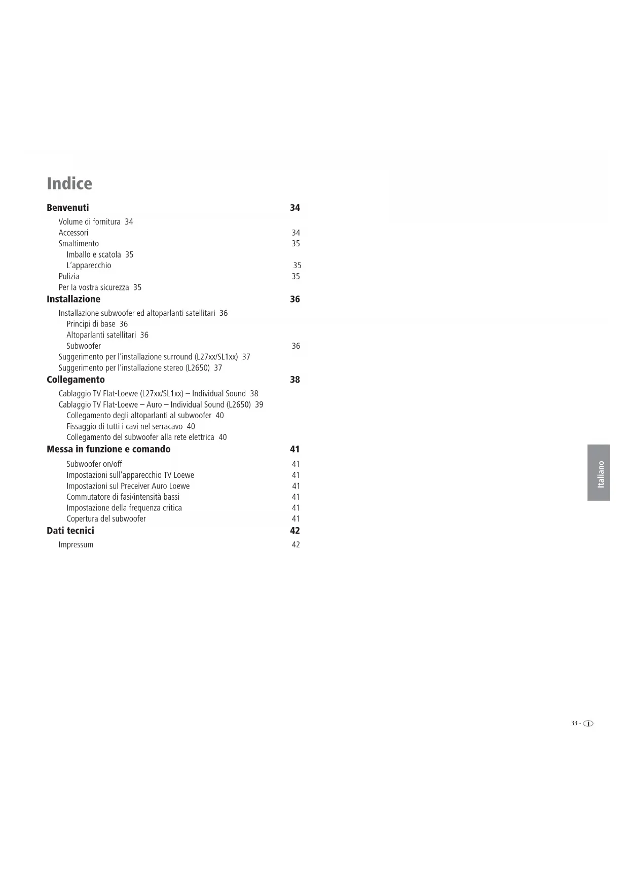 Subwoofer Altoparlanti satellitari Altoparlanti con sup- porto Frontale a sinistra Frontale a destra Surround a sinistra Surround a destra41 - Italiano Messa in funzione e comando Prima di procedere con la messa in funzione e con le impostazioni, assicurarsi che tutti i cavi siano collegati correttamente. Subwoofer on/off L’interruttore ON/OFF g consente di accendere l’impianto di altoparlanti Indivi- dual Sound in posizione “I - ON“. Se il subwoofer è collegato come illustrato a pag. 38-39, non è più necessario accenderlo o spegnerlo separatamente. Dopo che il subwoofer è stato acceso per la prima volta, le funzioni di accensione e spegnimento diventano automa- tiche e sono collegate direttamente all’apparecchio TV Loewe ed al Preceiver Auro Loewe. Impostazioni sull’apparecchio TV Loewe Registrare i nuovi apparecchi come descritto nelle istruzioni per l’uso del proprio apparecchio TV Loewe alla voce “Funzionamento degli apparecchi supplementari” / “Dispositivi esterni”. Impostazioni sul Preceiver Auro Loewe Effettuare le impostazioni necessarie per gli altoparlanti sul Preceiver Auro Loewe, seguendo le istruzioni riportate sul manuale d’uso Auro alla voce “Prima messa in funzione Impostazione del sistema altoparlanti”. Commutatore di fasi/intensità bassi Il commutatore di fasi i “Phase“ ed il regolatore “Bass-Intensity” h consento- no di ottimizzare la riproduzione dei bassi. Consigliamo di procedere nel seguente modo: