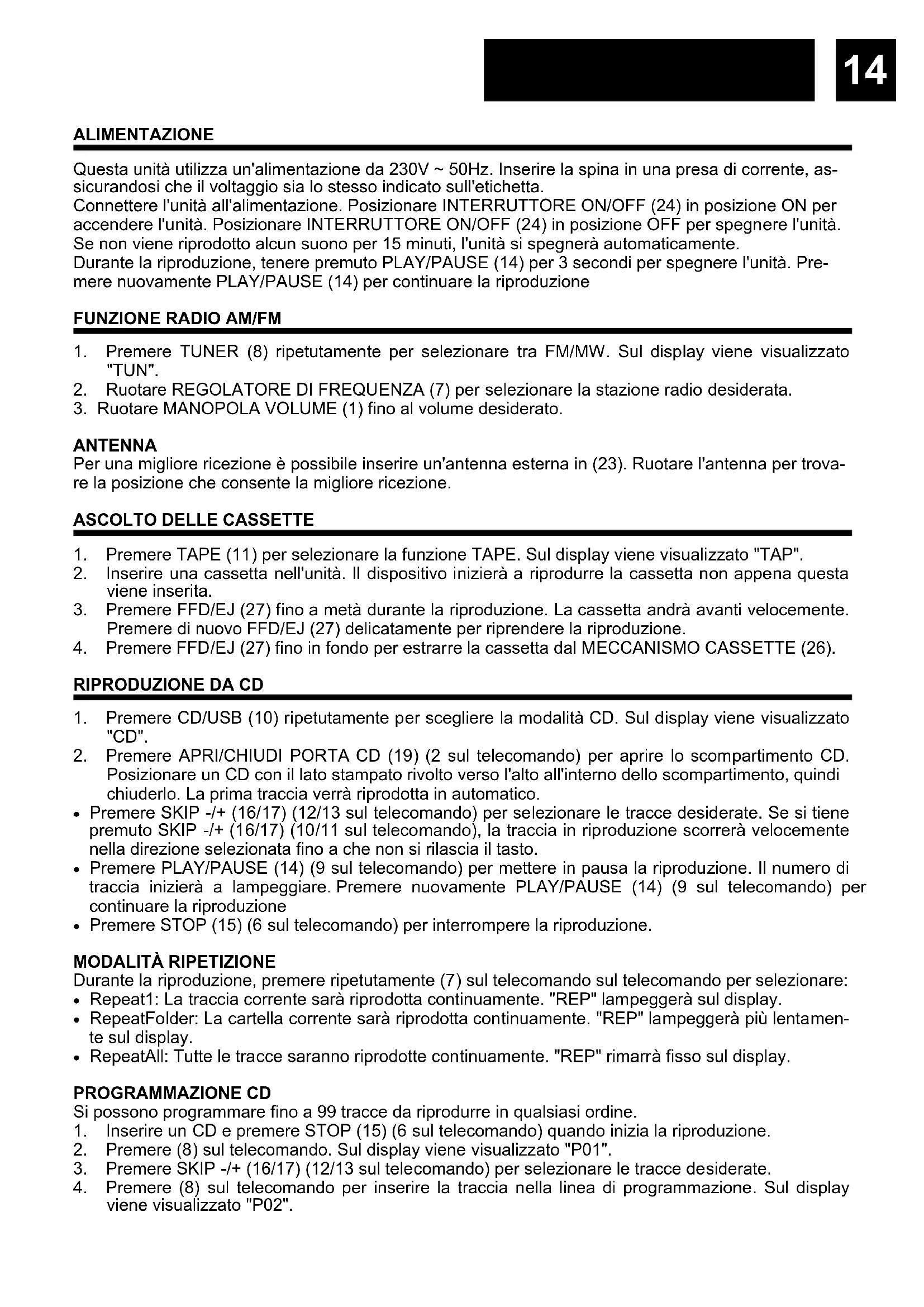 Premere (5) sul telecomando ripetutamente per scegliere la modalità FM / MW / CD/USB / AUX / BLUETOOTH / TAPE / PHONO.14 Italiano ALIMENTAZIONE Questa unità utilizza un'alimentazione da 230V ~ 50Hz. Inserire la spina in una presa di corrente, as- sicurandosi che il voltaggio sia lo stesso indicato sull'etichetta. Connettere l'unità all'alimentazione. Posizionare INTERRUTTORE ON/OFF (24) in posizione ON per accendere l'unità. Posizionare INTERRUTTORE ON/OFF (24) in posizione OFF per spegnere l'unità. Se non viene riprodotto alcun suono per 15 minuti, l'unità si spegnerà automaticamente. Durante la riproduzione, tenere premuto PLAY/PAUSE (14) per 3 secondi per spegnere l'unità. Pre- mere nuovamente PLAY/PAUSE (14) per continuare la riproduzione