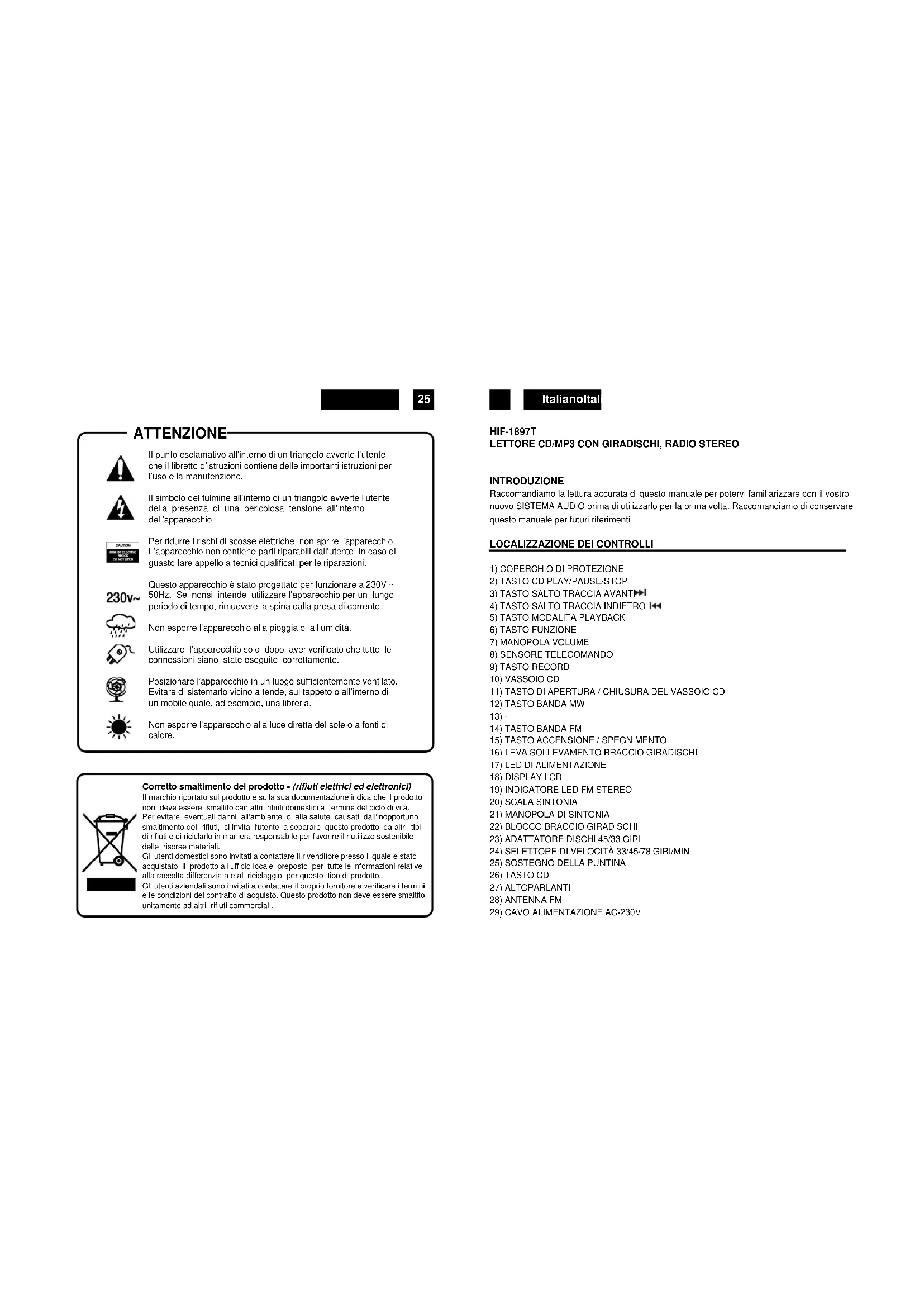 HIF-1897T LETTORE CD/MP3 CON GIRADISCHI, RADIO STEREO INTRODUZIONE Raccomandiamo la lettura accurata di questo manuale per potervi familiarizzare con il vostro nuovo SISTEMA AUDIO prima di utilizzarlo per la prima volta. Raccomandiamo di conservare questo manuale per futuri riferimenti