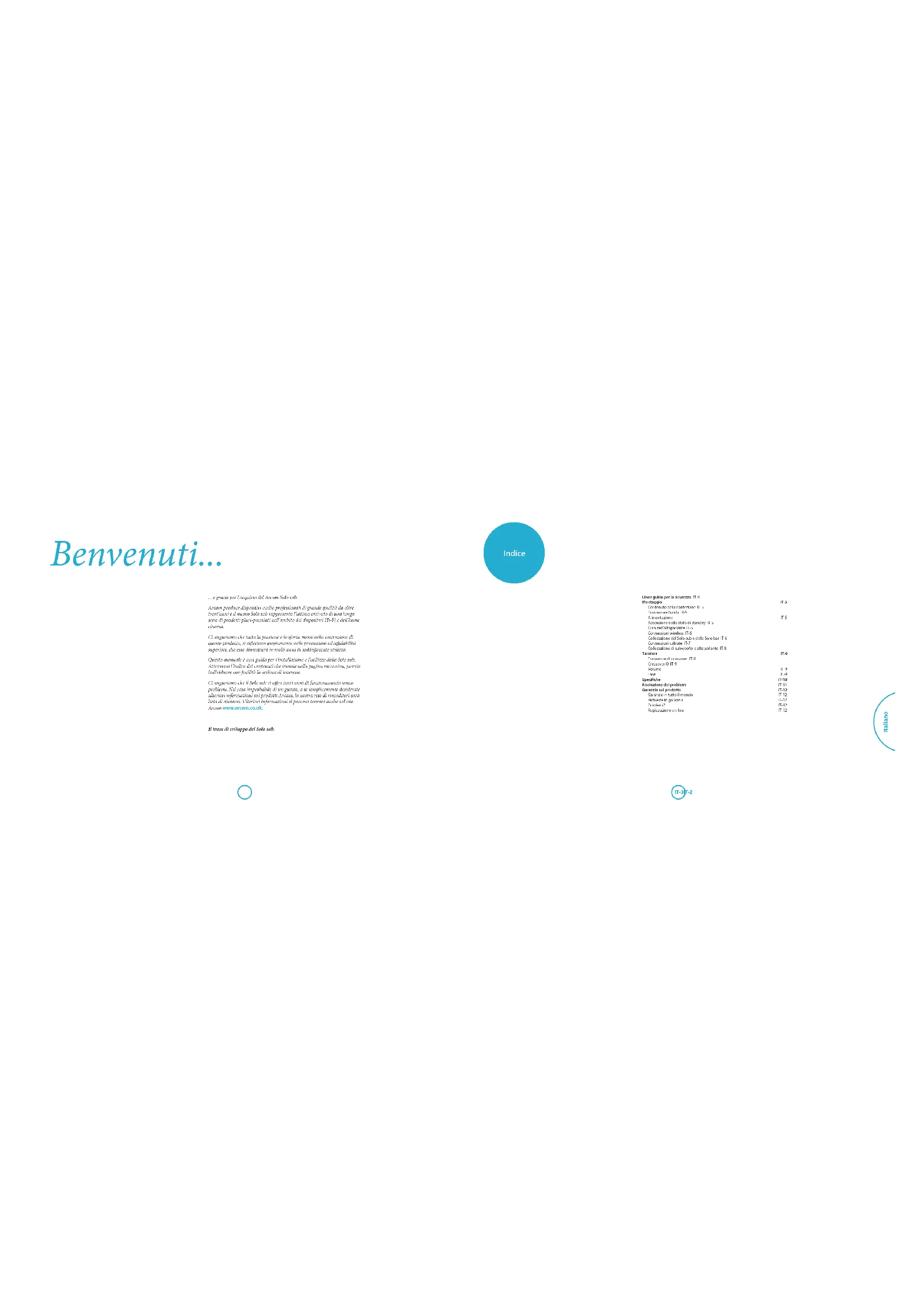 Если дилер Arcam не может ответить на какие-либо вопросы в отношении данного или другого продукта Arcam, обратитесь в отдел технической поддержки компании Arcam, расположенный по нижеуказанному адресу, мы сделаем все возможное, чтобы помочь вам. Arcam Customer Support Department, Unit15, Pembroke Avenue, Waterbeach, CAMBRIDGE, CB25 9QP, Англия или через веб-сайт ww w.arcam.co.uk. Регистрация онлайн Вы можете зарегистрировать ваш продукт онлайн на сайте ww w.arcam.co.uk.Manuale Subwoofer ItalianoIT-3IT-2 Italiano ... e grazie per l'acquisto del Arcam Solo sub. Arcam produce dispositivi audio professionali di grande qualità da oltre trent’anni e il nuovo Solo sub rappresenta l’ultimo arrivato di una lunga serie di prodotti pluri-premiati nell'ambito dei dispositivi Hi-Fi e dell'home cinema. Ci auguriamo che tutta la passione e lo sforzo messi nella costruzione di questo prodotto, si riettano ampiamente nelle prestazioni ed adabilità superiori, che esso dimostrerà in molti anni di soddisfacente utilizzo. Questo manuale è una guida per l'installazione e l'utilizzo della Solo sub. Attraverso l’indice dei contenuti che trovate nella pagina successiva, potrete individuare con facilità la sezione di interesse. Ci auguriamo che il Solo sub vi ora tanti anni di funzionamento senza problemi. Nel caso improbabile di un guasto, o se semplicemente desiderate ulteriori informazioni sui prodotti Arcam, la nostra rete di rivenditori sarà lieta di aiutarvi. Ulteriori informazioni si possono trovare anche sul sito Arcam www.arcam.co.uk. Il team di sviluppo del Solo sub. Indice Linee guida per la sicurezza IT-4 Montaggio IT-5 Contenuto della confezione IT-5 Posizionare l'unità IT-5 Alimentazione IT-5 Accensione dallo stato di standby IT-5 Cura dell'altoparlante IT-5 Connessioni wireless IT-6 Collocazione del Solo sub e della Solo bar IT-6 Connessioni cablate IT-7 Collocazione di subwoofer e altoparlante IT-8 Taratura IT-9 Frequenze di crossover IT-9 Crossover Q IT-9 Volume IT-9 Fase IT-9 Speciche IT-10 Risoluzione dei problemi IT-11 Garanzia sul prodotto IT-12 Garanzia in tutto il mondo IT-12 Richieste in garanzia IT-12 Problemi? IT-12 Registrazione on-line IT-12 Benvenuti...IT-5IT-4 Italiano Linee guida per la sicurezza Montaggio
