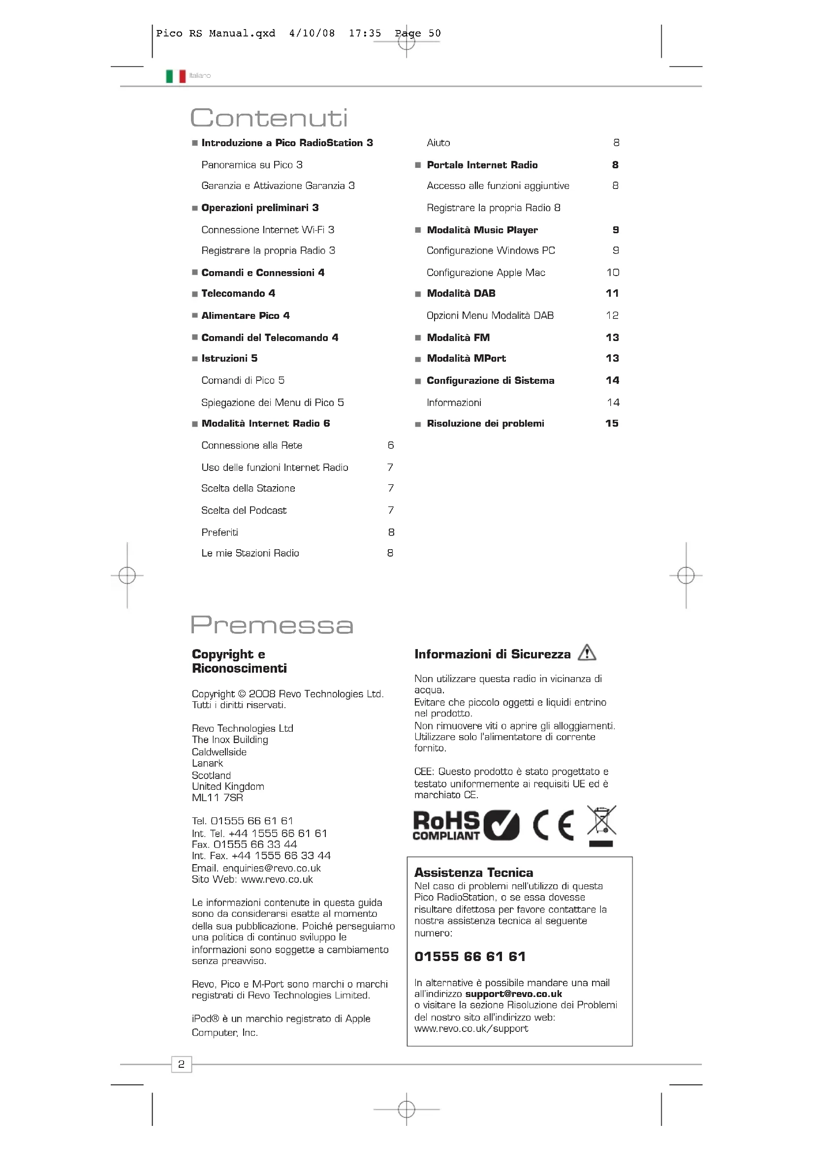 Nel caso di problemi nell'utilizzo di Pico RadioStation per favore leggere attendamente la segunte guida alla voce 'risoluzione dei problemi'. In alternatively si cui visitare la sezione assistenza del sito web Revo [www.revo.co.uk] o chiamare la mia assistenza tecnica al numero 01555 66 61 61.