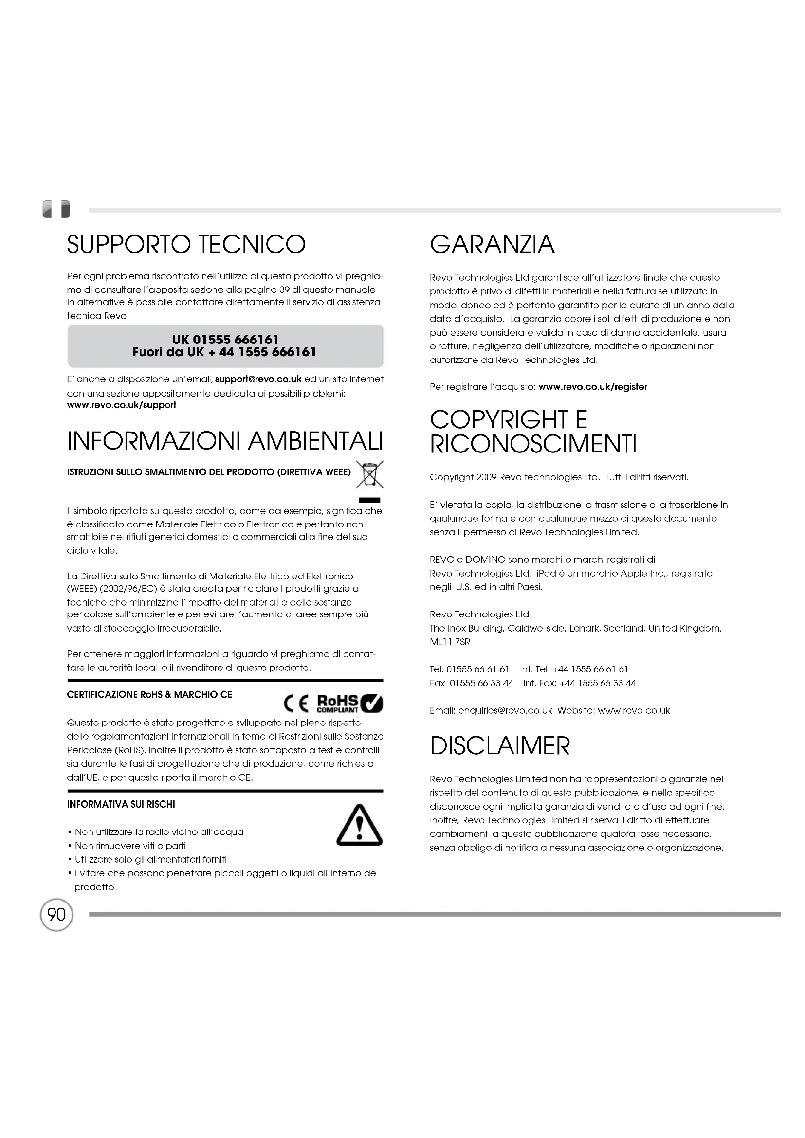- Evitare che possano penetrare piccoli oggetti o liquidi all’interno del prodotto GARANZIA Revo Technologies Ltd garantisce all’utilizzatore finale che questo prodotto è privo di difetti in materiali e nella fattura se utilizzato in modo idoneo ed è pertanto garantito per la durata di un anno dalla data d’acquisto. La garanzia copre i soli difetti di produzione e non può essere considerate valida in caso di danno accidentale, usura o rotture, negligenza dell’utilizzatore, modifiche o riparazioni non autorizzate da Revo Technologies Ltd. Per registrare l’acquisto: www.revo.co.uk/register COPYRIGHT E RICONOSCIMENTI Copyright 2009 Revo technologies Ltd. Tutti i diritti riservati. E’ vietata la copia, la distribuzione la trasmissione o la trascrizione in qualunque forma e con qualunque mezzo di questo documento senza il permesso di Revo Technologies Limited. REVO e DOMINO sono marchi o marchi registrati di Revo Technologies Ltd. iPod è un marchio Apple Inc., registrato negli U.S. ed in altri Paesi. Revo Technologies Ltd The Inox Building, Caldwellside, Lanark, Scotland, United Kingdom, ML11 7SR Tel: 01555 66 61 61 Int. Tel: +44 1555 66 61 61 Fax: 01555 66 33 44 Int. Fax: +44 1555 66 33 44 Email: enquiries@revo.co.uk Website: www.revo.co.uk DISCLAIMER Revo Technologies Limited non ha rappresentazioni o garanzie nel rispetto del contenuto di questa pubblicazione, e nello specifico disconosce ogni implicita garanzia di vendita o d’uso ad ogni fine. Inoltre, Revo Technologies Limited si riserva il diritto di effettuare cambiamenti a questa pubblicazione qualora fosse necessario, senza obbligo di notifica a nessuna associazione o organizzazione. 90CONTENTS 90 Supporto Tecnico 90 Informazioni Ambientali 90 Garanzia 90 Copyright e Riconoscimenti 90 Disclaimer 91 Benvenuti / Estrazione Imballo 92 Anatomia 93 Telecomando 94 Alimentazione 94 Set-Up 95 Controllo Domino/ Struttura Menu