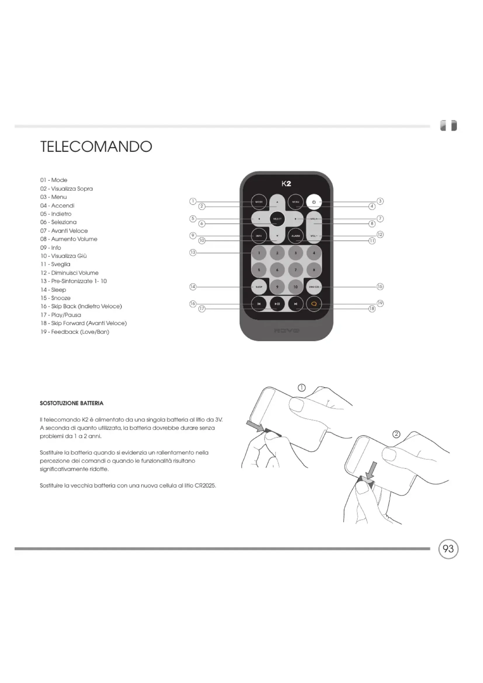 Il telecomando K2 è alimentato da una singola batteria al litio da 3V. A seconda di quanto utilizzata, la batteria dovrebbe durare nella problemi da 1 a 2 anni.