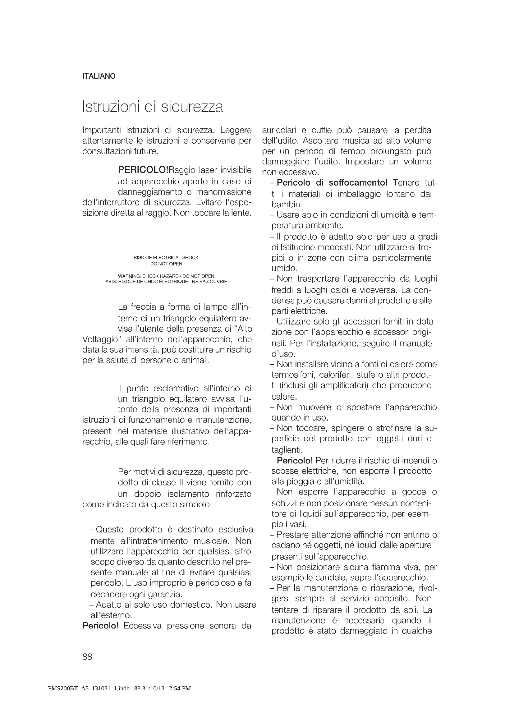 Istruzioni di sicurezza Importanti istruzioni di sicurezza. Leggere attentamente le istruzioni e conservarle per consultazioni future. PERICOLO!Raggio laser invisibile ad apparecchio aperto in caso di danneggiamento o manomissione dell’interruttore di sicurezza. Evitare l’espo- sizione diretta al raggio. Non toccare la lente. CAUTION RISK OF ELECTRICAL SHOCKDO NOT OPENWARNING: SHOCK HAZARD - DO NOT OPENAVIS: RISQUE DE CHOC ÉLECTRIQUE - NE PAS OUVRIR La freccia a forma di lampo all’in- terno di un triangolo equilatero av- visa l’utente della presenza di “Alto Voltaggio” all’interno dell’apparecchio, che data la sua intensità, può costituire un rischio per la salute di persone o animali. Il punto esclamativo all’interno di un triangolo equilatero avvisa l’u- tente della presenza di importanti istruzioni di funzionamento e manutenzione, presenti nel materiale illustrativo dell’appa- recchio, alle quali fare riferimento. Per motivi di sicurezza, questo pro- dotto di classe II viene fornito con un doppio isolamento rinforzato come indicato da questo simbolo. – Questo prodotto è destinato esclusiva- mente all’intrattenimento musicale. Non utilizzare l’apparecchio per qualsiasi altro scopo diverso da quanto descritto nel pre- sente manuale al fine di evitare qualsiasi pericolo. L’uso improprio è pericoloso e fa decadere ogni garanzia. – Adatto al solo uso domestico. Non usare all’esterno. Pericolo! Eccessiva pressione sonora da auricolari e cue può causare la perdita dell’udito. Ascoltare musica ad alto volume per un periodo di tempo prolungato può danneggiare l’udito. Impostare un volume non eccessivo. – Pericolo di soocamento! Tenere tut- ti i materiali di imballaggio lontano dai bambini. – Usare solo in condizioni di umidità e tem- peratura ambiente. – Il prodotto è adatto solo per uso a gradi di latitudine moderati. Non utilizzare ai tro- pici o in zone con clima particolarmente umido. – Non trasportare l’apparecchio da luoghi freddi a luoghi caldi e viceversa. La con- densa può causare danni al prodotto e alle parti elettriche. – Utilizzare solo gli accessori forniti in dota- zione con l’apparecchio e accessori origi- nali. Per l’installazione, seguire il manuale d’uso. – Non installare vicino a fonti di calore come termosifoni, caloriferi, stufe o altri prodot- ti (inclusi gli amplificatori) che producono calore. – Non muovere o spostare l’apparecchio quando in uso. – Non toccare, spingere o strofinare la su- perficie del prodotto con oggetti duri o taglienti. – Pericolo! Per ridurre il rischio di incendi o scosse elettriche, non esporre il prodotto alla pioggia o all’umidità. – Non esporre l’apparecchio a gocce o schizzi e non posizionare nessun conteni- tore di liquidi sull’apparecchio, per esem- pio i vasi. – Prestare attenzione anché non entrino o cadano né oggetti, né liquidi dalle aperture presenti sull’apparecchio. – Non posizionare alcuna fiamma viva, per esempio le candele, sopra l’apparecchio. – Per la manutenzione o riparazione, rivol- gersi sempre al servizio apposito. Non tentare di riparare il prodotto da soli. La manutenzione è necessaria quando il prodotto è stato danneggiato in qualche PMS200BT_A5_131031_1.indb 88 31/10/13 2:54 PM89 ITALIANO modo, per esempio se si rovina il cavo di alimentazione o la spina, se si è bagnato il prodotto, se degli oggetti sono caduti nell’apparecchio, se la custodia si è dan- neggiata, se il prodotto è stato esposto a pioggia o umidità, se non funziona normal- mente o se è caduto a terra. – Prima di collegare il prodotto ad una pre- sa di corrente, assicurarsi che la tensione indicata sul prodotto corrisponda alla rete locale. – Per evitare situazioni pericolose, far so- stituire il cavo di alimentazione, se risulta danneggiato, dal fornitore o dal relativo servizio di riparazione o da una persona ugualmente qualificata. – Controllare regolarmente se il cavo di ali- mentazione, presenta danneggiamenti visibili. Se danneggiato, non accendere l’apparecchio e staccare immediatamente la spina. – Posizionare il cavo di alimentazione e, se necessario, una prolunga, in modo tale da non inciamparci o tirarla. Non lasciar pen- dere il cavo di alimentazione. – Non schiacciare, piegare o tirare il cavo di alimentazione in prossimità di bordi o an- goli vivi. – La presa di corrente può essere usata come interruttore generale, assicurarsi che la presa sia sempre facilmente accessibile. Per scollegare completamente l’alimenta- zione, scollegare la spina dalla presa. – Il prodotto potrebbe non funzionare cor- rettamente o non reagire all’operazione di qualsiasi controllo a causa di scariche elettrostatiche. Spegnere e scollegare il prodotto; ricollegare dopo pochi secondi. – Non calpestare o schiacciare il cavo di alimentazione specialmente in corrispon- denza della spina, così che non fuoriesca dalla propria sede sull’apparecchio. – Non staccare mai la spina tirandola del cavo di alimentazione o con le mani bagnate. – Scollegare la spina di alimentazione in caso di errori durante l’uso, durante tem- porali, prima della pulizia e quando non si utilizza il prodotto per un periodo di tempo prolungato. – Pericolo! Prima della pulizia, spegnere il prodotto e scollegare la spina d’alimenta- zione dalla presa di corrente. – Quando il prodotto si è deteriorato, stac- care la spina dalla presa di corrente ed infine tagliare in due il cavo. – Attenzione! Se le batterie vengono so- stituite in maniera errata vige il pericolo di esplosioni. Sostituire le batterie solamente con lo stesso tipo, o con un tipo equiva- lente di batterie. – Cambiare sempre tutte le batterie. Non mischiare batterie vecchie e batterie nuove o batterie in diversi stati di carica. – Assicurarsi che le batterie siano inserite correttamente. Fare attenzione alla polari- tà positiva (+) / negativa (-) delle batterie riportate sul vano batterie.