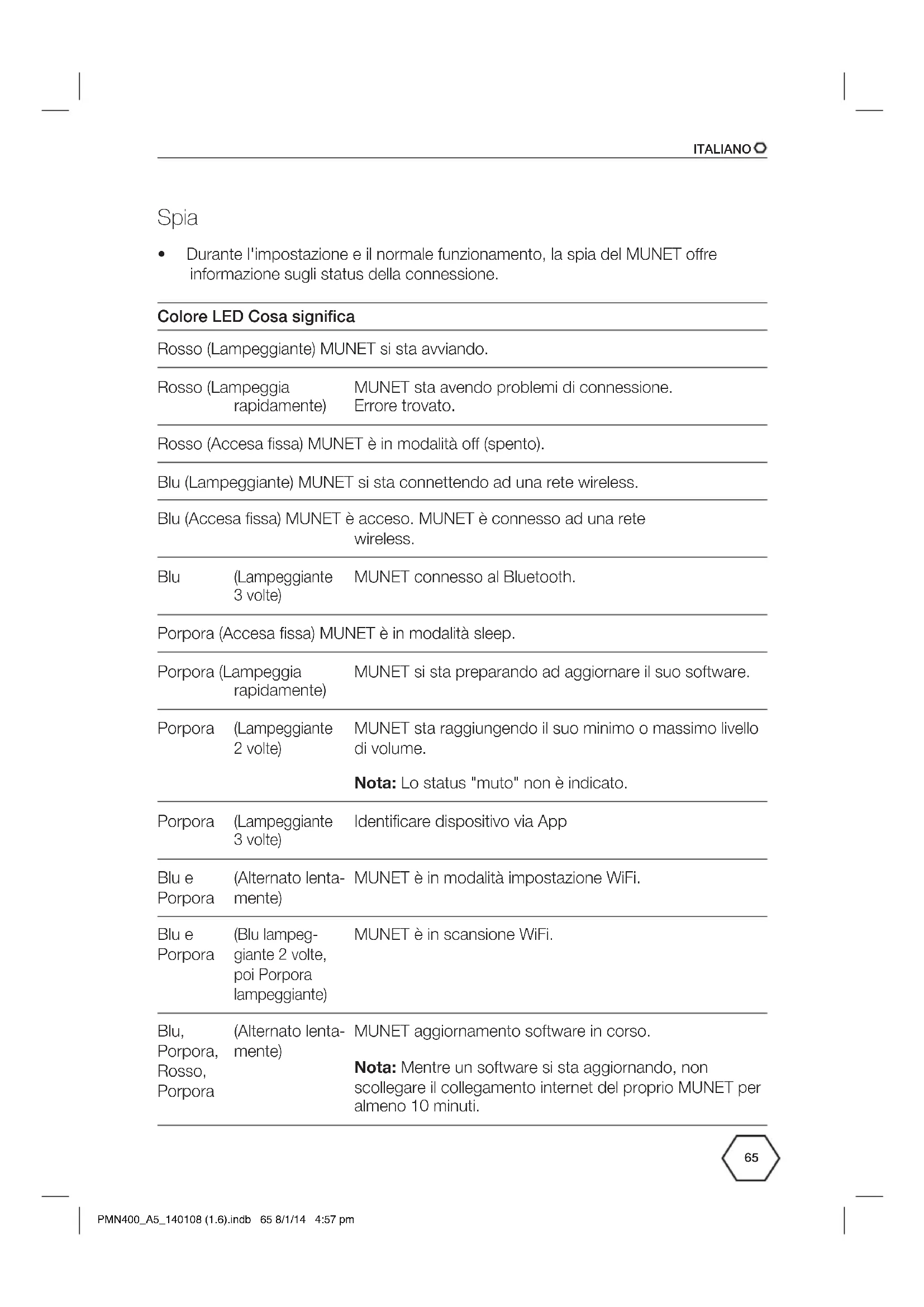 - Durante l'impostazione e il normale funzionamento, la spia del MUNET ore informazione sugli status della connessione. Colore LED Cosa significa Rosso (Lampeggiante) MUNET si sta avviando. Rosso (Lampeggia rapidamente) MUNET sta avendo problemi di connessione. Errore trovato. Rosso (Accesa fissa) MUNET è in modalità o (spento). Blu (Lampeggiante) MUNET si sta connettendo ad una rete wireless. Blu (Accesa fissa) MUNET è acceso. MUNET è connesso ad una rete wireless. Blu (Lampeggiante 3 volte) MUNET connesso al Bluetooth. Porpora (Accesa fissa) MUNET è in modalità sleep. Porpora (Lampeggia rapidamente) MUNET si sta preparando ad aggiornare il suo software. Porpora (Lampeggiante 2 volte) MUNET sta raggiungendo il suo minimo o massimo livello di volume. Nota: Lo status "muto" non è indicato. Porpora (Lampeggiante 3 volte) Identificare dispositivo via App Blu e Porpora (Alternato lenta- mente) MUNET è in modalità impostazione WiFi. Blu e Porpora (Blu lampeg- giante 2 volte, poi Porpora lampeggiante) MUNET è in scansione WiFi. Blu, Porpora, Rosso, Porpora (Alternato lenta- mente) MUNET aggiornamento software in corso. Nota: Mentre un software si sta aggiornando, non scollegare il collegamento internet del proprio MUNET per almeno 10 minuti. PMN400_A5_140108 (1.6).indb 65 8/1/14 4:57 pmITALIANO