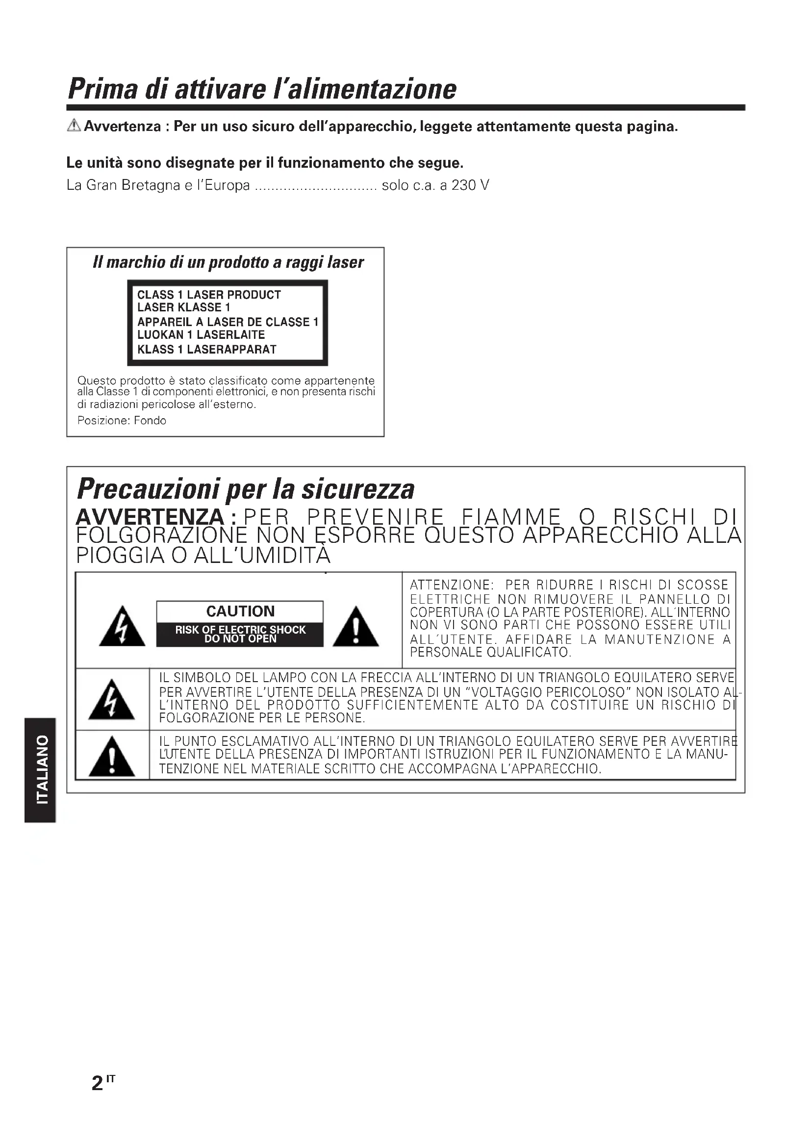 ITALIANO Prima di attivare l’alimentazione Avvertenza : Per un uso sicuro dell’apparecchio, leggete attentamente questa pagina. Le unità sono disegnate per il funzionamento che segue. La Gran Bretagna e l’Europa .............................. solo c.a. a 230 V IL PUNTO ESCLAMATIVO ALL’INTERNO DI UN TRIANGOLO EQUILATERO SERVE PER AVVERTIREL’ U TENTE DELLA PRESENZA DI IMPORTANTI ISTRUZIONI PER IL FUNZIONAMENTO E LA MANU-TENZIONE NEL MATERIALE SCRITTO CHE ACCOMPAGNA L’APPARECCHIO.IL SIMBOLO DEL LAMPO CON LA FRECCIA ALL’INTERNO DI UN TRIANGOLO EQUILATERO SERVEPER AVVERTIRE L’UTENTE DELLA PRESENZA DI UN “VOLTAGGIO PERICOLOSO” NON ISOLATO AL-L’INTERNO DEL PRODOTTO SUFFICIENTEMENTE ALTO DA COSTITUIRE UN RISCHIO DIFOLGORAZIONE PER LE PERSONE.ATTENZIONE: PER RIDURRE I RISCHI DI SCOSSEELETTRICHE NON RIMUOVERE IL PANNELLO DICOPERTURA (O LA PARTE POSTERIORE). ALL´INTERNONON VI SONO PARTI CHE POSSONO ESSERE UTILIALL´UTENTE. AFFIDARE LA MANUTENZIONE APERSONALE QUALIFICATO. Precauzioni per la sicurezza AVVERTENZA : PER PREVENIRE FIAMME O RISCHI DI