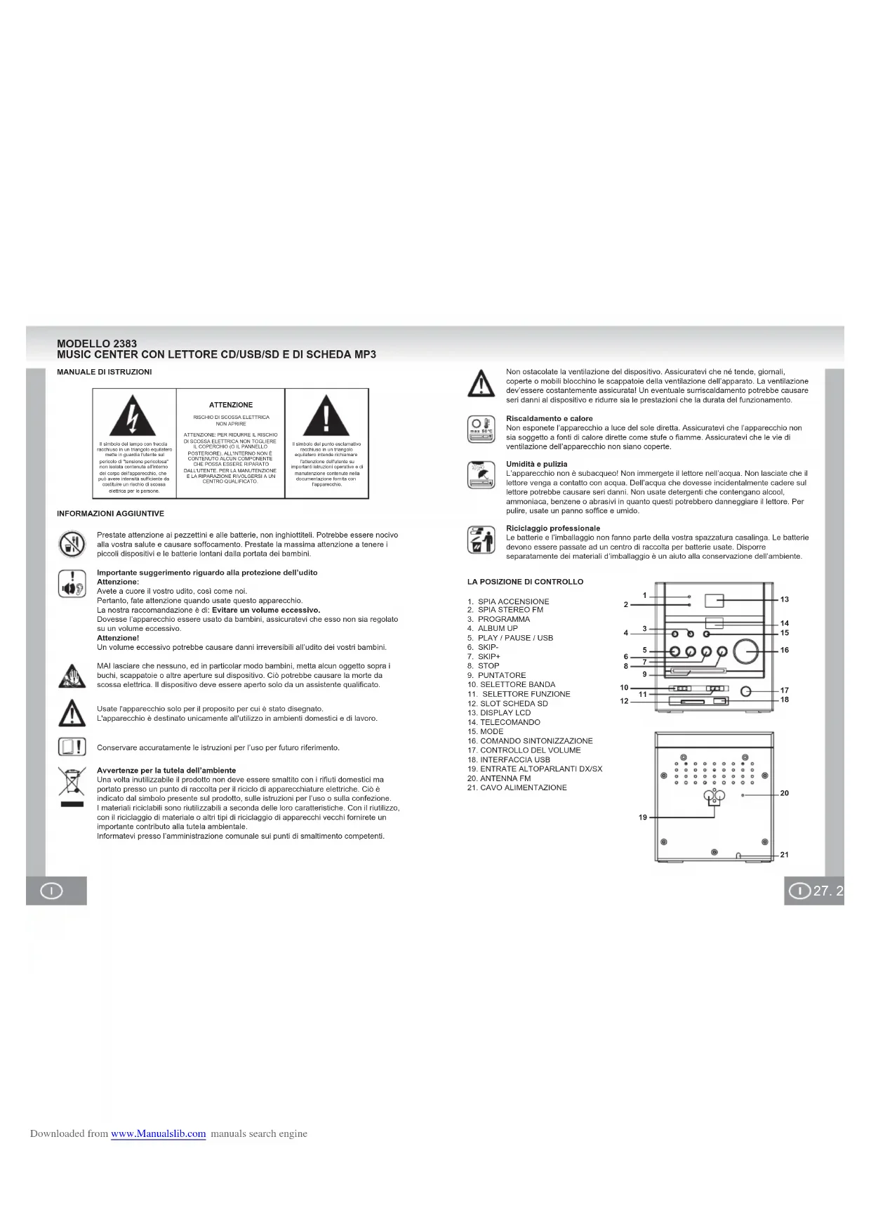 Il simbolo del lampo con freccia racchiuso in un triangolo equilatero mette in guardia l'utente sul pericolo di "tensione pericolosa" non isolata contenuta all'interno del corpo dell'apparecchio, che può avere intensità sufficiente da costituire un rischio di scossa elettrica per le persone.Il simbolo del punto esclamativo racchiuso in un triangolo equilatero intende richiamare l'attenzione dell'utente su importanti istruzioni operative e di manutenzione contenute nella documentazione fornita con l'apparecchio.ATTENZIONERISCHIO DI SCOSSA ELETTRICA NON APRIREATTENZIONE: PER RIDURRE IL RISCHIO DI SCOSSA ELETTRICA NON TOGLIERE IL COPERCHIO (O IL PANNELLO POSTERIORE). ALL'INTERNO NON È CONTENUTO ALCUN COMPONENTE CHE POSSA ESSERE RIPARATO DALL'UTENTE. PER LA MANUTENZIONE E LA RIPARAZIONE RIVOLGERSI A UN CENTRO QUALIFICATO. MODELLO 2383 MUSIC CENTER CON LETTORE CD/USB/SD E DI SCHEDA MP3 Non ostacolate la ventilazione del dispositivo. Assicuratevi che né tende, giornali, coperte o mobili blocchino le scappatoie della ventilazione dell’apparato. La ventilazione dev’essere costantemente assicurata! Un eventuale surriscaldamento potrebbe causare seri danni al dispositivo e ridurre sia le prestazioni che la durata del funzionamento.Usate l'apparecchio solo per il proposito per cui è stato disegnato.L'apparecchio è destinato unicamente all'utilizzo in ambienti domestici e di lavoro.Conservare accuratamente le istruzioni per l’uso per futuro riferimento.Avvertenze per la tutela dell’ambienteUna volta inutilizzabile il prodotto non deve essere smaltito con i rifiuti domestici ma portato presso un punto di raccolta per il riciclo di apparecchiature elettriche. Ciò è indicato dal simbolo presente sul prodotto, sulle istruzioni per l’uso o sulla confezione. I materiali riciclabili sono riutilizzabili a seconda delle loro caratteristiche. Con il riutilizzo, con il riciclaggio di materiale o altri tipi di riciclaggio di apparecchi vecchi fornirete un importante contributo alla tutela ambientale.Informatevi presso l’amministrazione comunale sui punti di smaltimento competenti.MAI lasciare che nessuno, ed in particolar modo bambini, metta alcun oggetto sopra i buchi, scappatoie o altre aperture sul dispositivo. Ciò potrebbe causare la morte da scossa elettrica. Il dispositivo deve essere aperto solo da un assistente qualificato.Riscaldamento e caloreNon esponete l’apparecchio a luce del sole diretta. Assicuratevi che l’apparecchio non sia soggetto a fonti di calore dirette come stufe o fiamme. Assicuratevi che le vie di ventilazione dell’apparecchio non siano coperte.Umidità e puliziaL’apparecchio non è subacqueo! Non immergete il lettore nell’acqua. Non lasciate che il lettore venga a contatto con acqua. Dell’acqua che dovesse incidentalmente cadere sul lettore potrebbe causare seri danni. Non usate detergenti che contengano alcool, ammoniaca, benzene o abrasivi in quanto questi potrebbero danneggiare il lettore. Per pulire, usate un panno soffice e umido.Prestate attenzione ai pezzettini e alle batterie, non inghiottiteli. Potrebbe essere nocivo alla vostra salute e causare soffocamento. Prestate la massima attenzione a tenere i piccoli dispositivi e le batterie lontani dalla portata dei bambini.Importante suggerimento riguardo alla protezione dell’uditoAttenzione:Avete a cuore il vostro udito, così come noi.Pertanto, fate attenzione quando usate questo apparecchio.La nostra raccomandazione è di: Evitare un volume eccessivo.Dovesse l’apparecchio essere usato da bambini, assicuratevi che esso non sia regolato su un volume eccessivo.Attenzione!Un volume eccessivo potrebbe causare danni irreversibili all’udito dei vostri bambini.Riciclaggio professionaleLe batterie e l’imballaggio non fanno parte della vostra spazzatura casalinga. Le batterie devono essere passate ad un centro di raccolta per batterie usate. Disporre separatamente dei materiali d’imballaggio è un aiuto alla conservazione dell’ambiente.MANUALE DI ISTRUZIONIINFORMAZIONI AGGIUNTIVELA POSIZIONE DI CONTROLLO1. SPIA ACCENSIONE2. SPIA STEREO FM3. PROGRAMMA4. ALBUM UP5. PLAY / PAUSE / USB6. SKIP-7. SKIP+8. STOP9. PUNTATORE 10. SELETTORE BANDA11. SELETTORE FUNZIONE12. SLOT SCHEDA SD13. DISPLAY LCD14. TELECOMANDO15. MODE16. COMANDO SINTONIZZAZIONE17. CONTROLLO DEL VOLUME18. INTERFACCIA USB19. ENTRATE ALTOPARLANTI DX/SX20. ANTENNA FM21. CAVO ALIMENTAZIONE Downloaded from www.Manualslib.com manuals search engine29. 28.