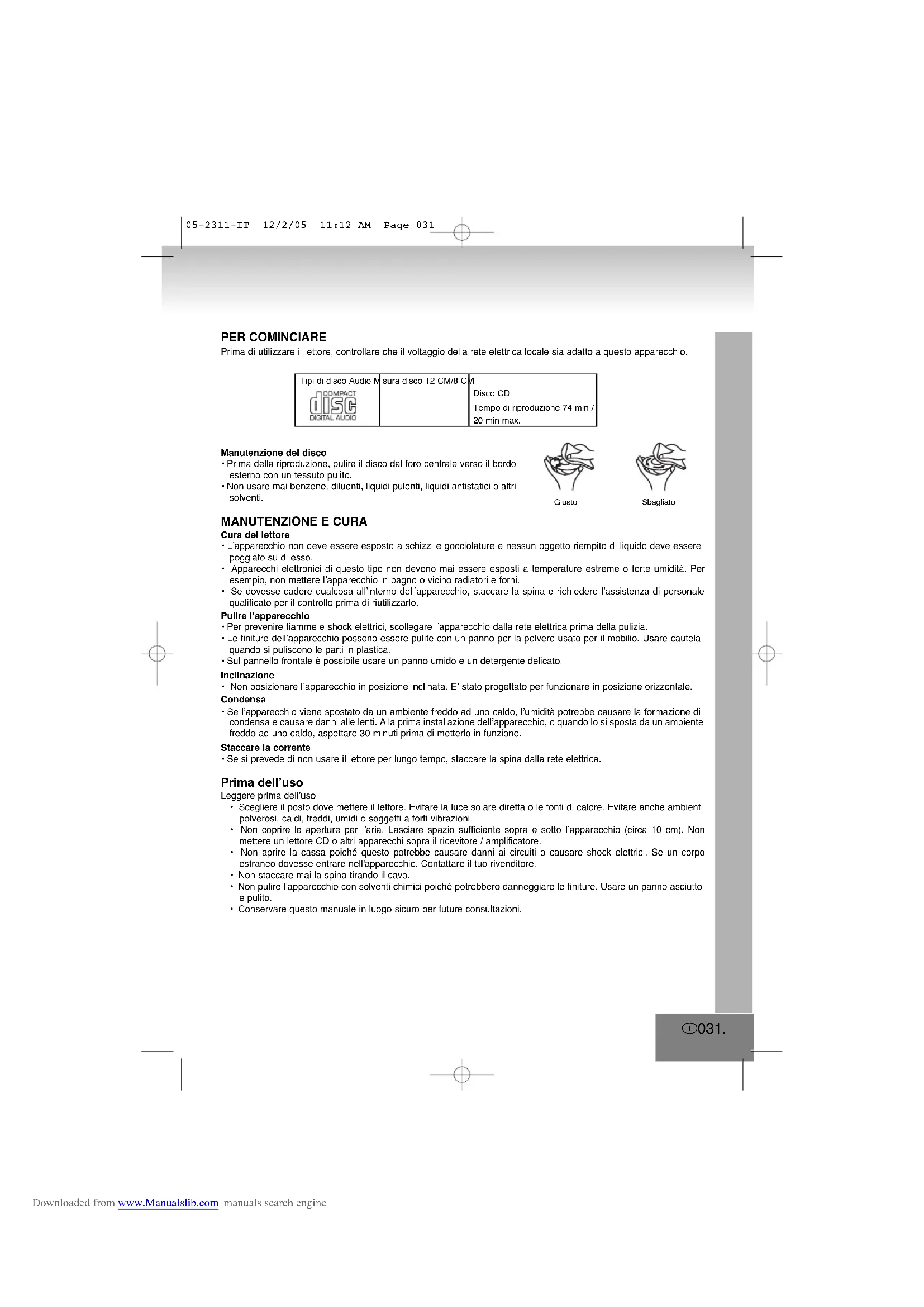04-2311-HU 12/2/05 11:13 AM Page 030 Downloaded from www.Manualslib.com manuals search enginePER COMINCIARE Prima di utilizzare il lettore, controllare che il voltaggio della rete elettrica locale sia adatto a questo apparecchio. Manutenzione del disco• Prima della riproduzione, pulire il disco dal foro centrale verso il bordoesterno con un tessuto pulito.• Non usare mai benzene, diluenti, liquidi pulenti, liquidi antistatici o altrisolventi.